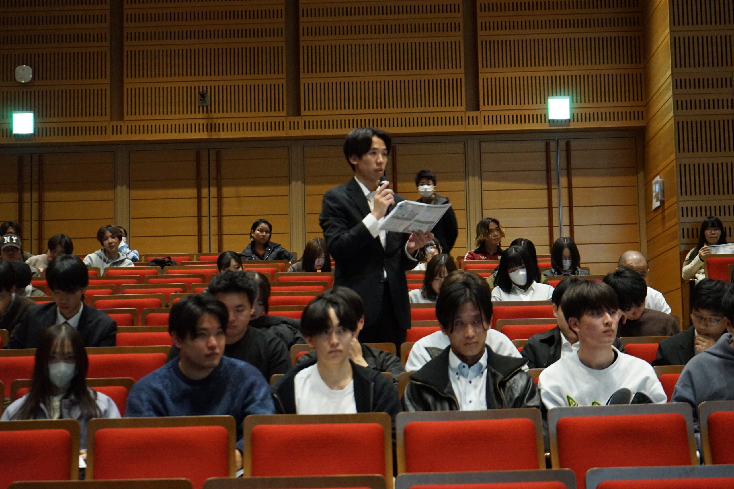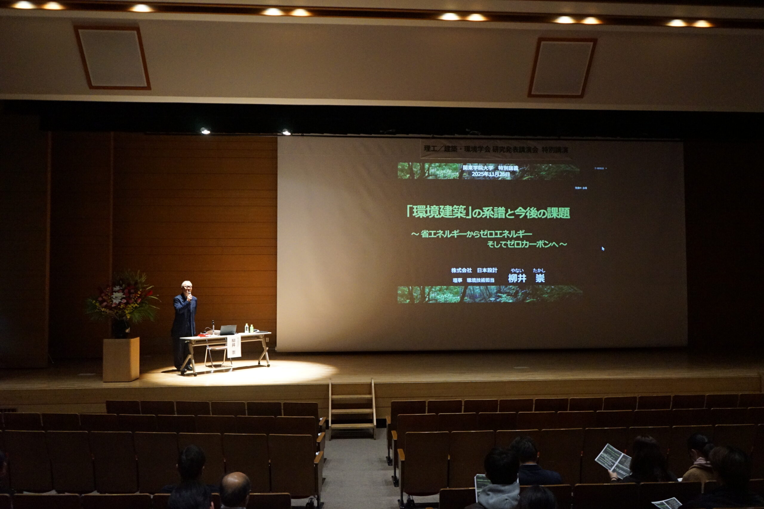 特別講演は午後、ベンネットホールにて行われました。株式会社日本設計理事(環境技術担当)である柳井崇氏をお迎えして、『「環境建築」の系譜と今後の課題』と題してご講演をいただきました。多くの学生が参加し、盛況となりました。