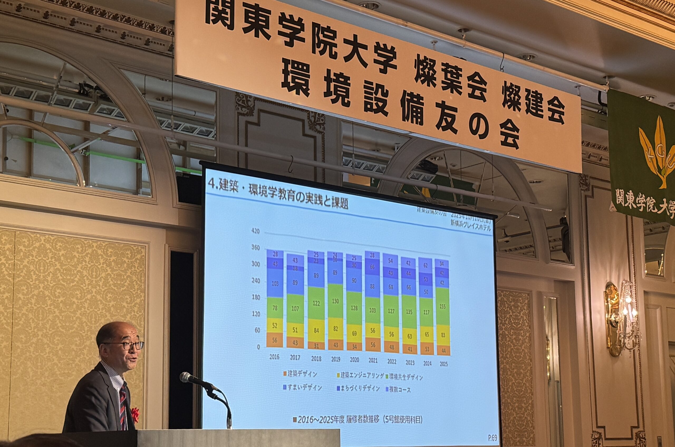 第一部では、関東学院大学建築・環境学部の大塚雅之教授と山口温学部長より、「関東学院大学 建築・環境学部 創設から未来にむけて」と題した基調講演が行われました。講演では、本学部が歩んできた歴史やこれまでの取り組みが紹介されるとともに、建築・環境分野を取り巻く社会状況の変化や、今後本学部が目指す教育・研究の方向性に関する富んだお話がありました。参加者にとって、本学部の過去・現在・そして未来を見つめる貴重な機会となりました。