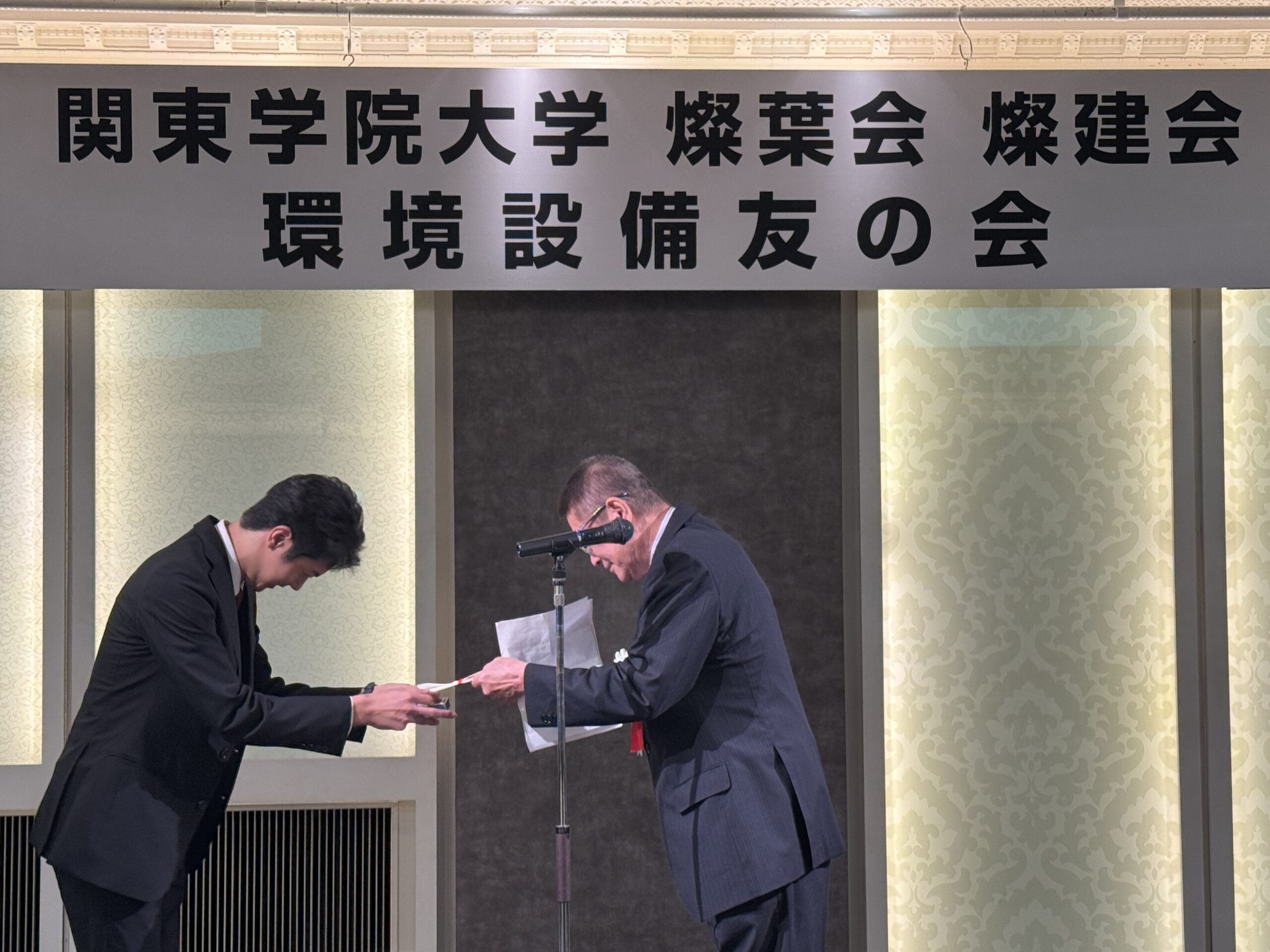 また、燦建会の小林忠夫会長より、関東学院大学建築・環境学部の『Sustainable Design Review in Spring 2025』において大変優れた作品を発表し、燦建会賞に選出された4年生・板野泰樹さんへ賞状と賞品が贈られました。