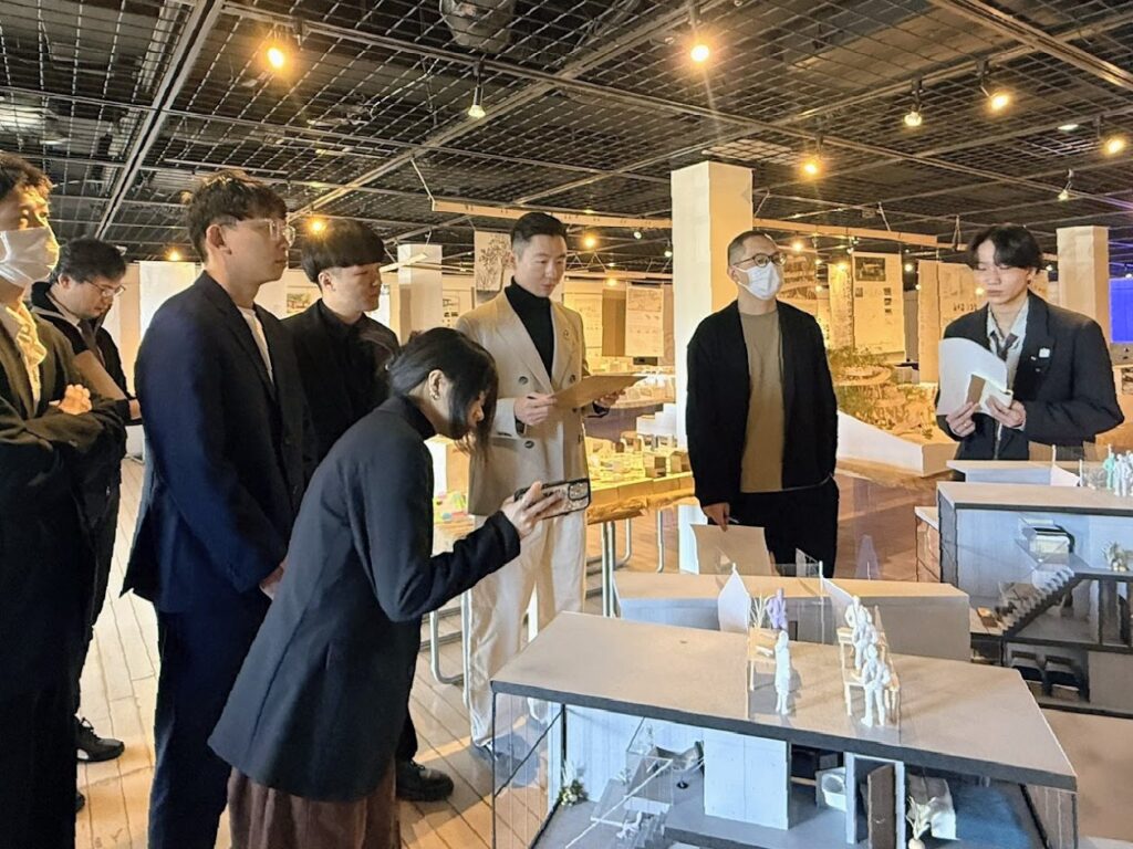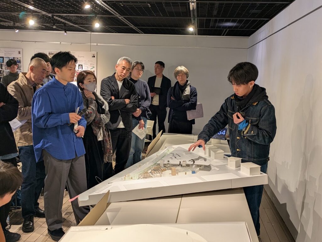 このイベントは,教員と学生が共に関東学院大学の建築・環境教育の全体像を見つめ直すと同時に,上級生,下級生の作品発表を通して創造的な刺激を受け合う場として位置づけられています。1年生から4年生の設計製図及びスタジオ及び大学院のスタジオまで,全学年の作品発表が行われました。本年度は会場に非常勤講師16名、専任教員及び助手11名、来場者60名ほどを迎え入れ、対面形式で開催しました。また、海外大学との国際交流の一環として、中国科技大学(台北)より張先生と紀先生の2名をゲストクリティーク(講評)としてお招きしました。