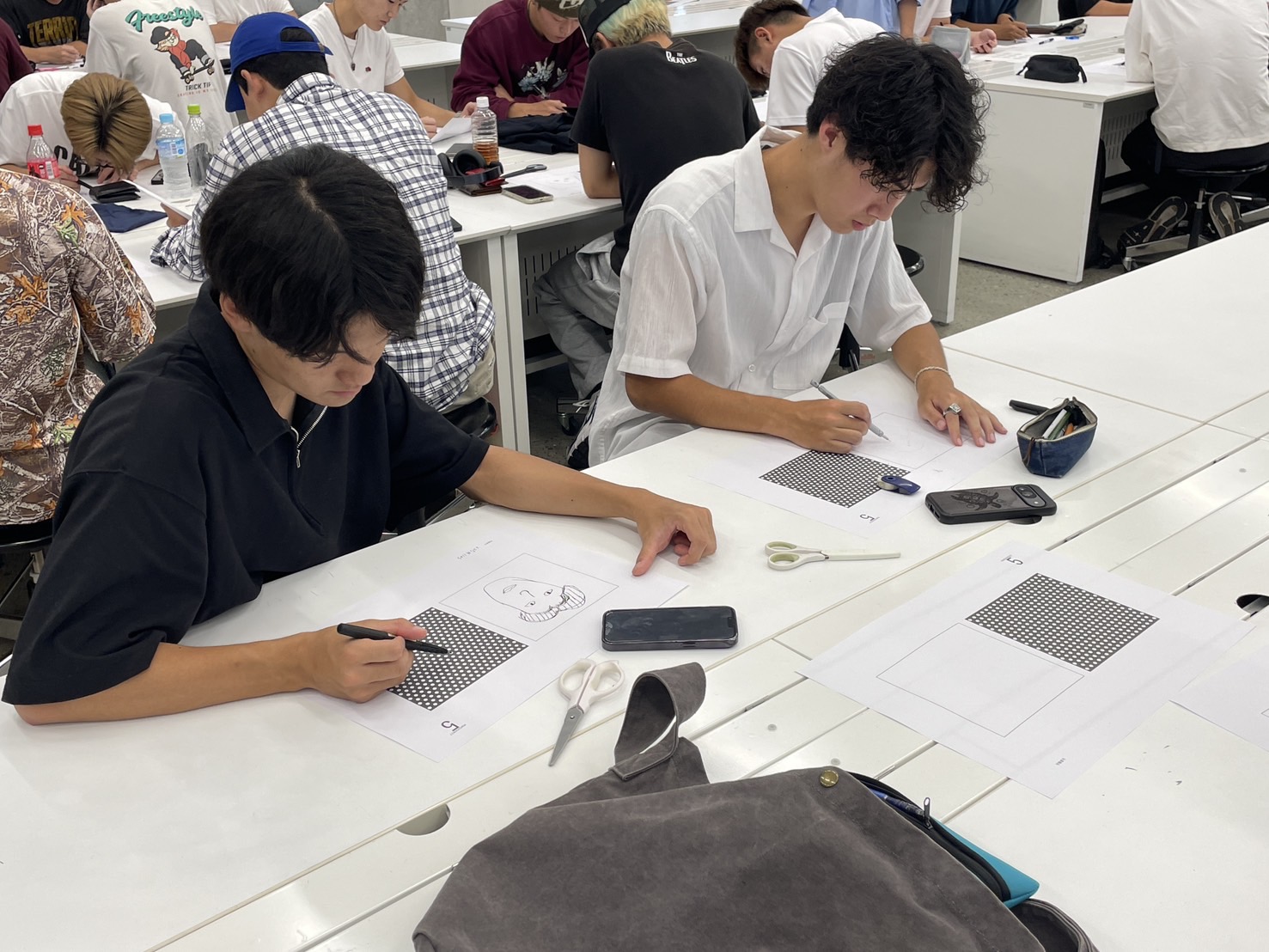 前半の課題では、ネームペンを使用し、自由に線やドットの塗りつぶしを行いました。ドットの課題では、300ドットの塗りつぶし、動物の絵や文字、模様など個性が出ていました。