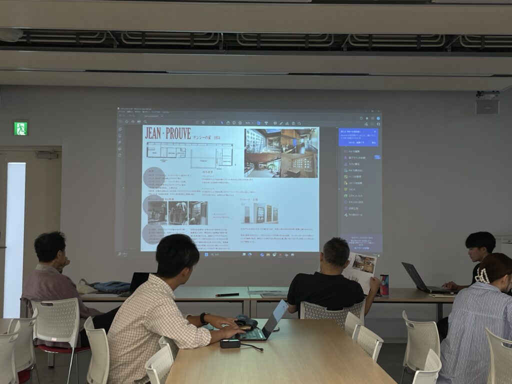 実際に学生たちが調査した建築は、出雲大社 庁の舎/菊竹清訓、ナンシーの家/ジャン・プル―ヴェ、スカイハウス/菊竹清訓、スレーハース邸/リートフェルト、クレラ―ミュラー美術館/リートフェルト、自邸/オスカー・ニーマイヤー、旧日向別邸(熱海の家)/ブルーノ・タウト、CAN FELIZ/ヨーン・ウッツォン、TOTEME/H&deMでした。