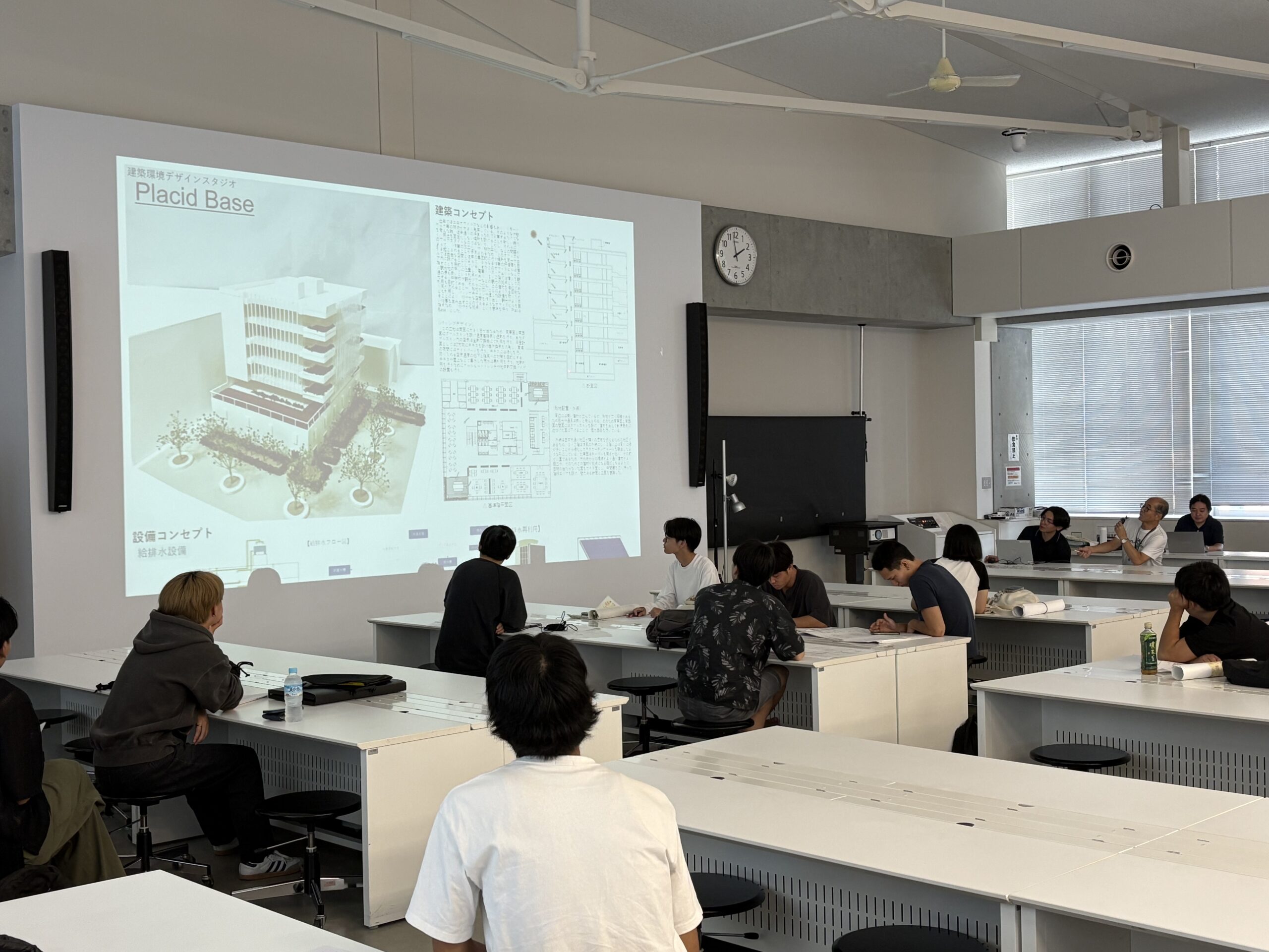 授業の最初には中村先生から進め方についての説明があり、その後、一昨年度の優秀作品に選ばれた長谷見さんに建築計画・設備計画の発表をしていただきました。昨年度より最終成果物としてプレゼンテーションボードの完成度も重視されるようになっており、その工夫や制作のポイントについて具体的に紹介されました。