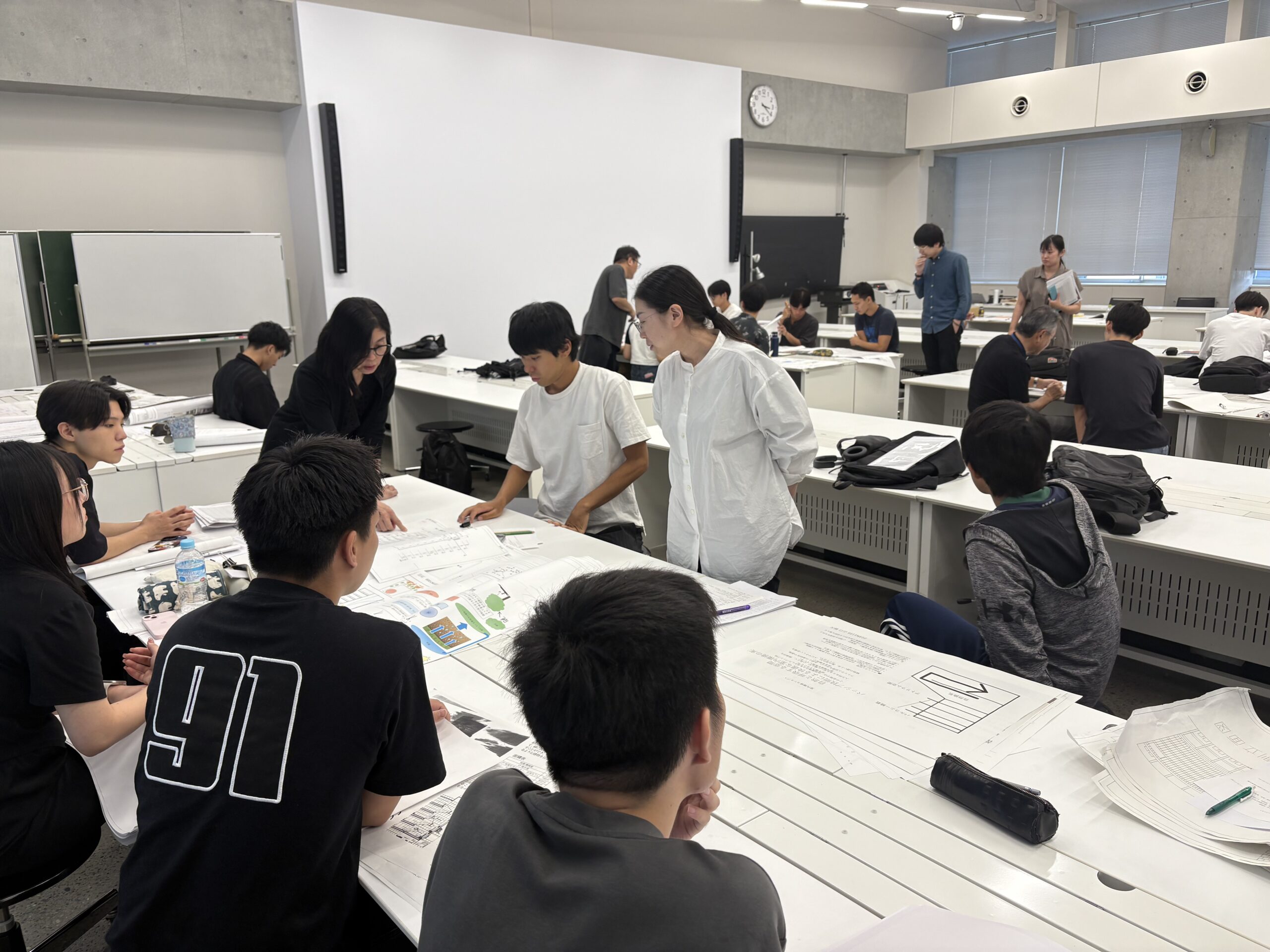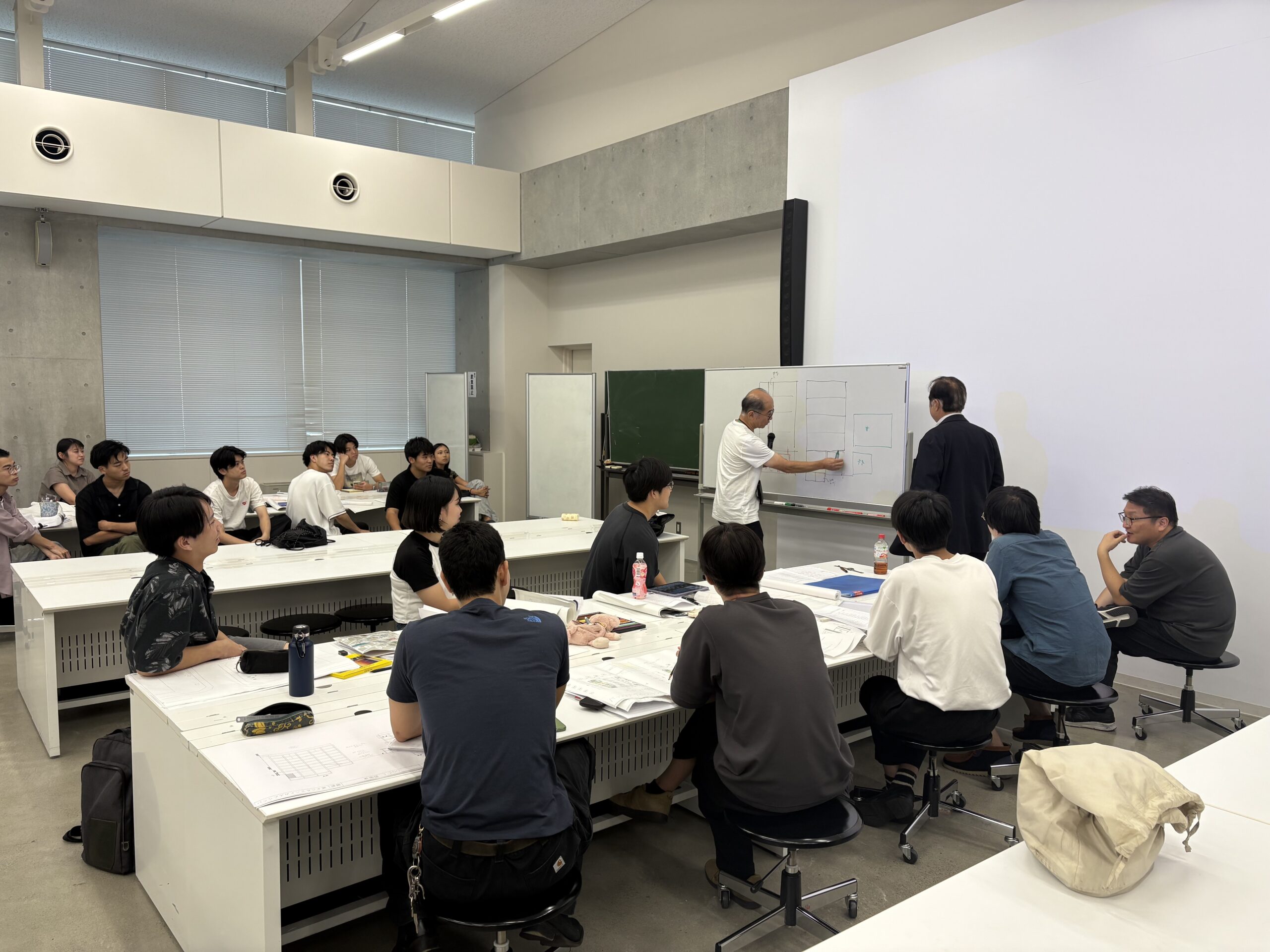 その後、各班に分かれてエスキスを行い、建築図の修正を進めました。今年度も札幌・仙台・横浜・甲府・京都・那覇の6地域を対象に建物を計画しているため、「地域特性を反映させること」や「必要な設備スペースの確保」といった指摘が多く出されました。