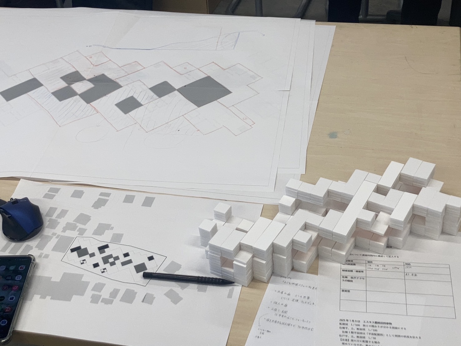次回、年明けのエスキスでは、プレゼンボードや模型の表現についてのエスキスを主に行っていきます。そのためには、すべての提出物において完成形が必要です。自分の頭で考えていることをダイアグラムや図面で表現してきてください。これから冬休みに入るので、スケジュールをしっかりと組み、自分の考えを表現しきれるように頑張ってきてください!