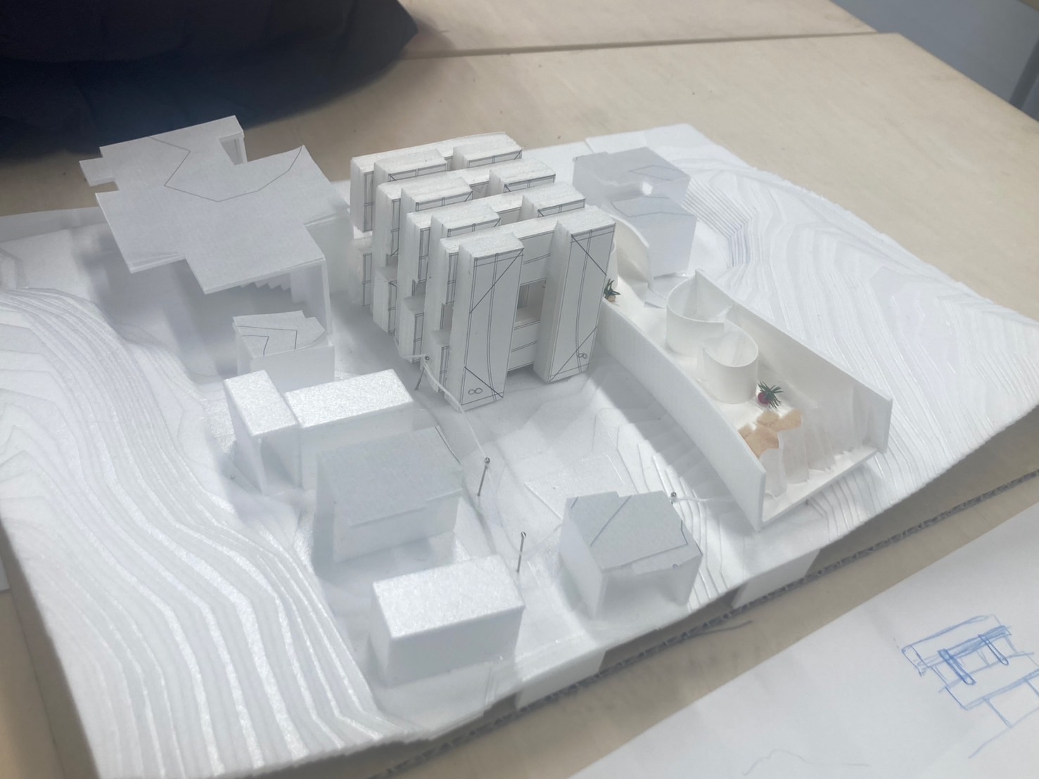 ・道路側から見たときの坂道の表現も立面図に表して書いてください。また、奥の斜面地でも同様にし、周辺との関係が分かるようにしてください。模型においてもコンタをいじり、図面と模型が異ならないように作成しましょう。