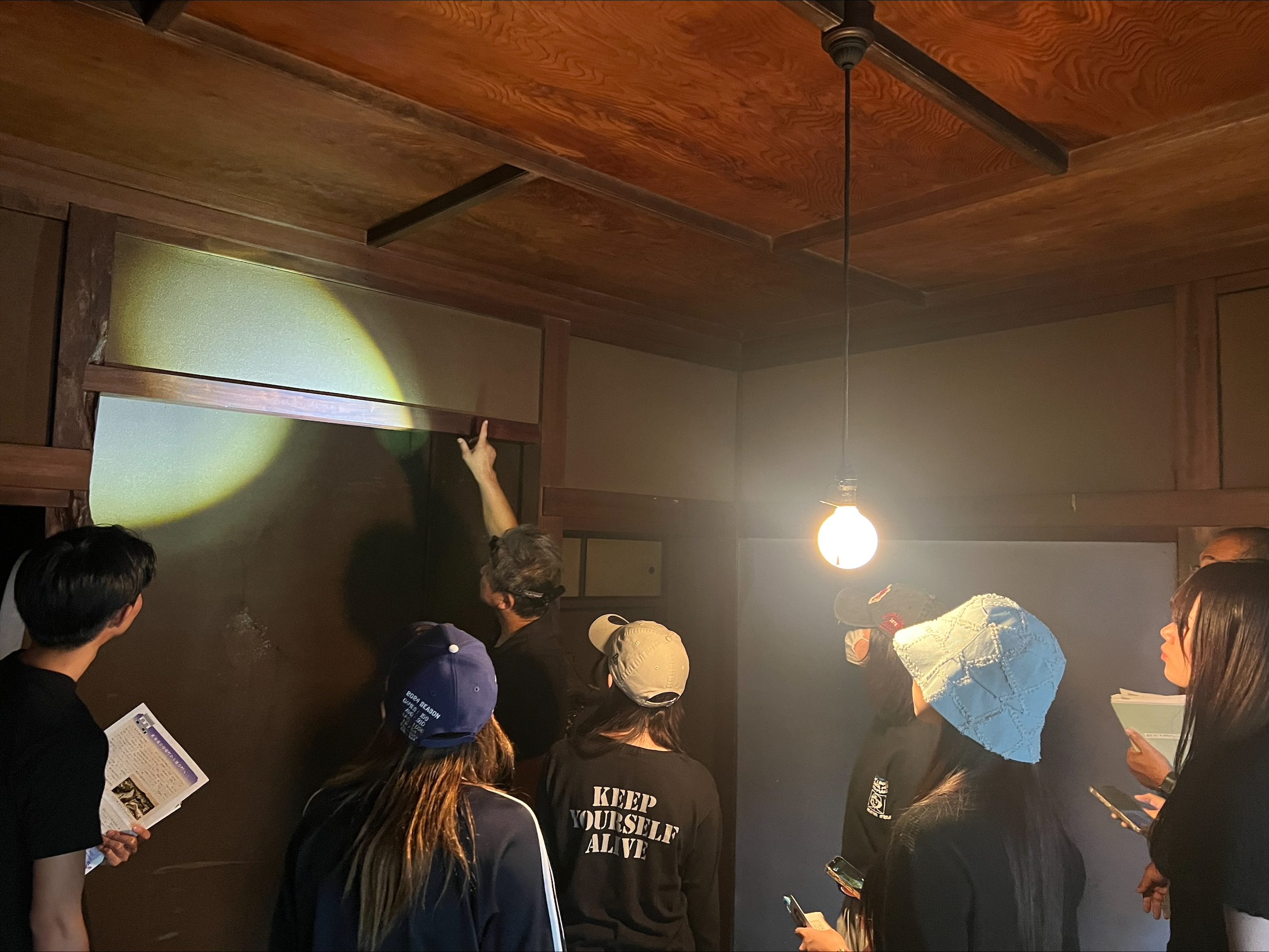 実測に先立ち、藤沢市計画建築部街並み景観課のご好意で、旧桔梗屋の内部を見学させていただきました。前回の授業で決められた各班に分かれて建物内外を見て回り、担当する建物を確認していきました。