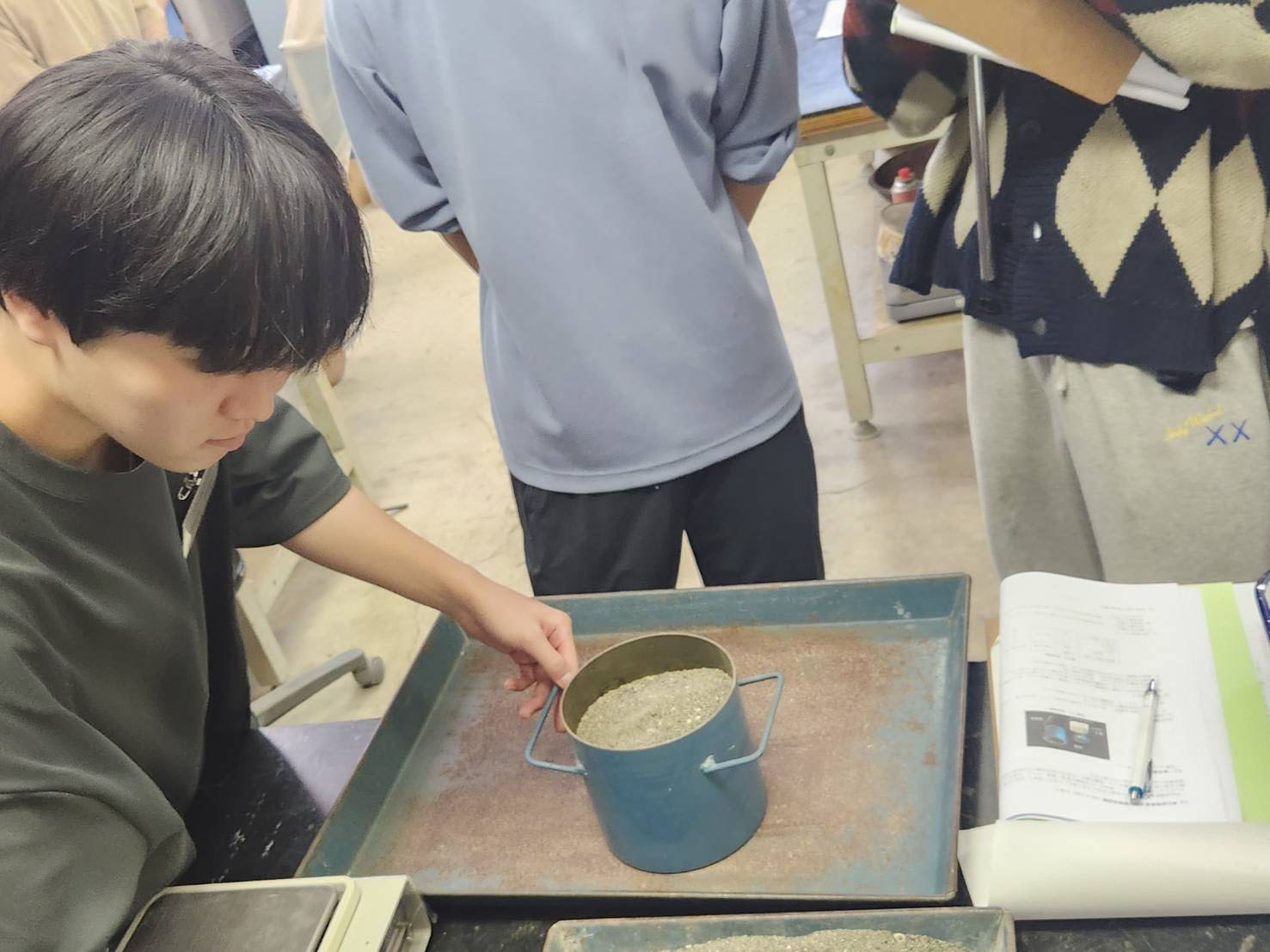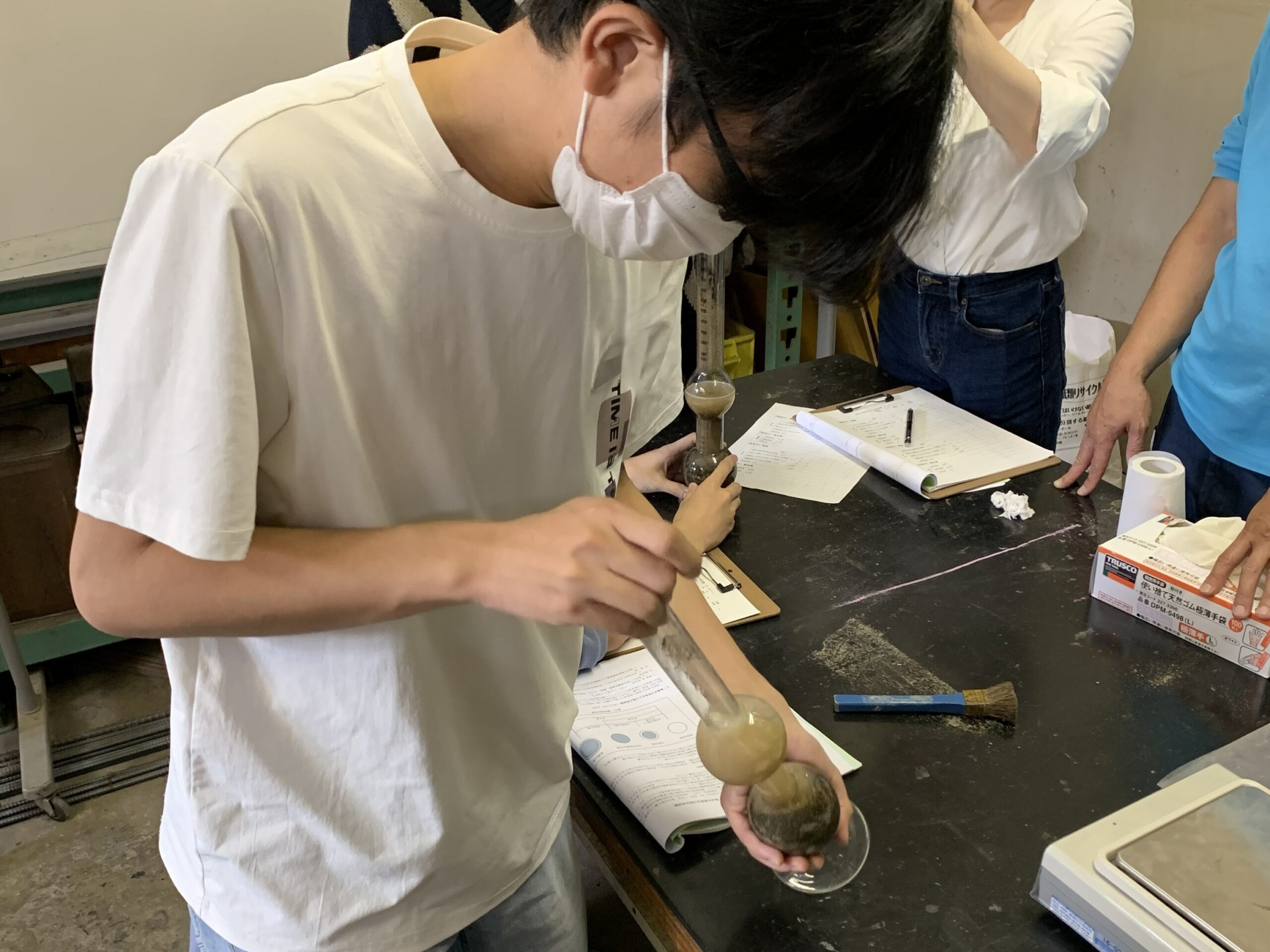 骨材の密度、吸水率試験はまず、粗骨材は布で一つ一つ石を拭き、表乾状態を作りました。細骨材は器具を使い砂が崩れる様子を確認することで表乾状態を作りました。その後、各骨材の密度を測定しました。粗骨材チームの様子はせっかく拭いた石を水の中に入れる必要があったため、少し残念そうにしながら測定を行っていました。細骨材チームの様子はフラスコ内の空気を外に逃がすことに苦戦しながらも一生懸命に作業を行い、測定を行っていました。