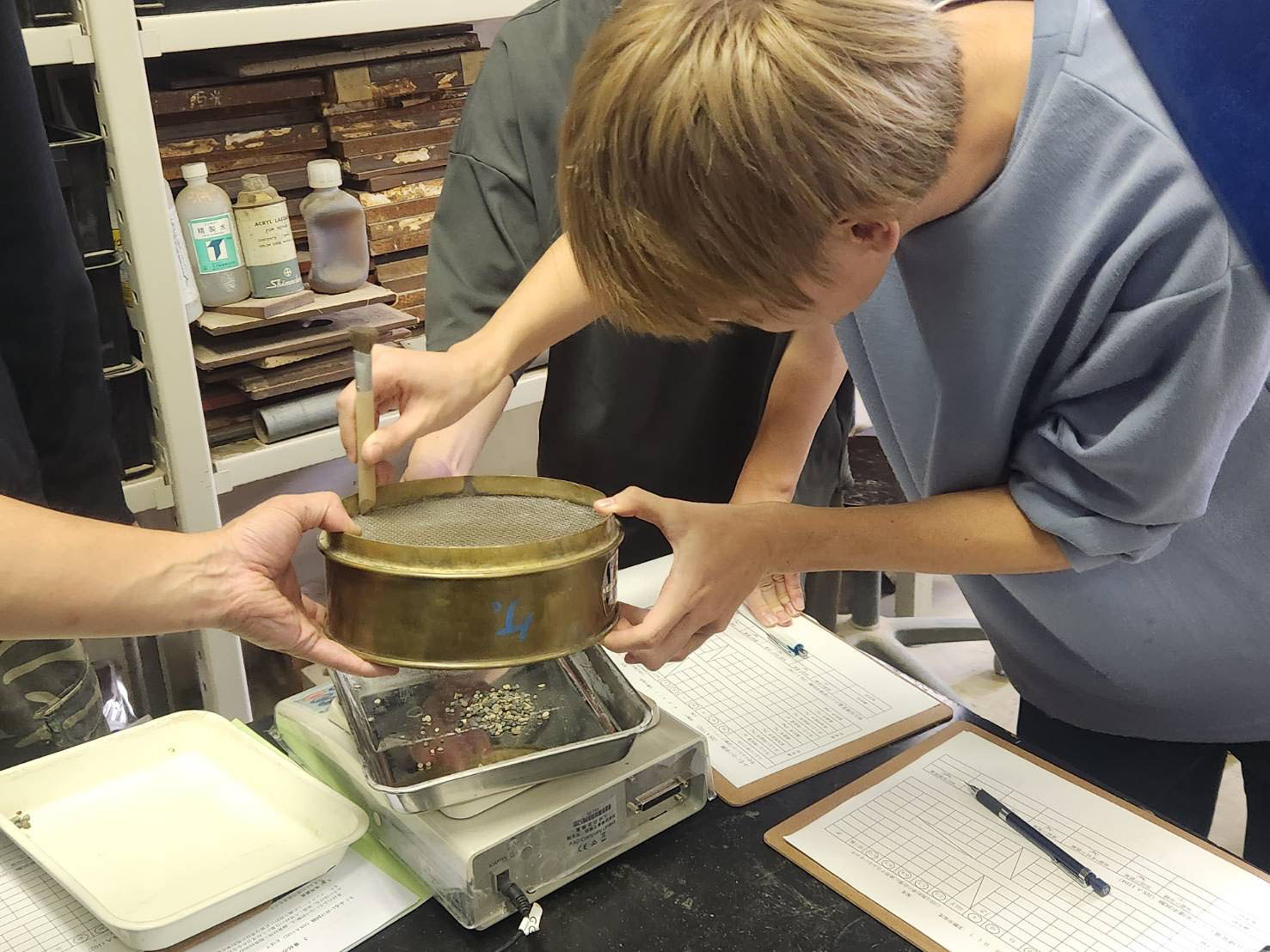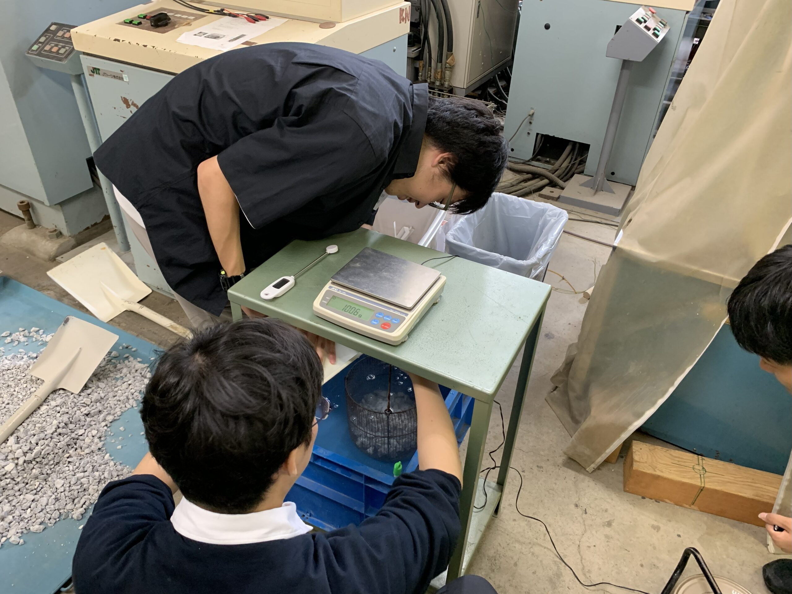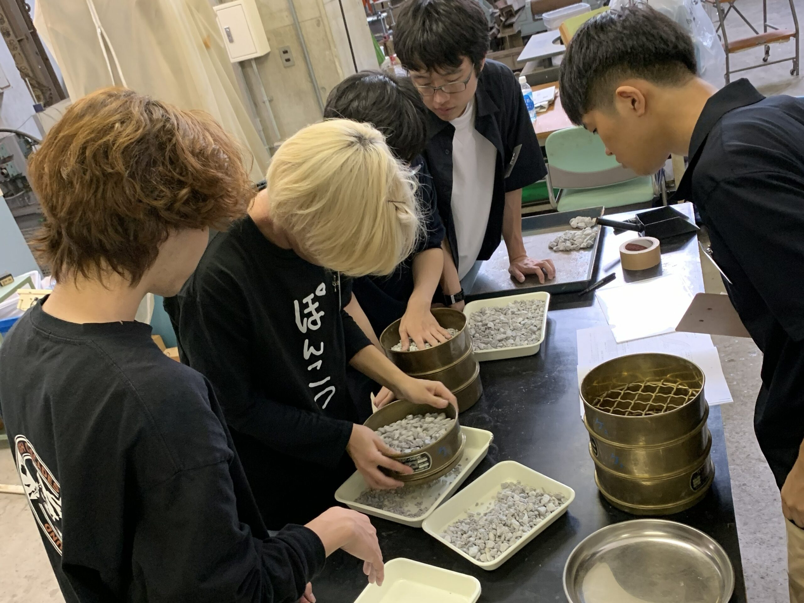 ふるい分け試験では、何層にもなる網ふるいを上下左右に動かしながら行い、各網ふるいにとどまった試料の質量を計測しました。粗骨材チームは網ふるいに大量の試料を入れてしまい、うまく骨材が通過せず苦戦していました。細骨材チームは網ふるいの網目に詰まった細かな骨材をブラシを使用して落としていましたが、なかなか骨材が落ちず苦い顔をしていました。