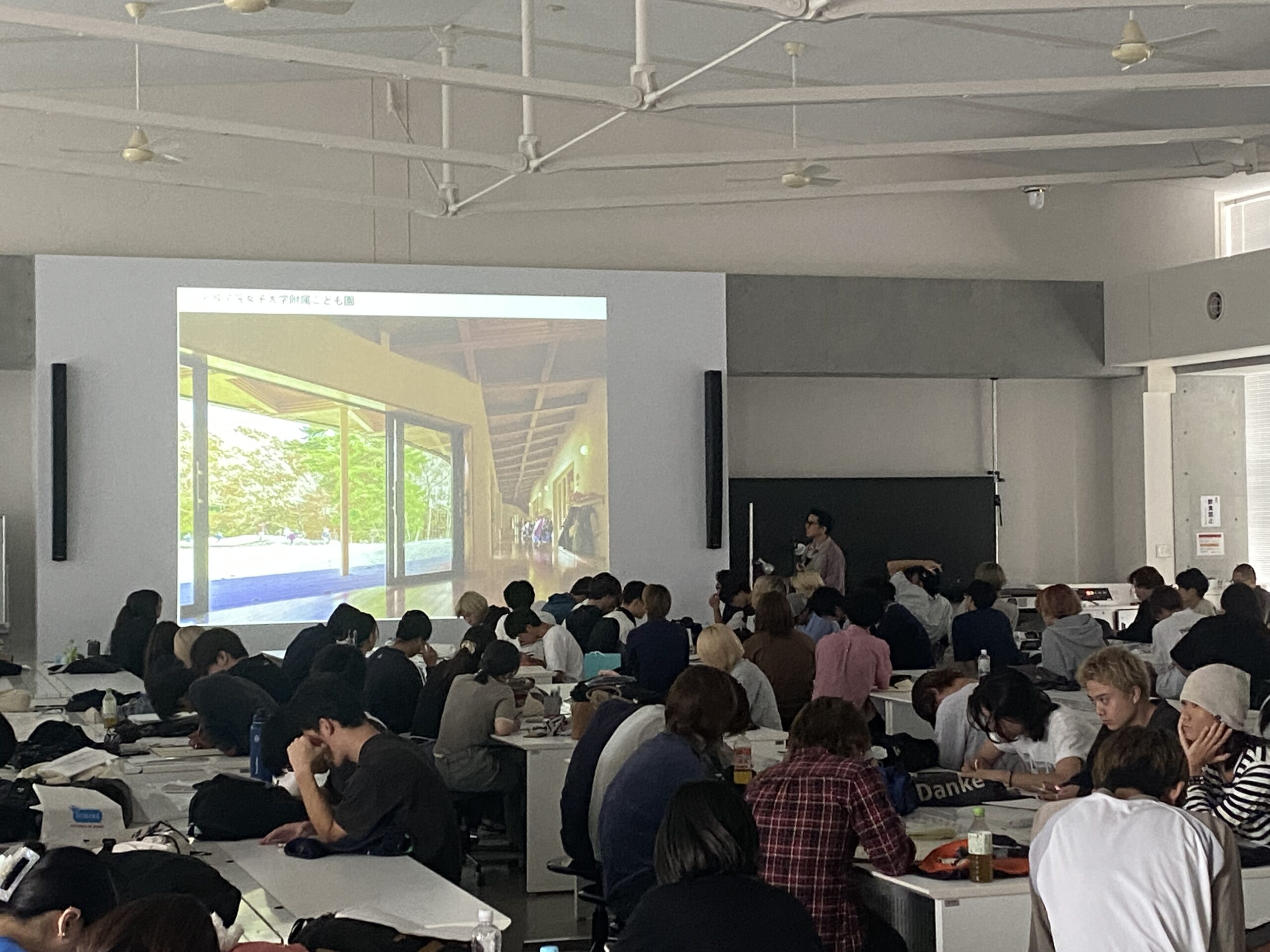 配置計画や断面計画などを実際のこども園の写真と図面を例に説明していただきました。外部空間と内部空間のつながりや視線の通り方など、設計の手掛かりとなる様々な視点を得られたと思います。自分なりに重要だと思うこと、挑戦してみたいこと、興味があることを手掛かりとし設計をスタートしましょう。