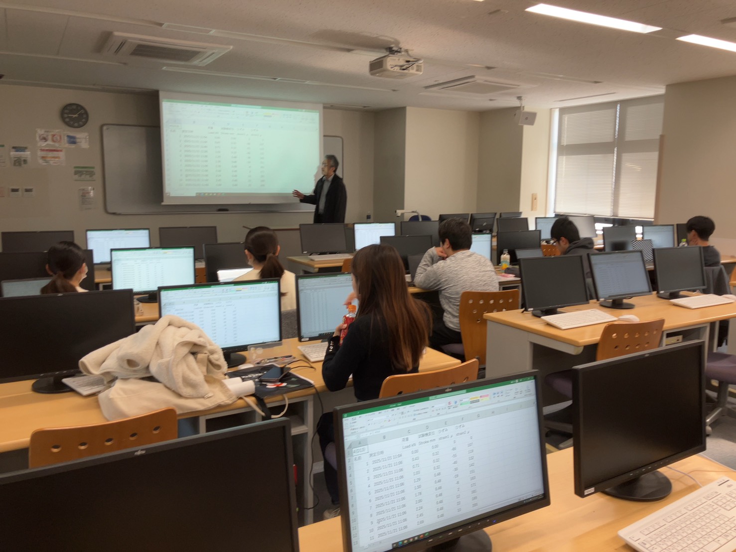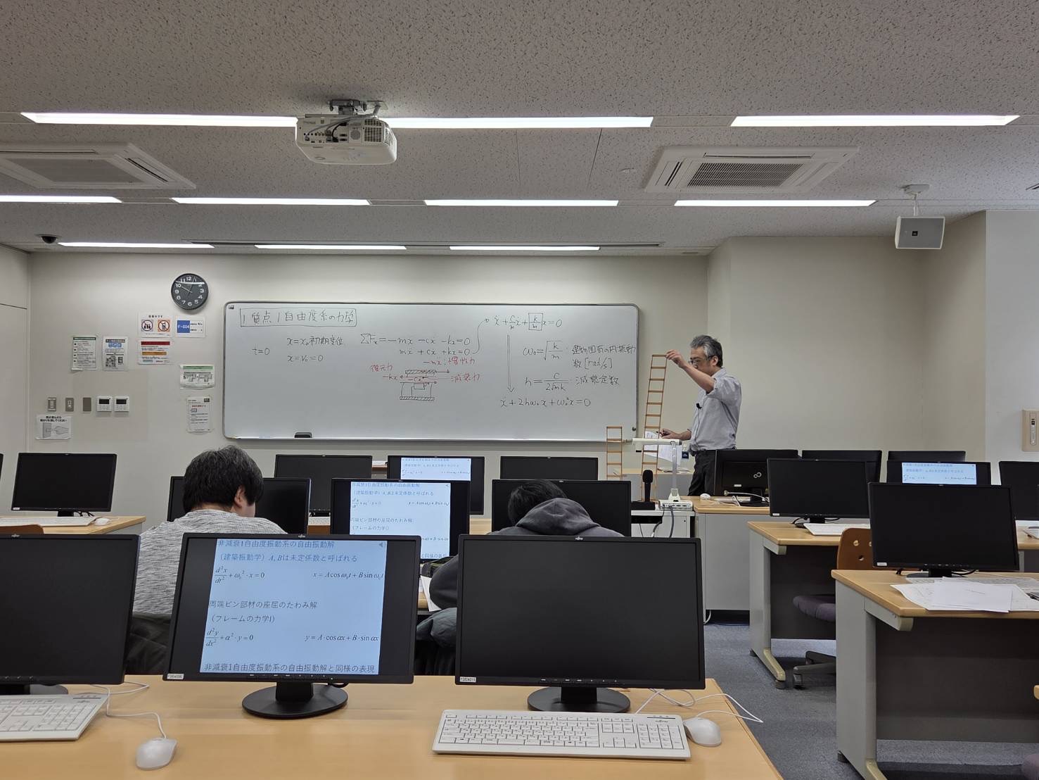 2025年10月3日、F-804で鉄骨梁の実験の解説が行われました。実験に先立ち、神戸教授が理論的な講義を行いました。梁に力をかけたときの変位やひずみなどを計算して予測することなどの重要なポイントの説明がありました。