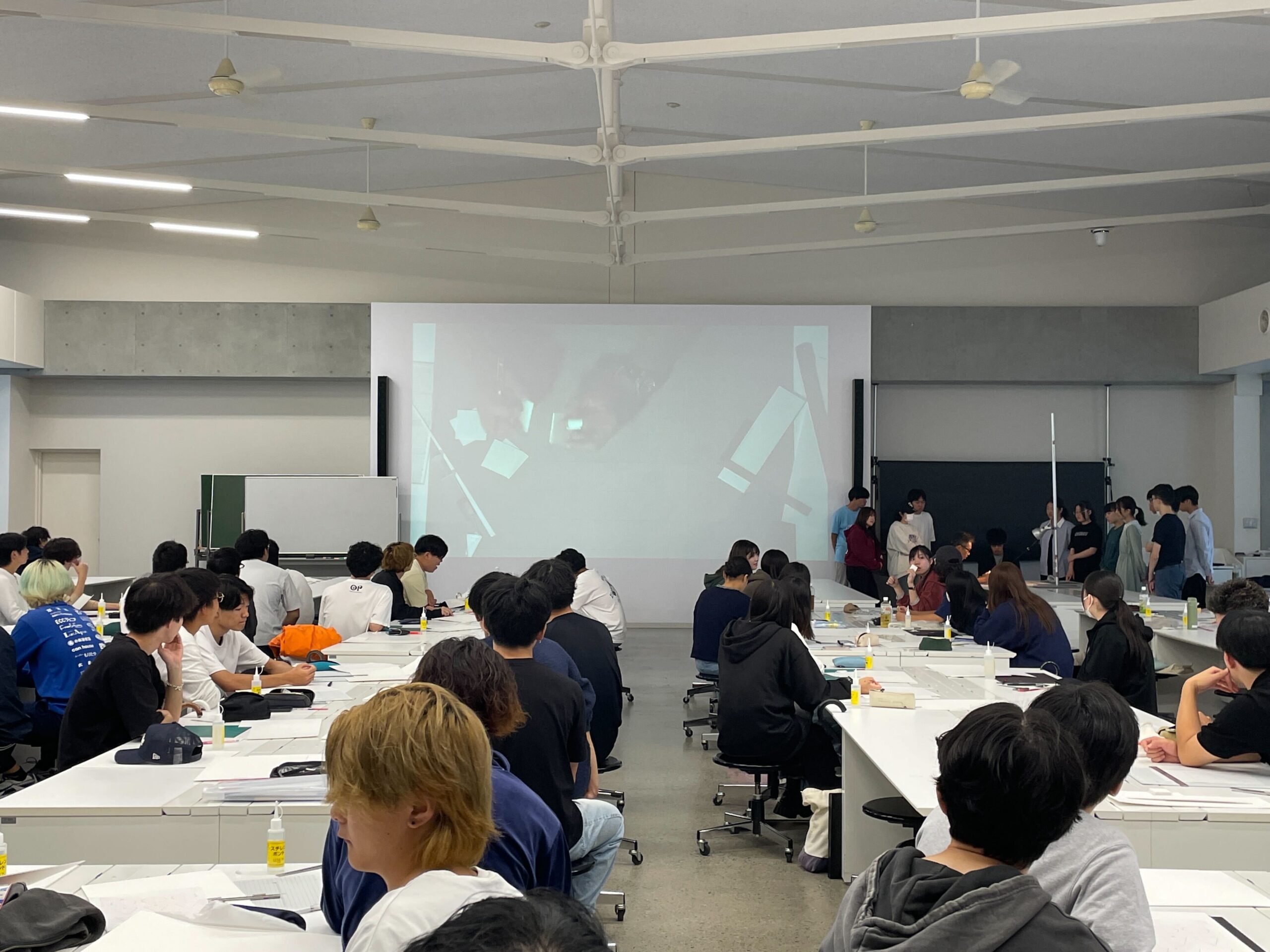 次に四角錐、円柱を作成しました。四角錐の頂点を美しくする為のスチレンボードの切り出し方や円柱の側を作るにあたってのスチレンボードの曲げ方、手順など先生のレクチャー通りに学生も作業を進めました。