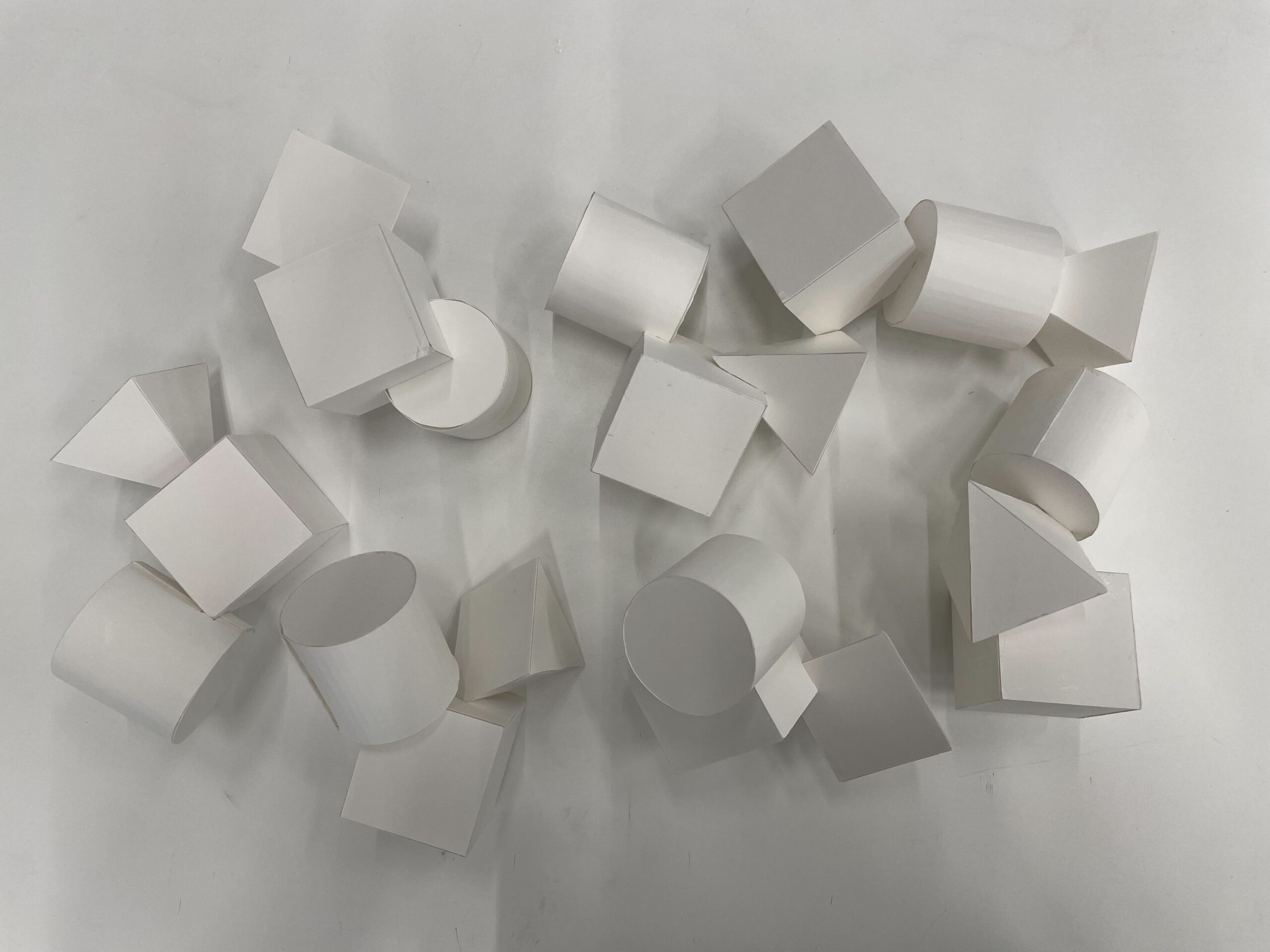 最後に、前半で作成した立方体、四角錐、円柱を自由に組み合わせ一つの立体構成しました。組み合わせるにあたって切り口や接着に苦戦している学生が多くみられました。立方体をメインに構成したものや直線状に連ねた構成など、組み合わせ方に個性が出ていました。