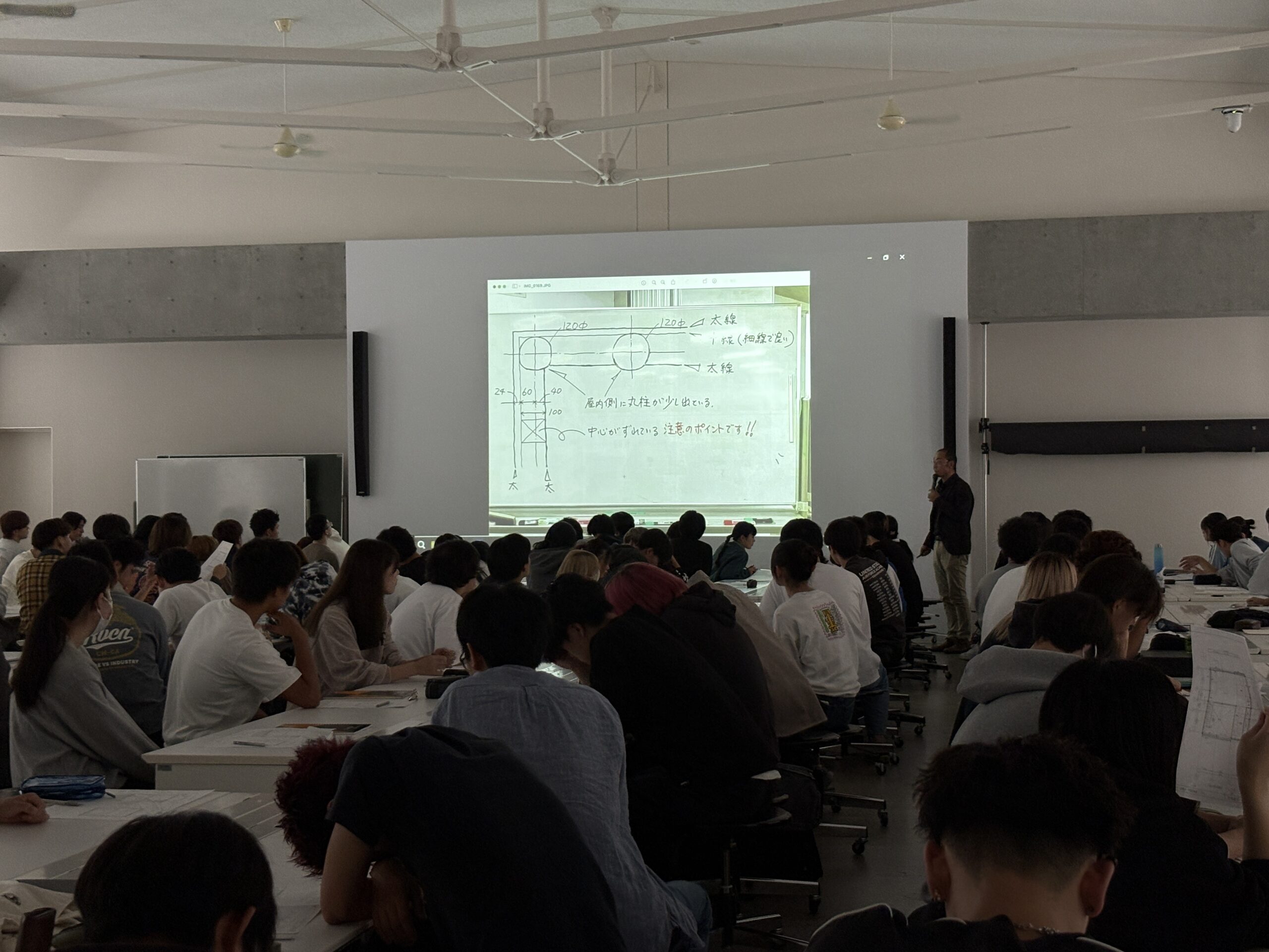 その後、図面の書き方、順番、階段の踏面の寸法など間違えやすいところを日置先生から解説がありました。1/50スケールでは詳細に描くことが求められます。壁が通り真に対して中央ではなく少し右にずれていることや円柱が壁から少し出ていること、線の強弱に気をつけることが挙げられました。
