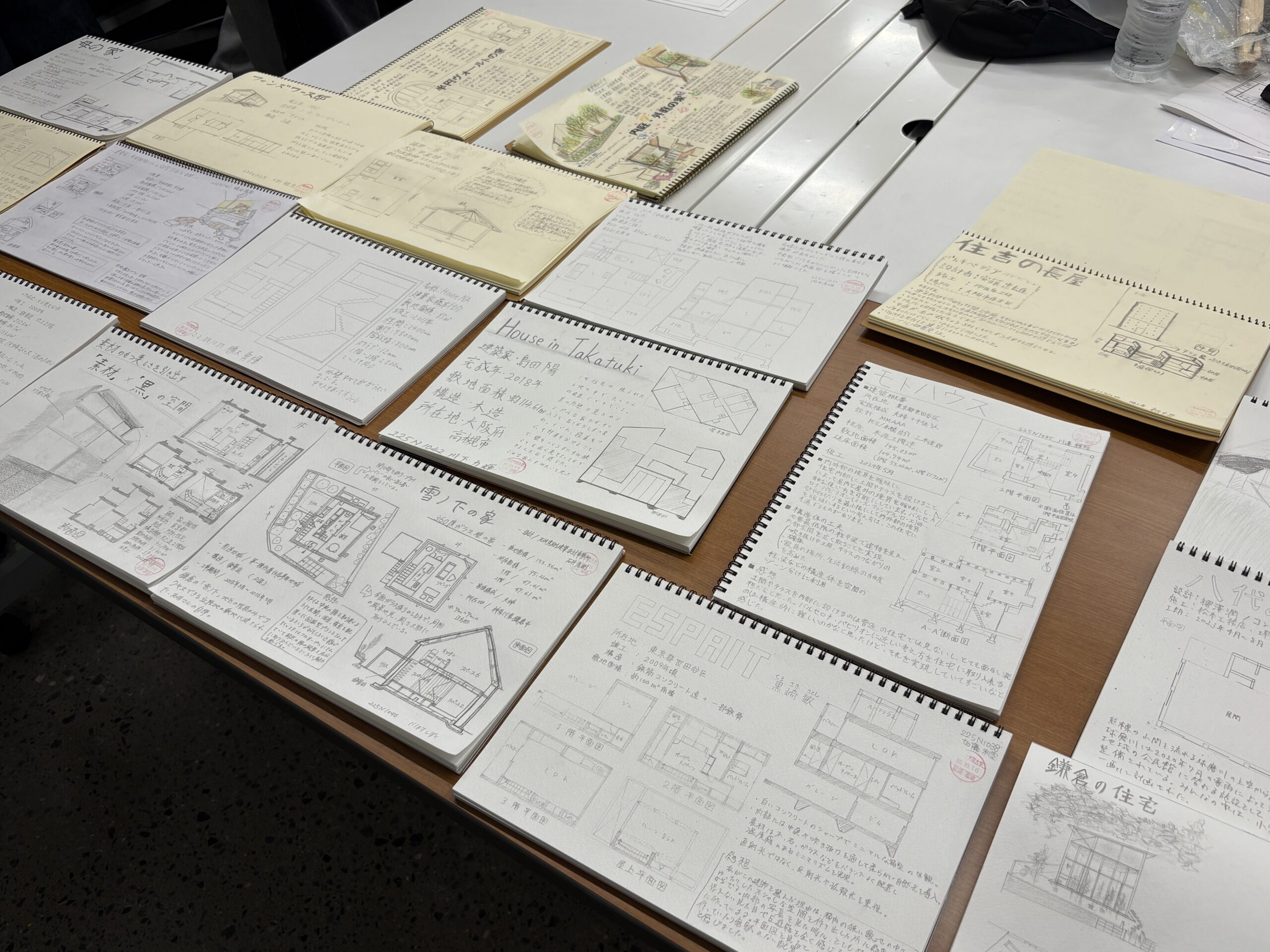 回の宿題として出されているスケッチ課題は、各班ごとに講評会が行われました。細部まで丁寧に描き上げたり、色鉛筆を用いてスケッチを自分らしく仕上げていました。先生からは、矢印を使って図面から読み取れることを書いてみるなど、そのまま模写するのではなく、自分なりの表現で工夫してほしいとの講評がありました。講評会の後、中には他の班のスケッチを見に行く学生も見られました。