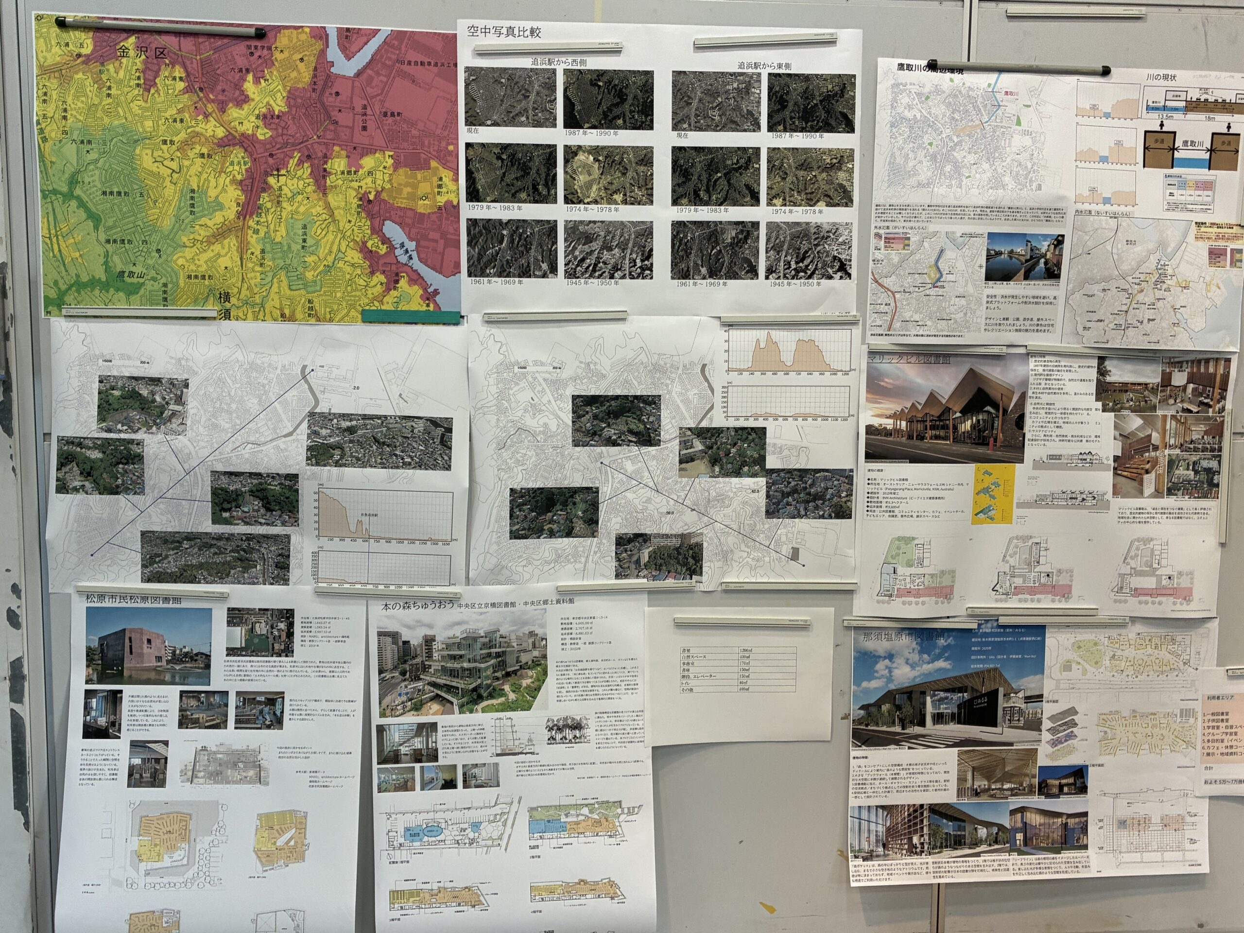 今回は、引き続き敷地リサーチに加え、自身で設計する図書館の延べ床面積1500㎡の仮の面積配分案をまとめたプレゼンシートを壁に貼り、貼られたプレゼンシートから伝わるものが作成できているか確認することを目的に、先生方に読み込んでいただく形で発表を進めました。前回は、シートのレイアウトなどが課題に挙がっていたため、新たに改善点が発見できたと思います。