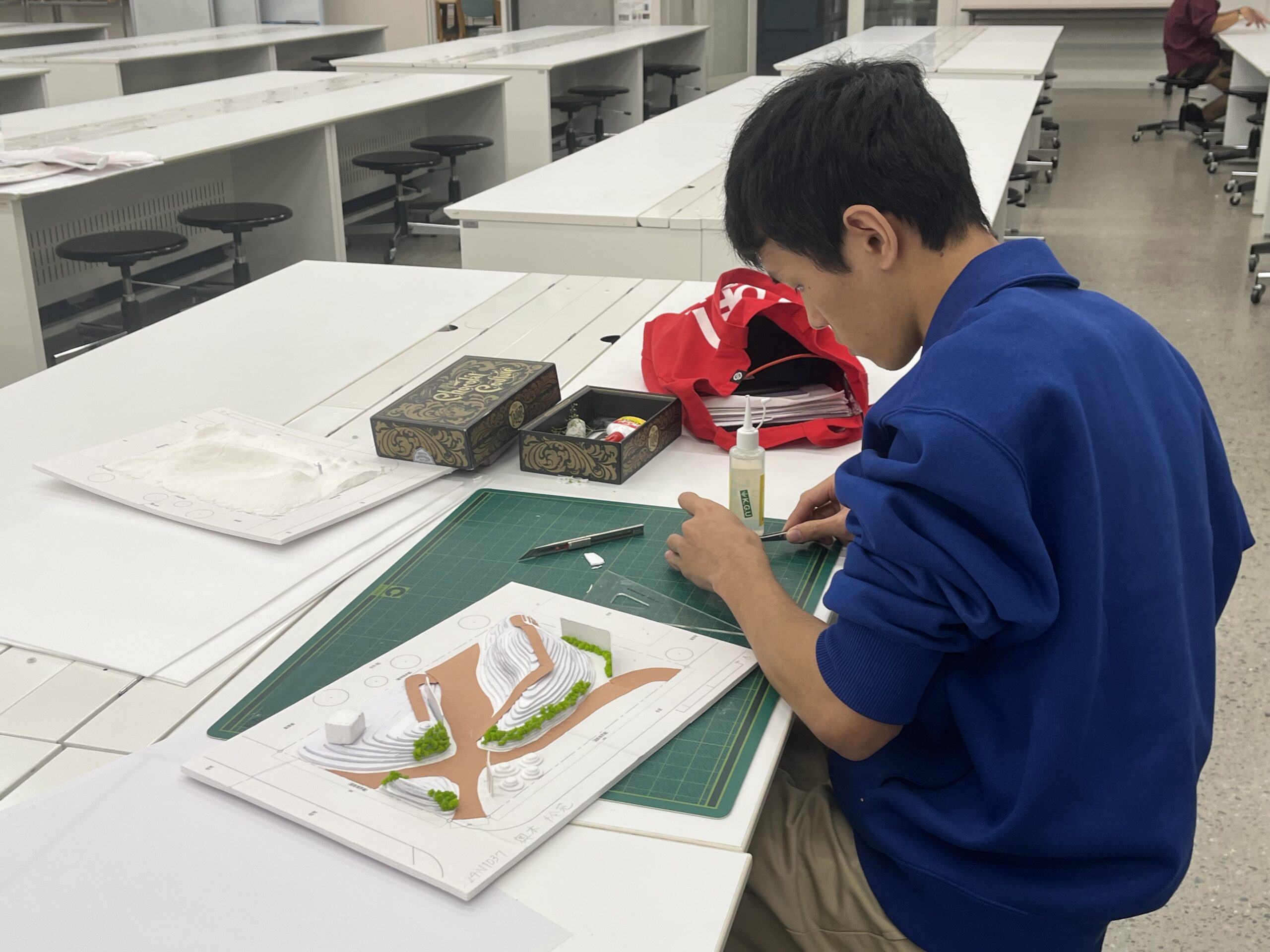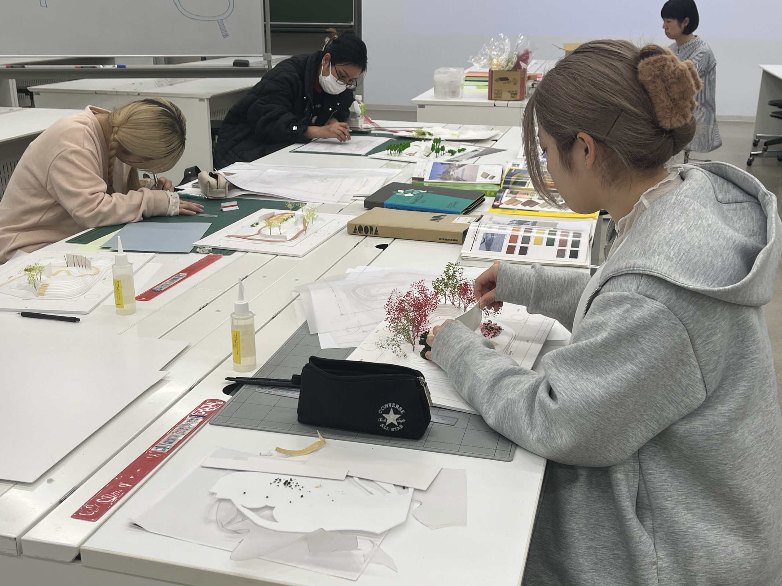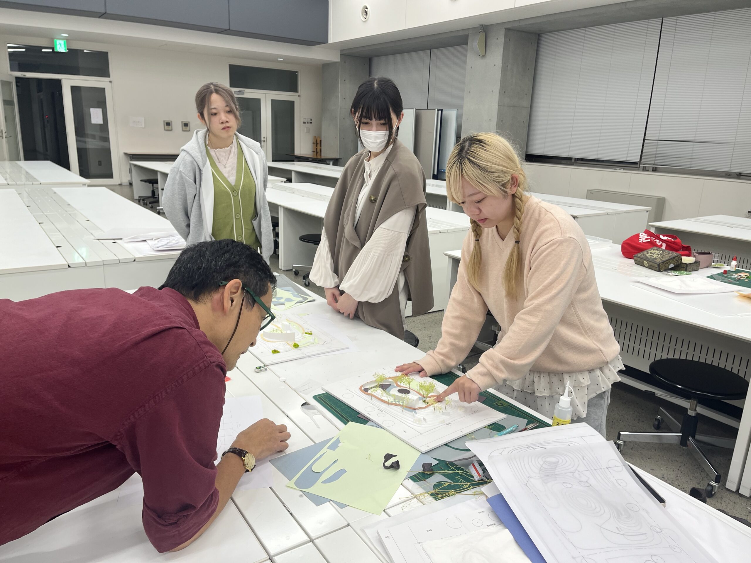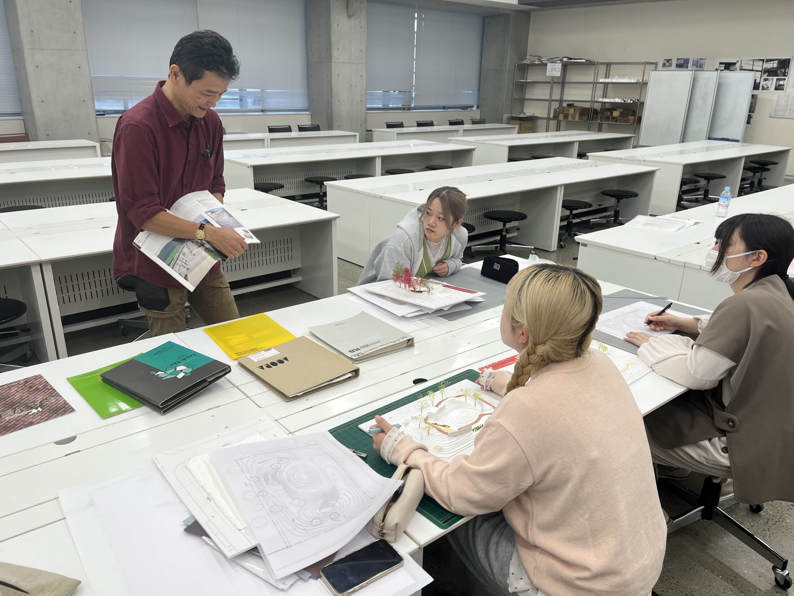 レクチャーを受け、学生たちは早速、インターロッキングの実例集などを参考にしながら、作成中の模型に「地面」のデザインを落とし込んでいきます。 今までは何気なく見ていた舗装のパターンも、デザインの意図を持って見直すことで、自分の設計に取り入れるべき点が見えてきたようです。「大学内のフォーサイト前の広場なども、良い教材になるのでよく観察したほうがいい」というアドバイスも、身近な発見につながったようでした。