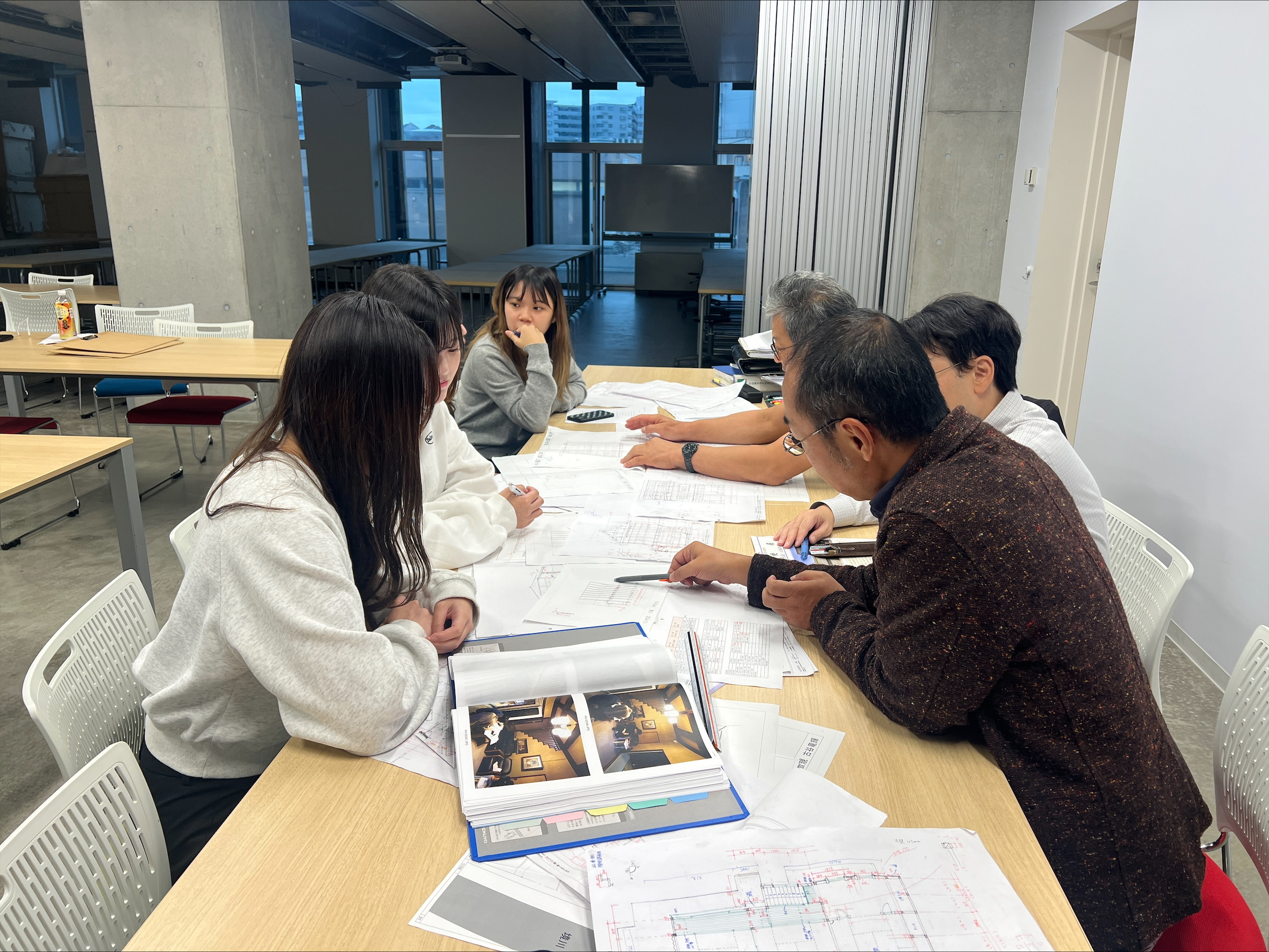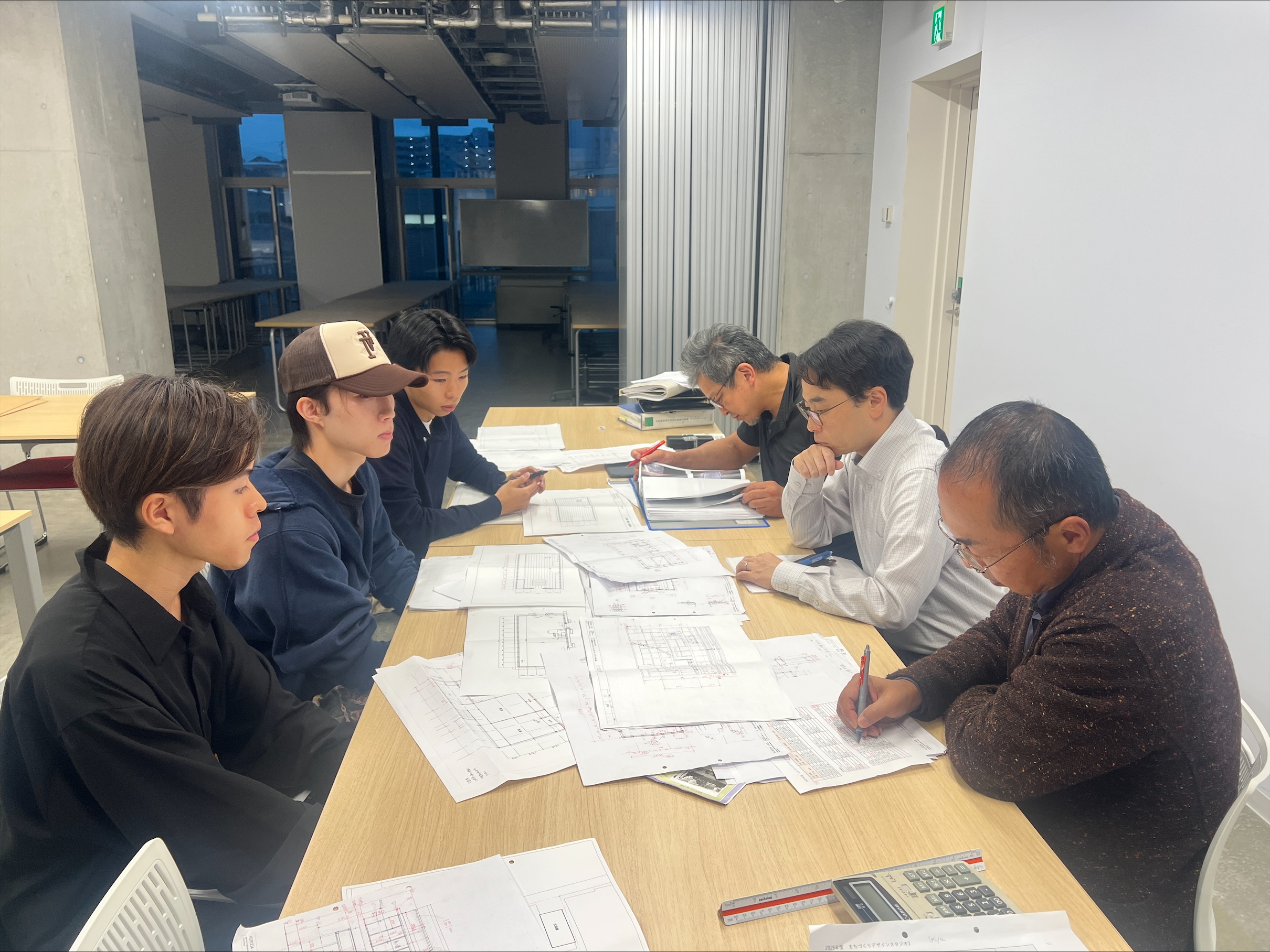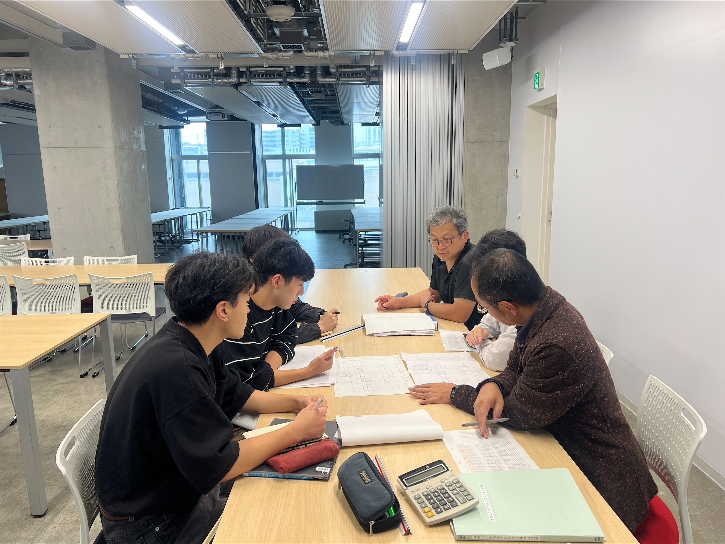 2025年10月14日(火)、まちづくりデザインスタジオ2の第3回の授業が行われました。今回は10月11,12日に行われた旧桔梗屋の実測調査で作成した野帳を元に、建物の基準寸法を先生と話し合い検討しました。