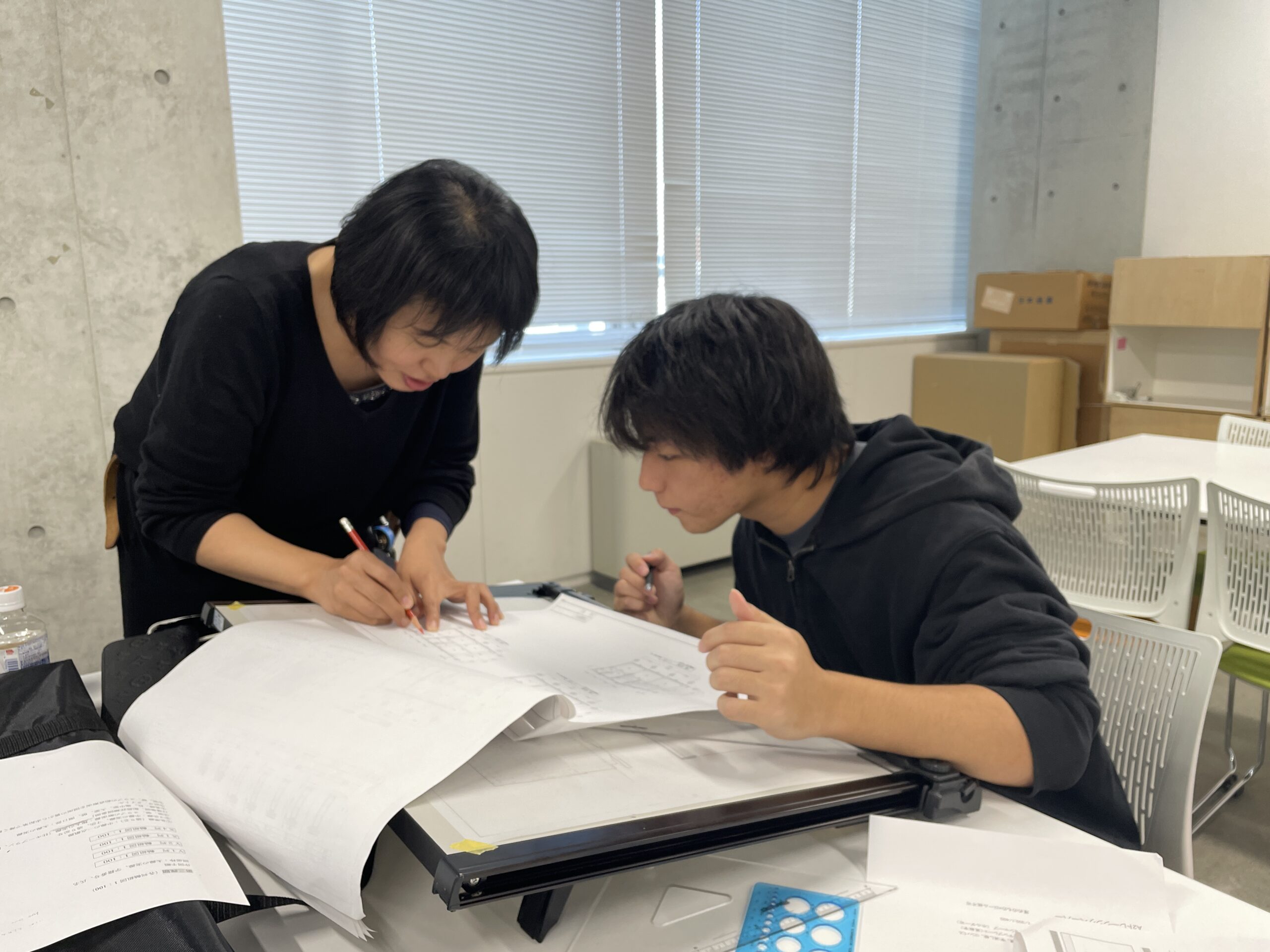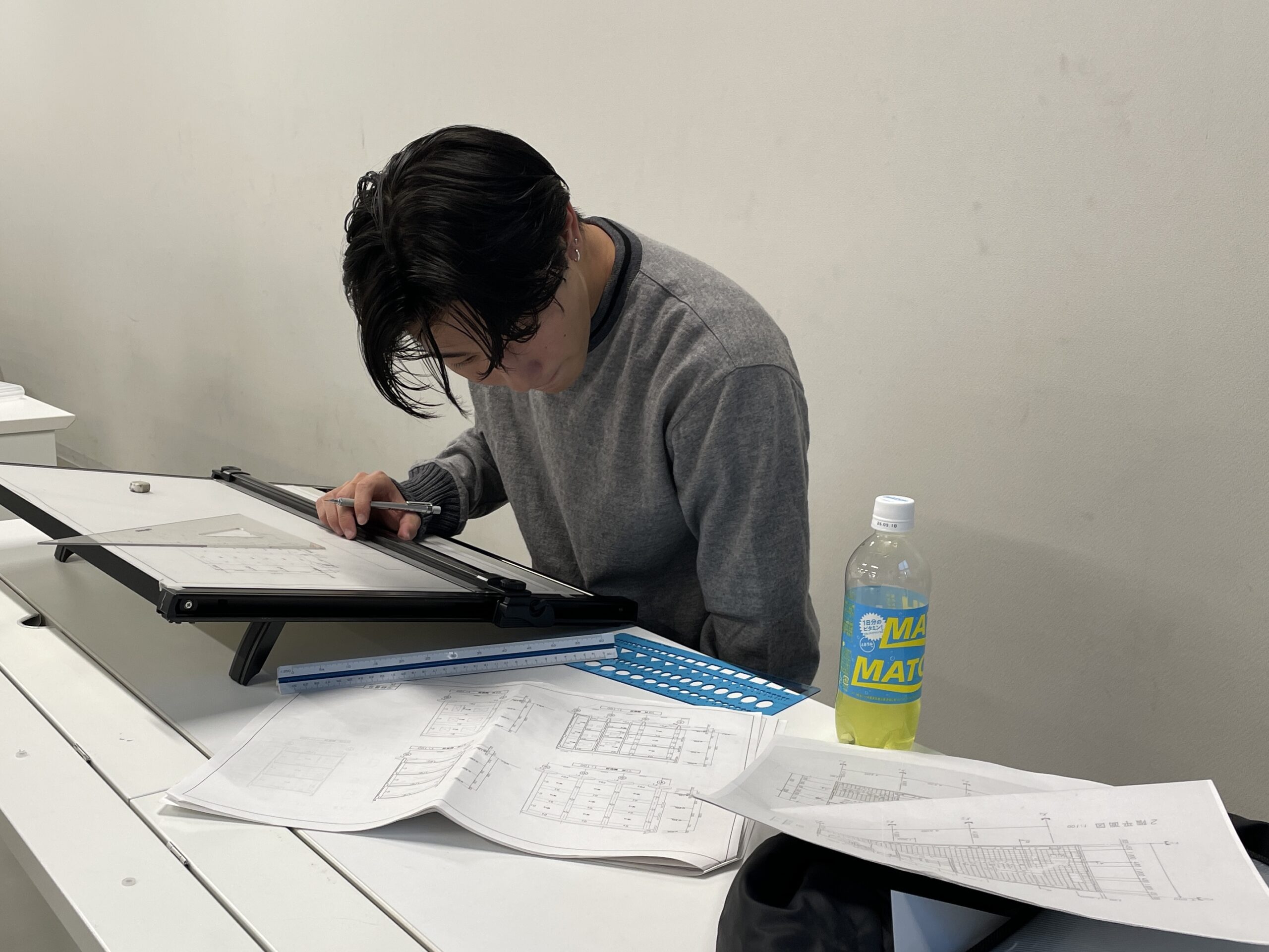 軸組図は、開口部の位置や部材の大きさなど、さまざまな情報を整理しながら進める必要があります。作図には時間を要しましたが、メモやお手本を何度も確認しながら、丁寧に作図を進めていました。