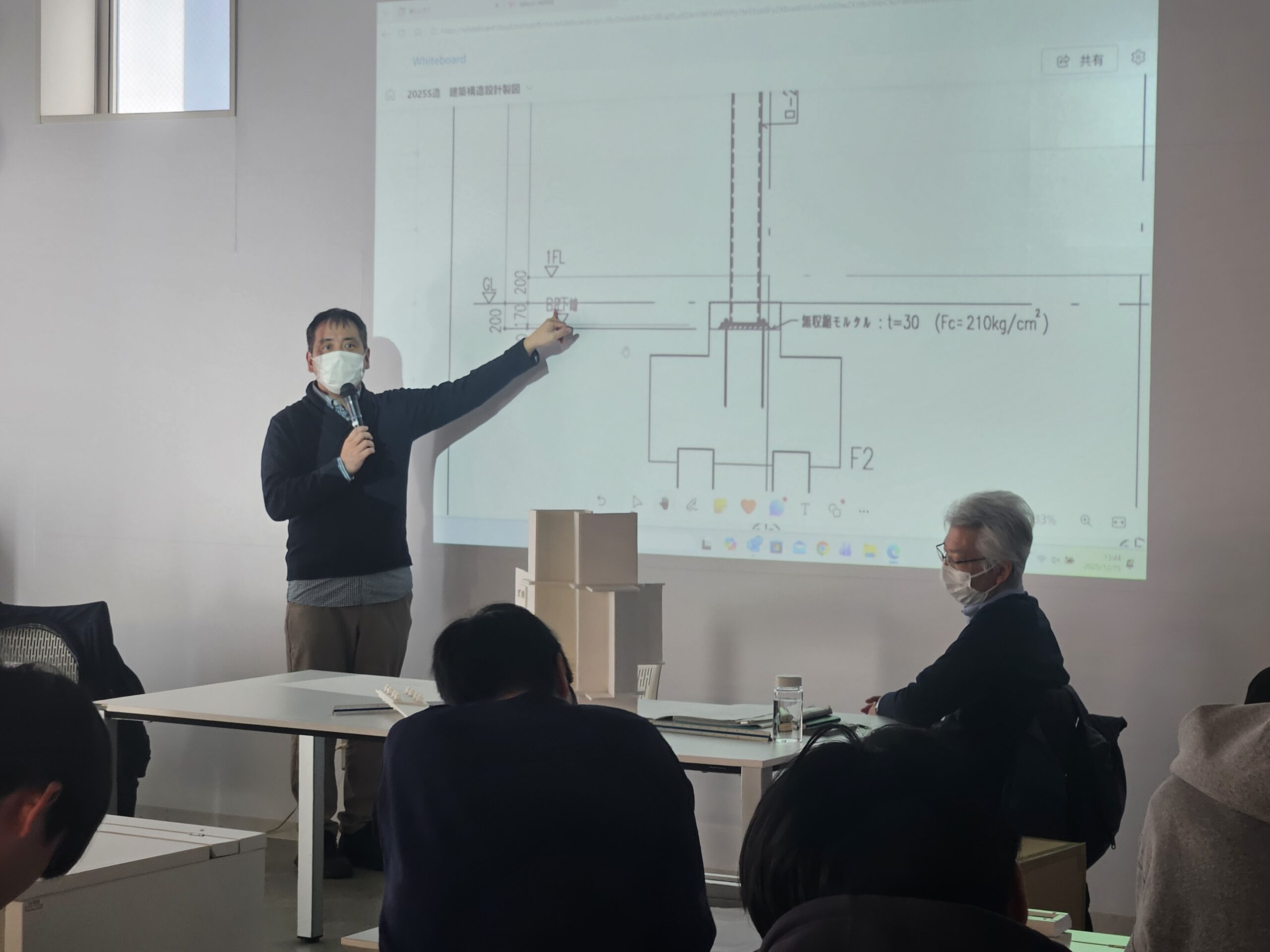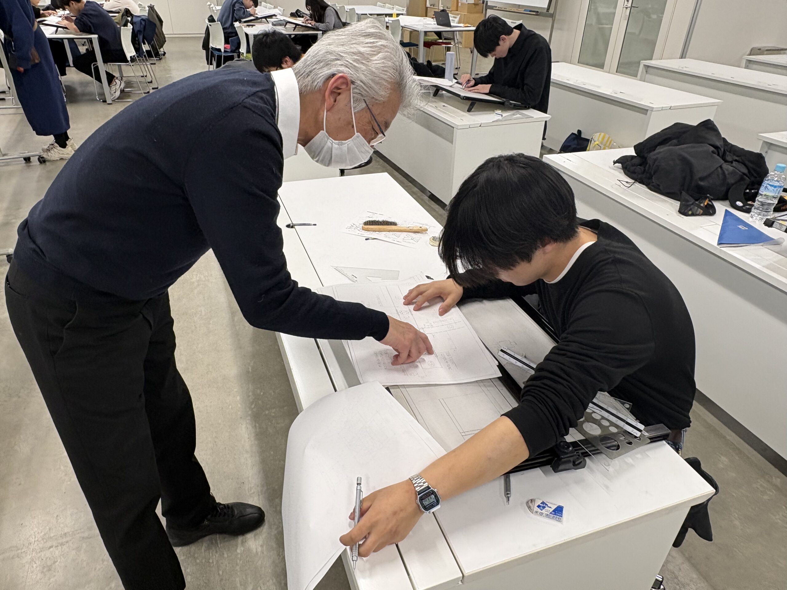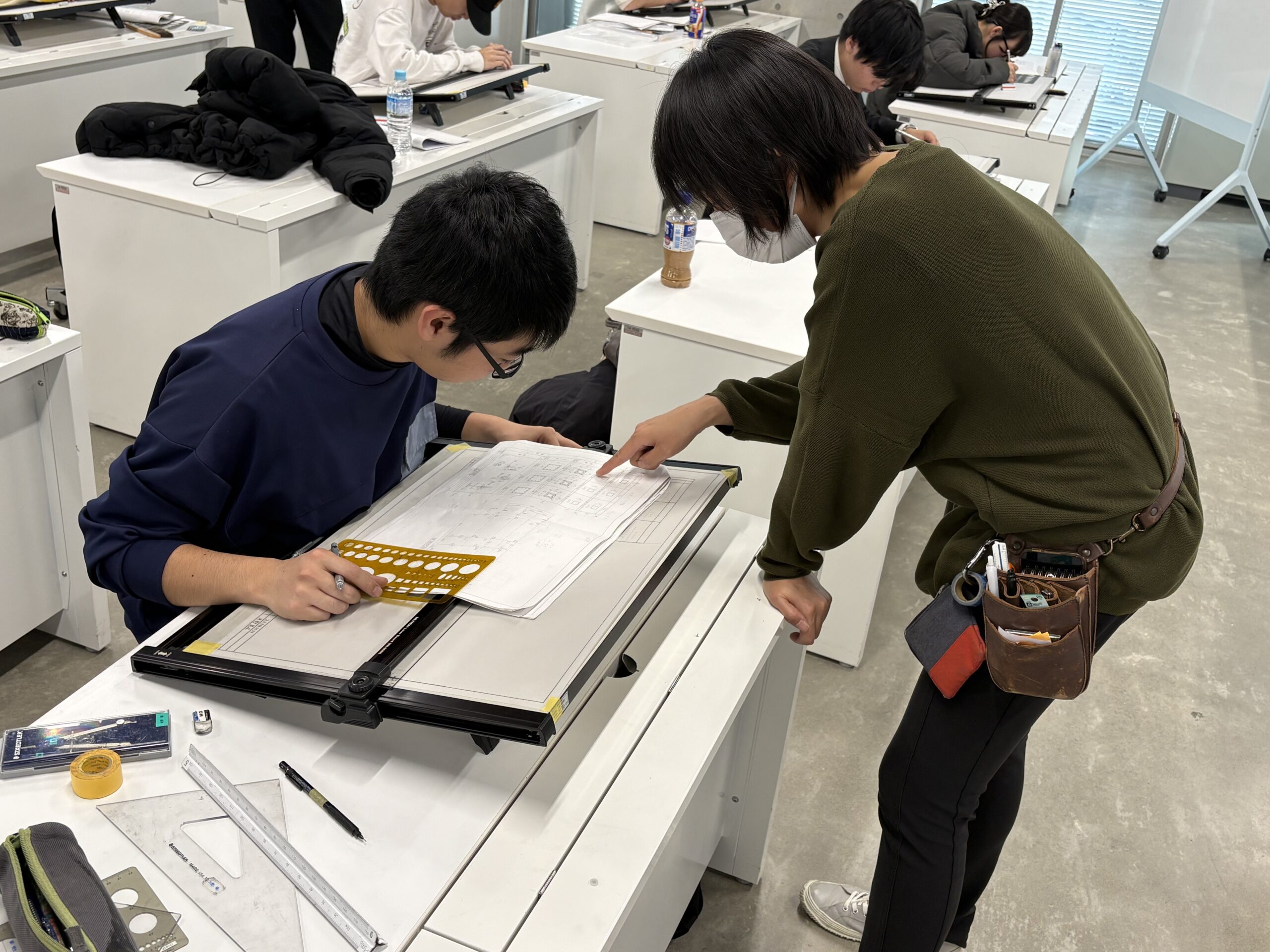 学生たちは、切断位置に応じて断面線の太さを使い分けることや、断面として見えている梁・スラブの種類、寸法、位置などに注意しながら作業を進めていました。
