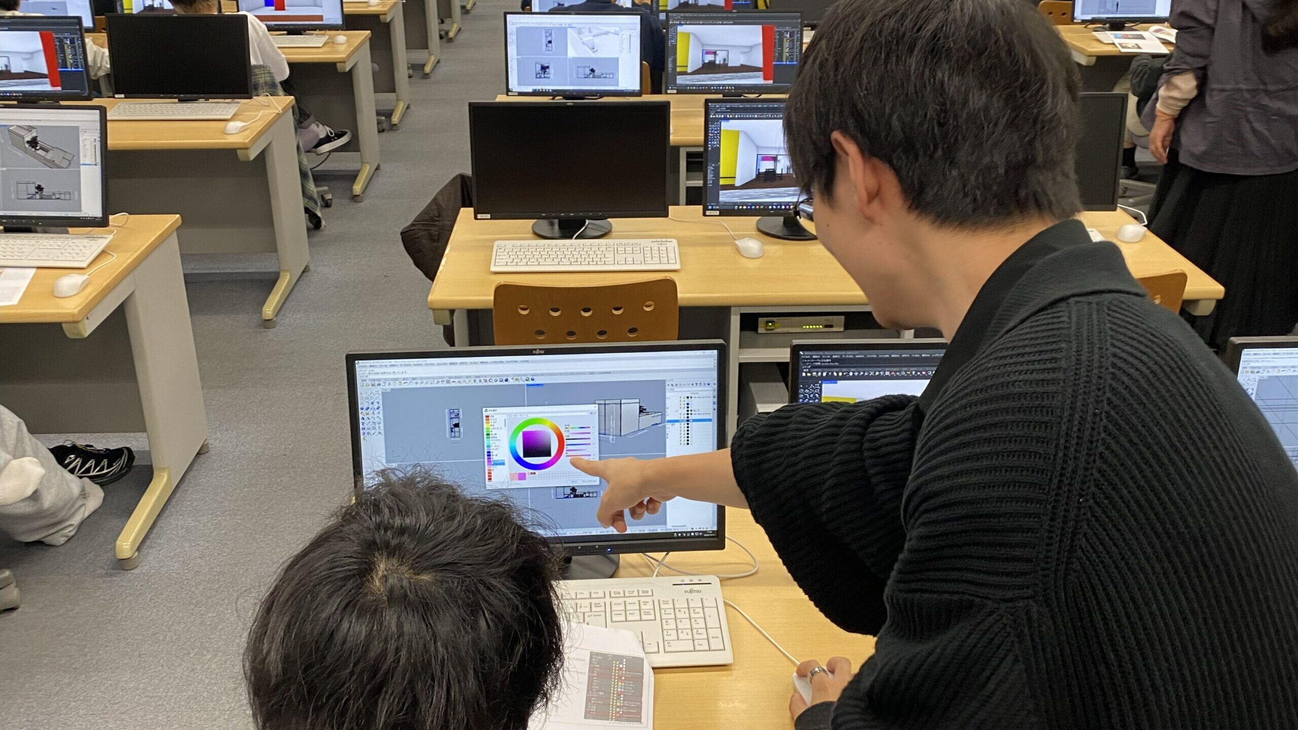今まで立体を作成する操作が多かったため、今回は慣れない操作に戸惑う場面もありました。実際の建物に近いレンダリング後の画像が出来上がると、声をあげている学生も見受けられました。