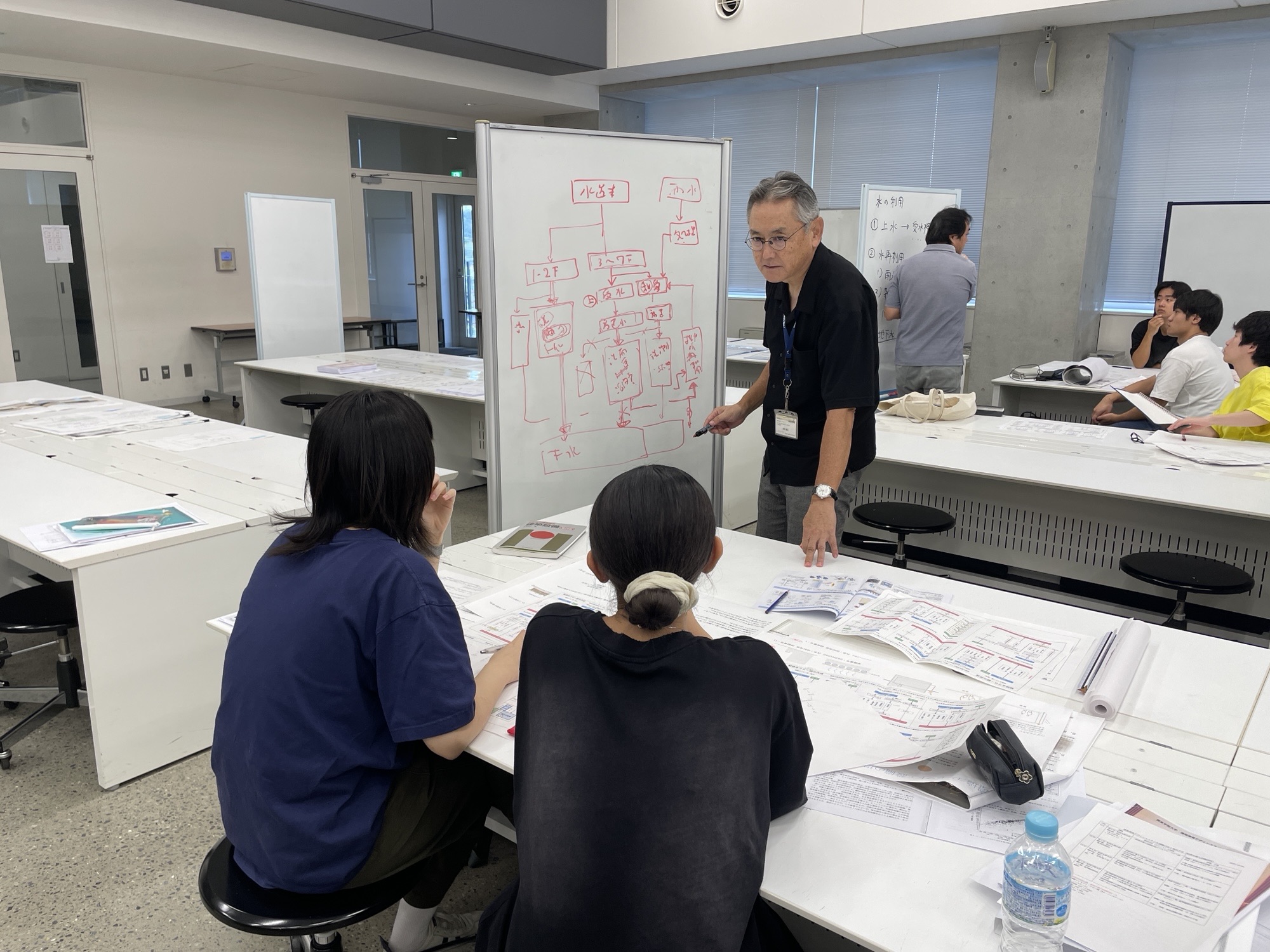 その後は各班に分かれてエスキスを実施し、建物内での給排水設備の一連の流れを確認しました。多くの学生が、地域特性を反映したコンセプトの作成に苦戦していたので、各々の地域にふさわしい給水方式・雑用水の活用方法を決めていきましょう。