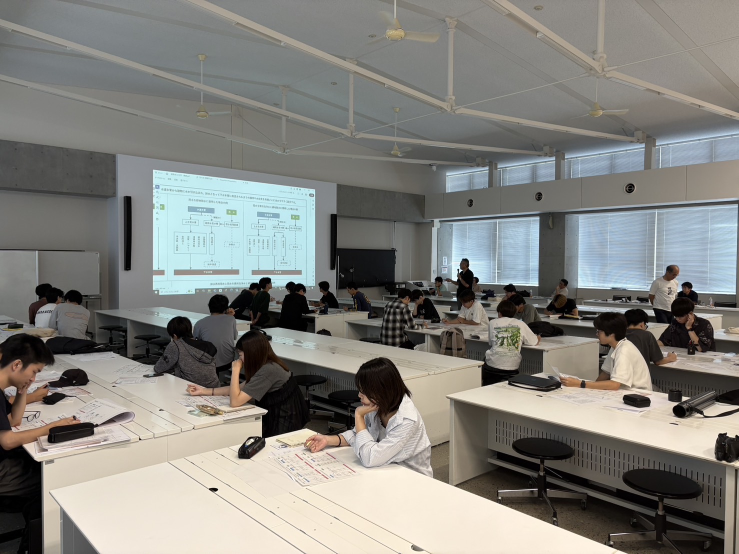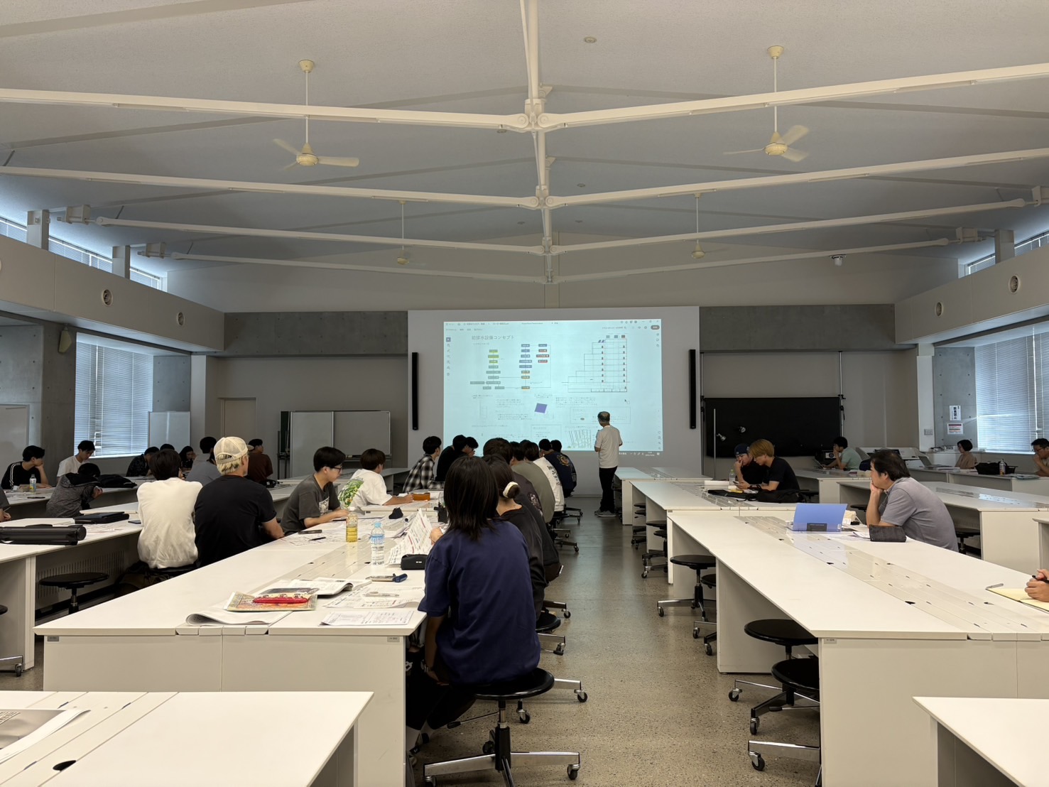 2025年10月6日(月)、第2回目の「建築環境デザインスタジオ」の授業が行われました。授業前には前回の課題である図面(建築図一式、環境・設備コンセプト)の提出がありました。