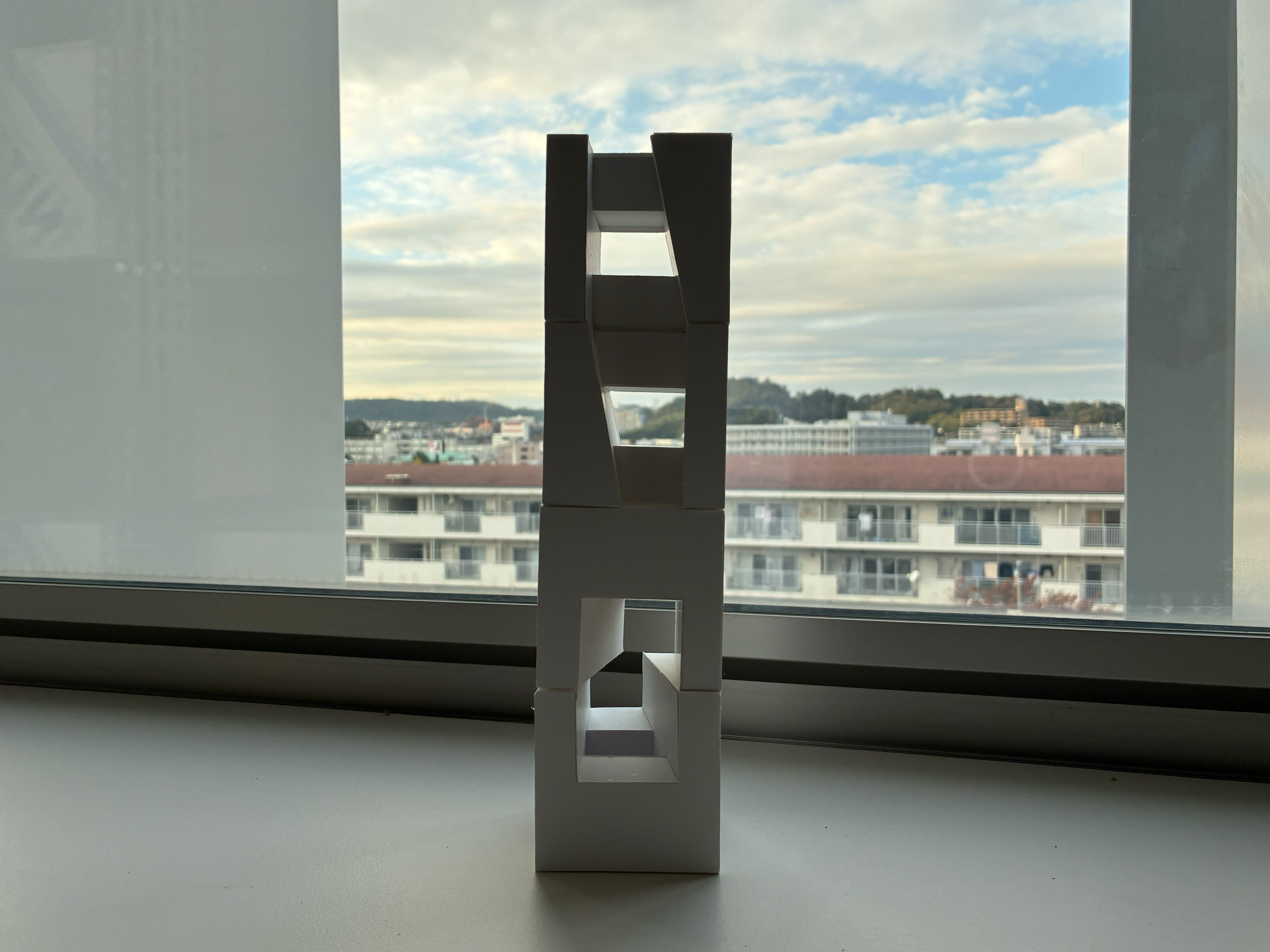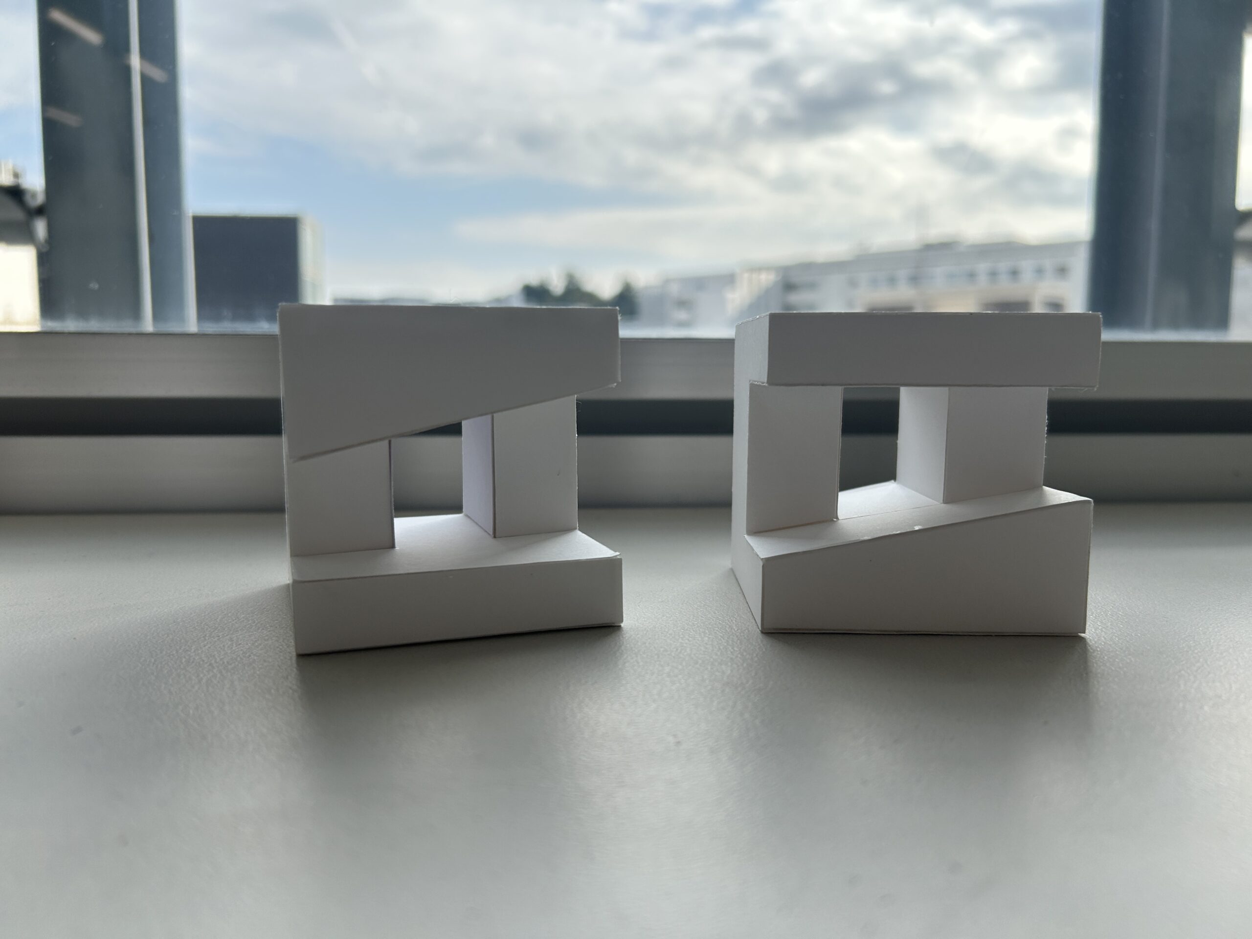 前回までのスコイヤなどの道具の使い方や、面取りの仕方など習得したワザをこのテストで思う存分発揮している一方、カッターの刃を変えずに切り口がボロボロになっている残念な学生も一部見受けられました。初回の立方体制作時に比べてスピーディーかつ正確に模型を制作できるようになりましたが、接着剤で汚れる。細かい部分の面取りができていない。接着面の隙間が開きすぎているなど、実際に作ってみると様々な改善点を発見したと思います。