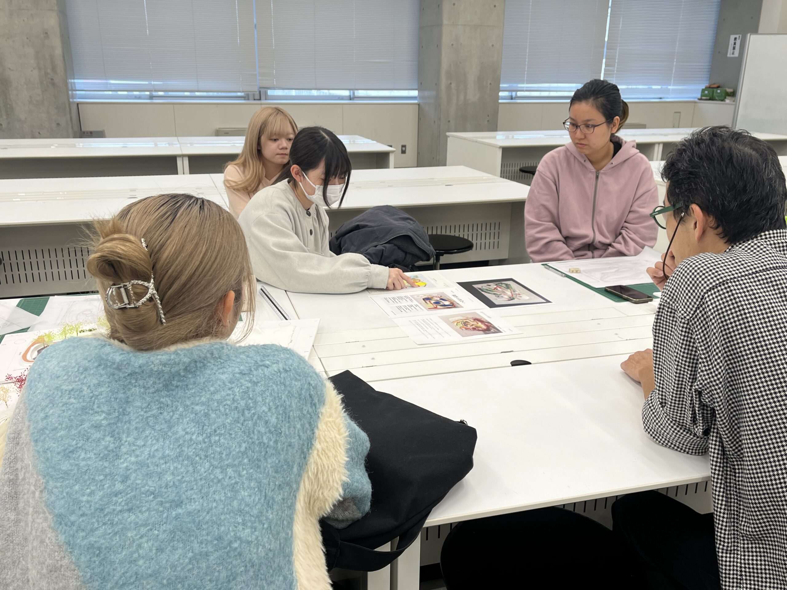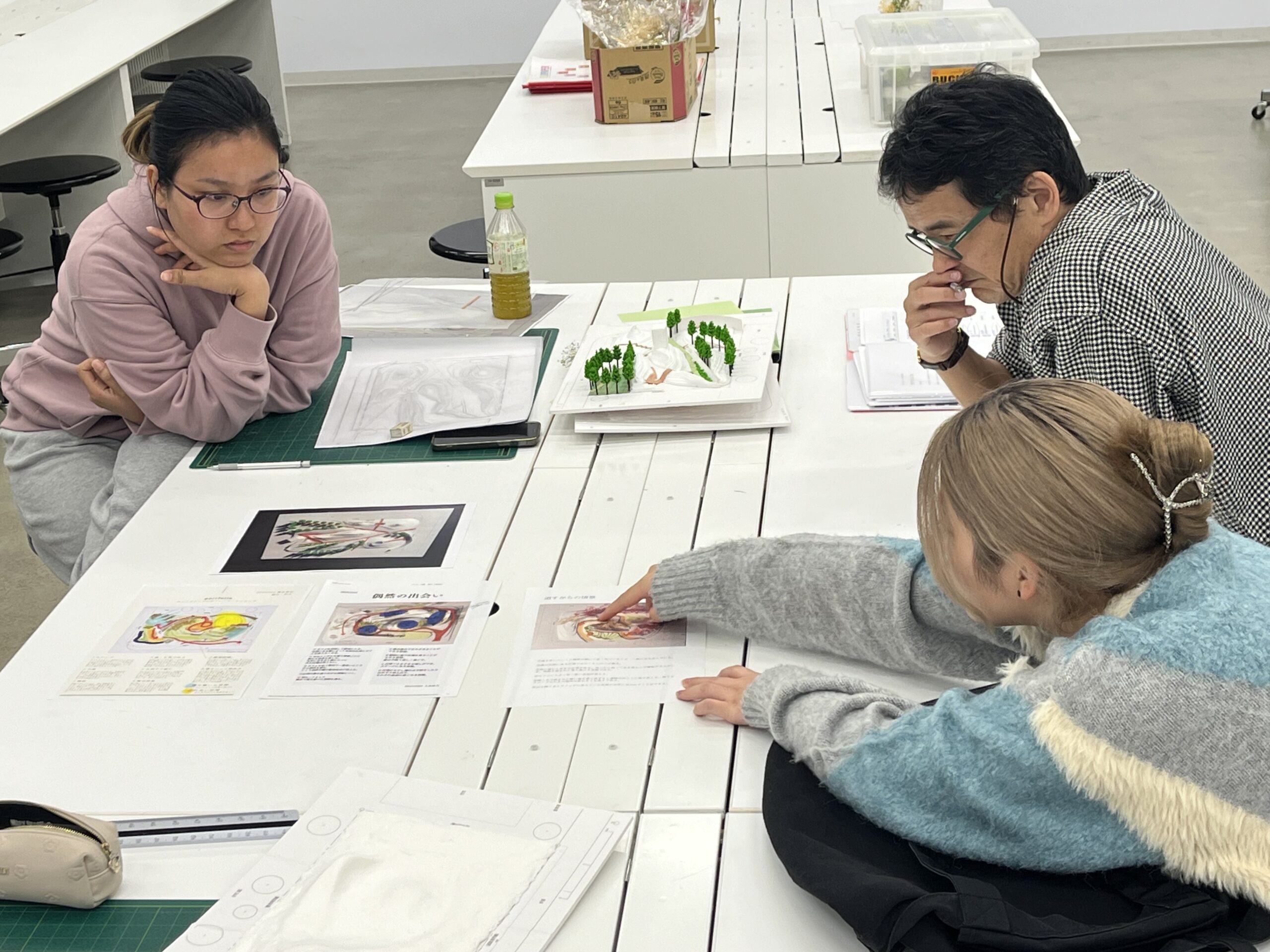 授業の冒頭は、先週までの課題であった「物語と空間の関係パネル」のプレゼンテーションから始まりました。前回よりも模型の作り込みや図面の書き込みが進んでおり、それぞれのデザインが着実に進化しているのが見て取れました。 先生方からは、コンセプトボード(パネル)のデザインや伝え方について具体的な指摘がありました。例えば、「断面ダイアグラムと説明文はセットで見せる」「意図を伝える矢印の太さ」「文字のフォントや大きさの選び方」など、デザインを的確に伝えるための重要なテクニックを学びました。
