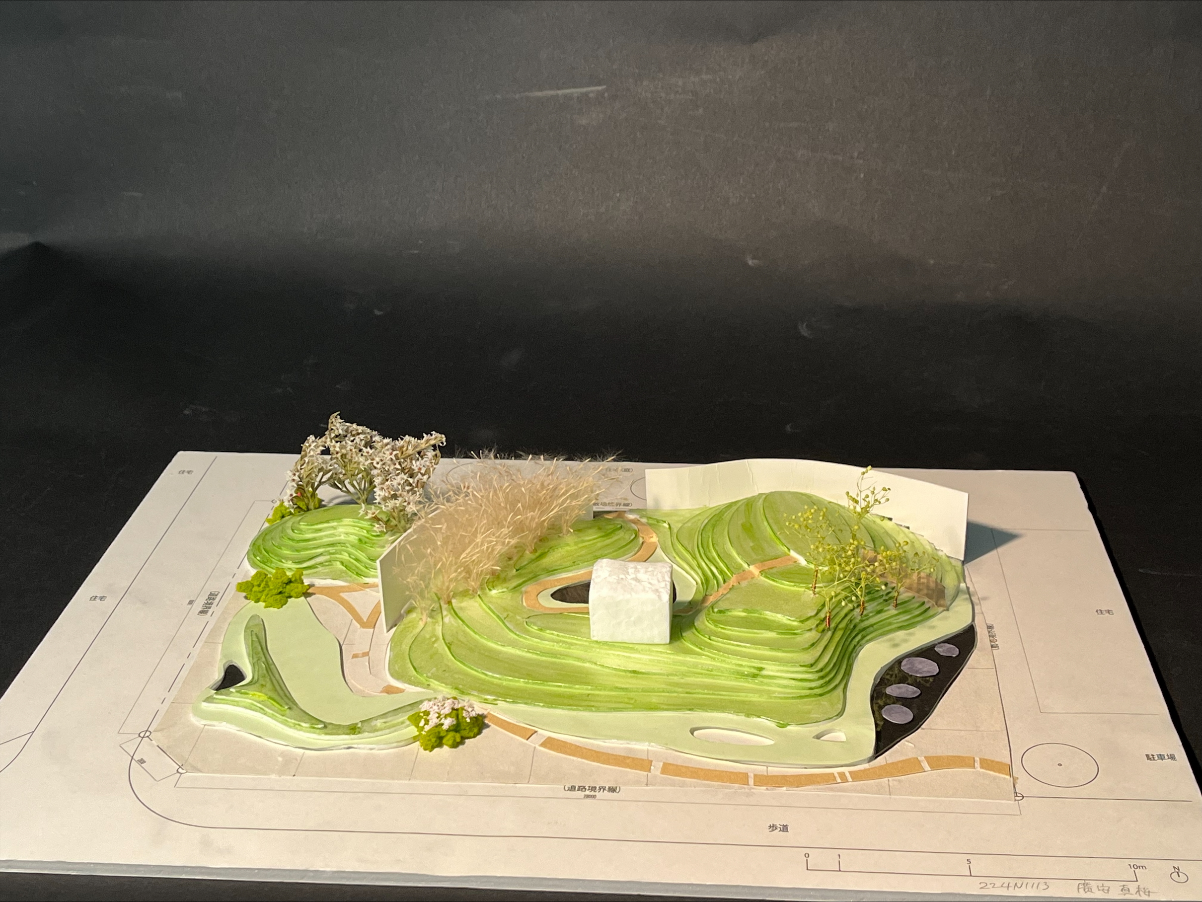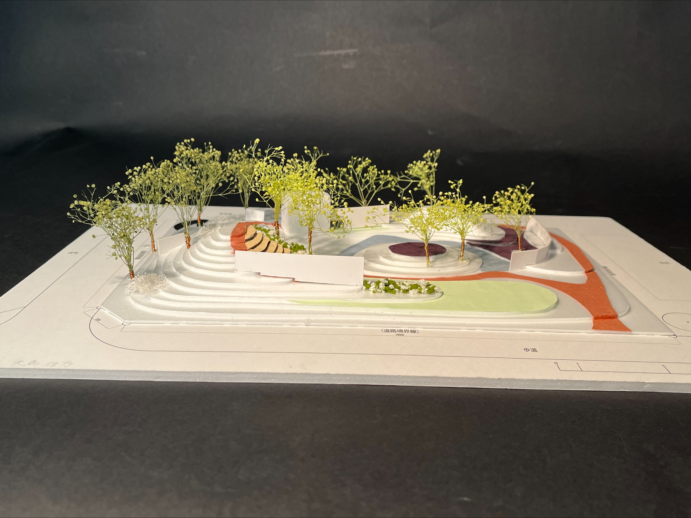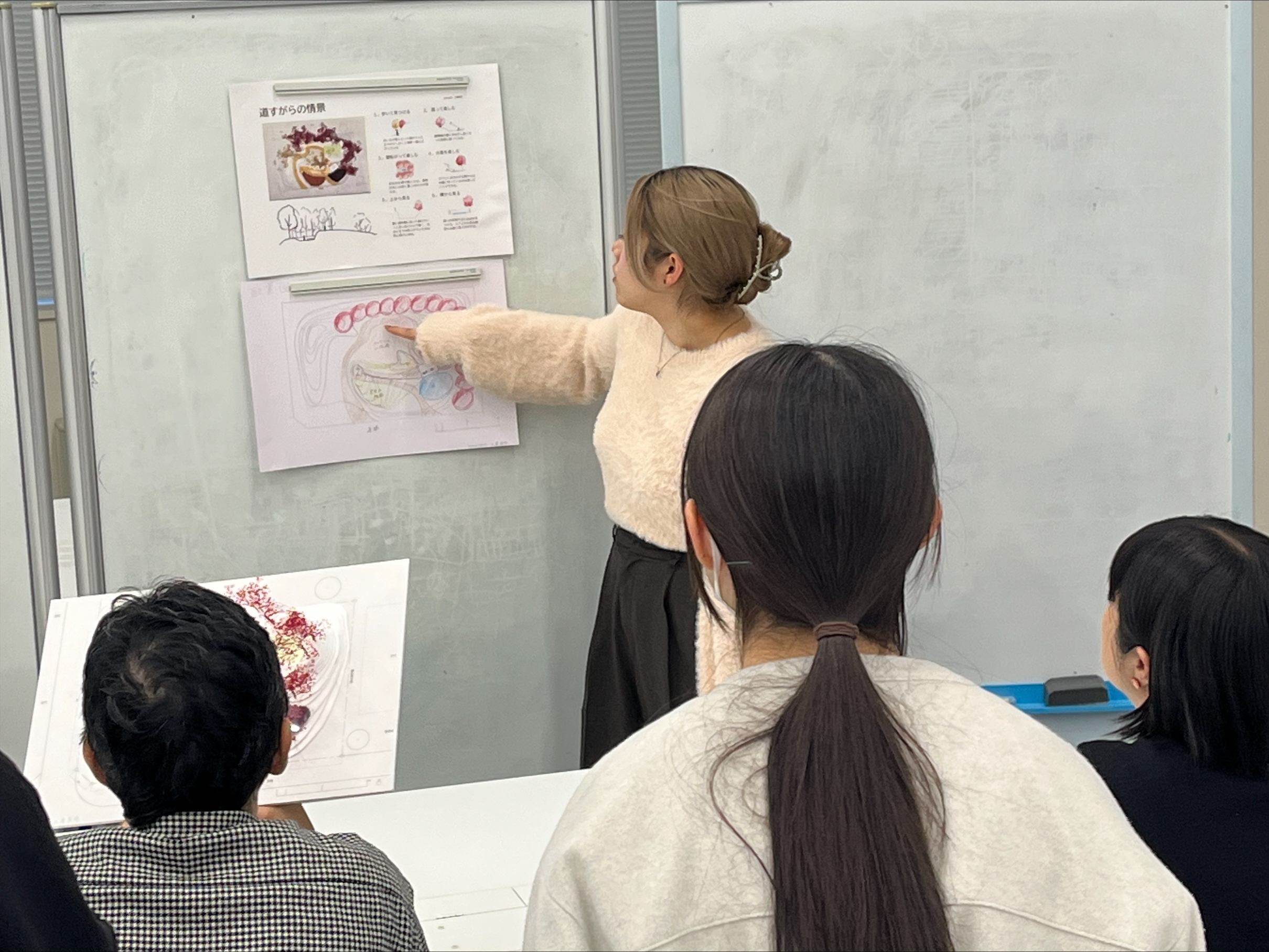 学生の発表の中には、「シークエンスの流れと、途中で見え隠れする対象との関係」、「地面の舗装の違いによる心情の変化」、「子どもの遊びを想定した空間」、「木陰での人のふるまい」、「建物と地形の関係」という、これまでに授業で扱ってきたテーマについて深く考察し、設計に反映されていることが伝わってきました。