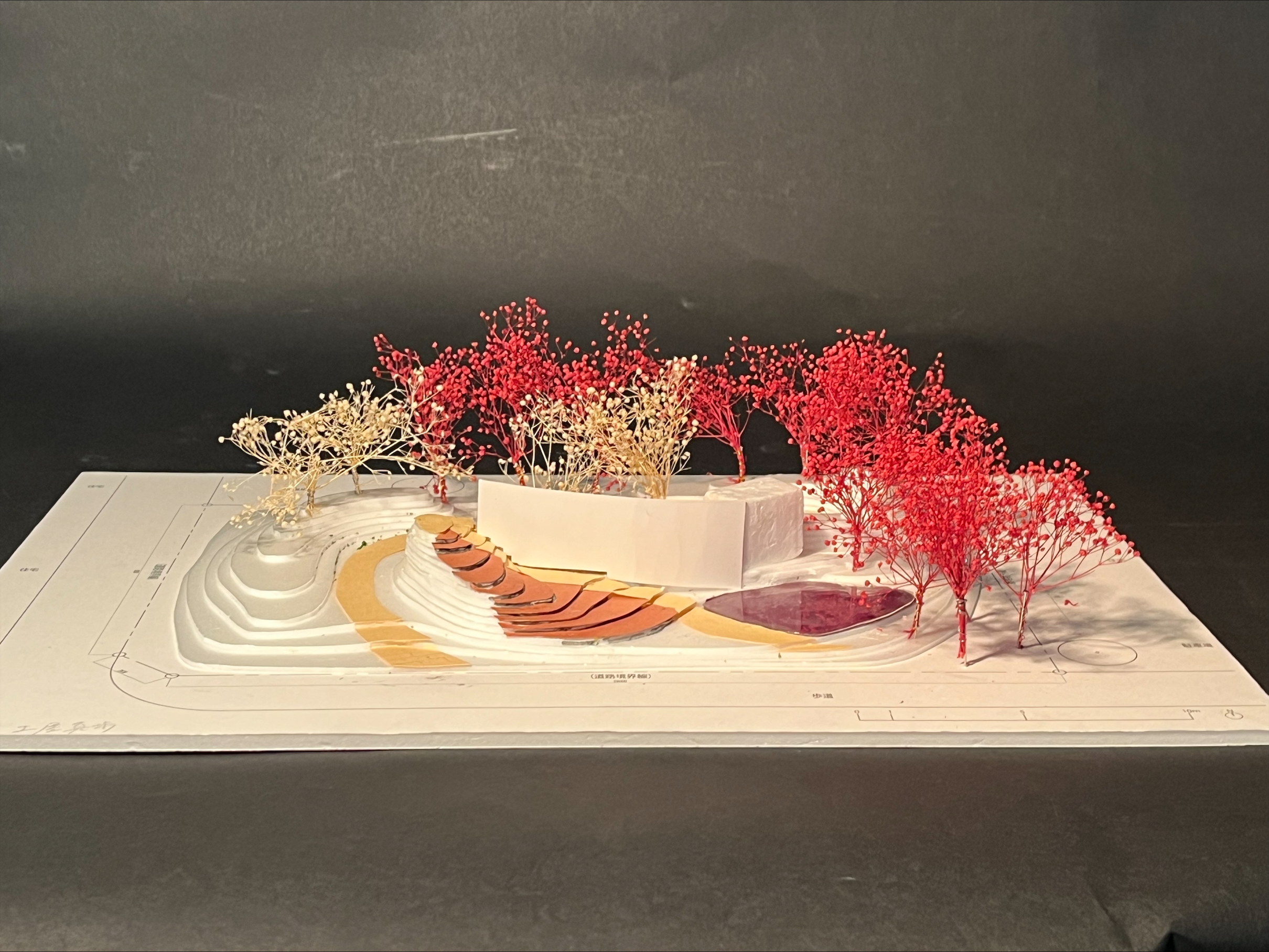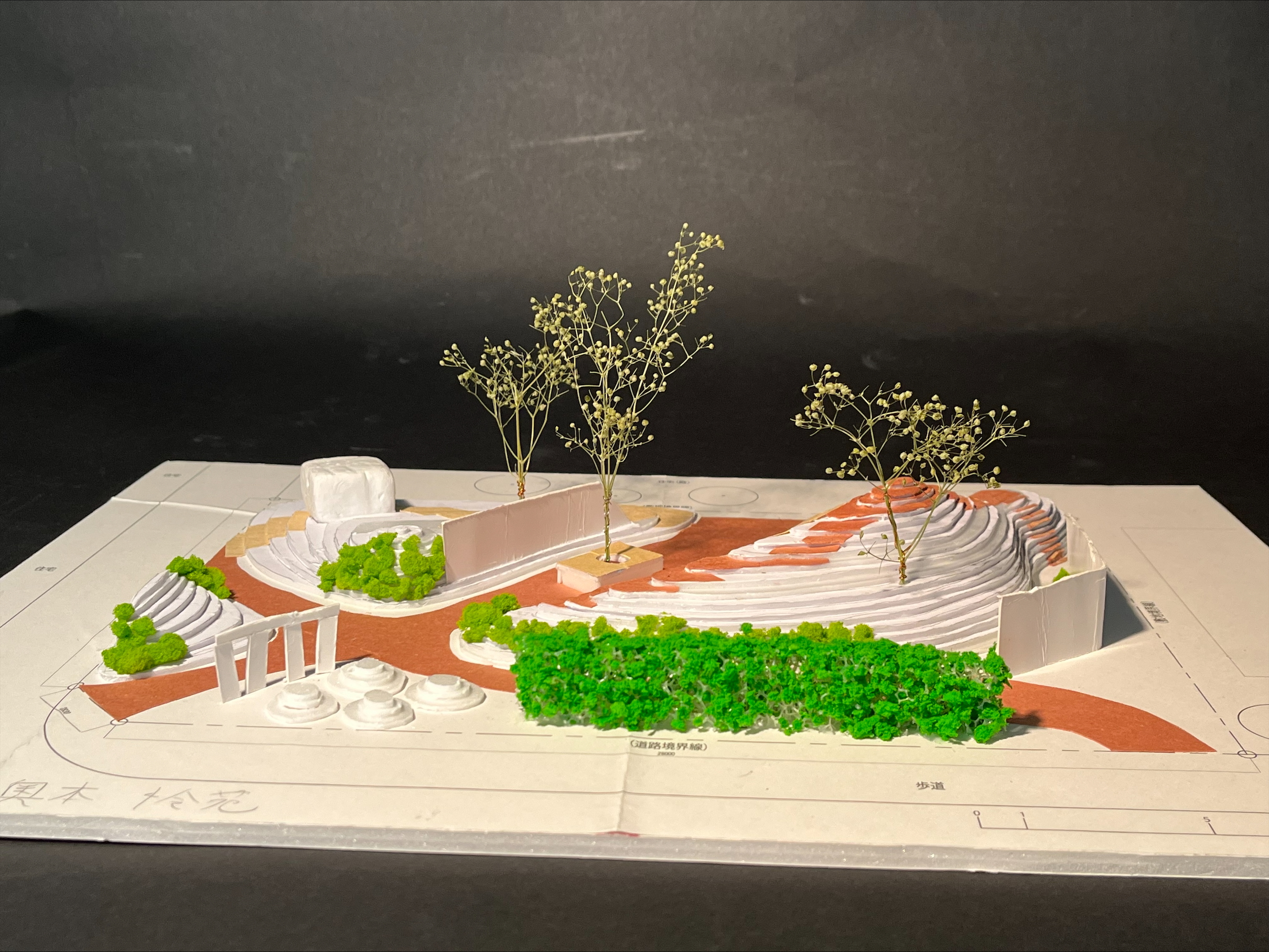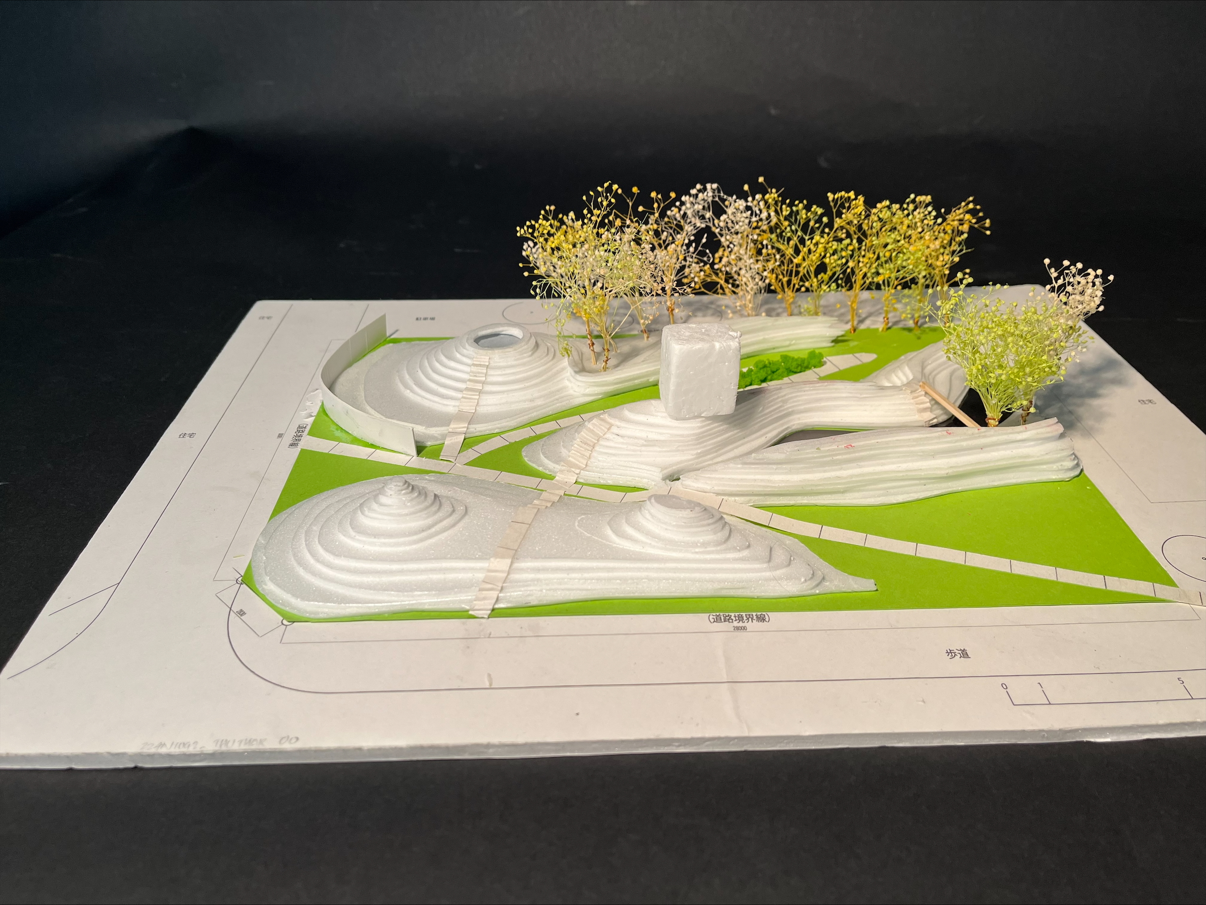 学生の発表の中には、「シークエンスの流れと、途中で見え隠れする対象との関係」、「地面の舗装の違いによる心情の変化」、「子どもの遊びを想定した空間」、「木陰での人のふるまい」、「建物と地形の関係」という、これまでに授業で扱ってきたテーマについて深く考察し、設計に反映されていることが伝わってきました。