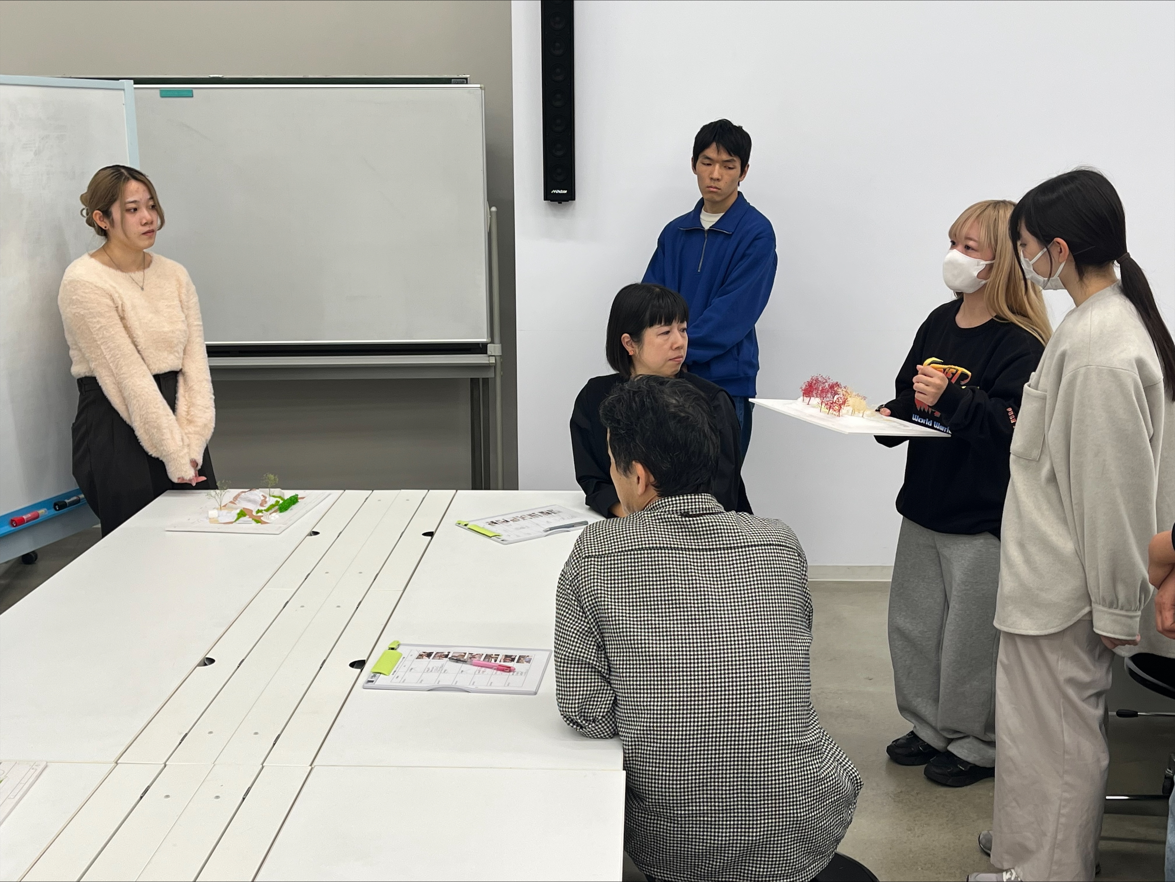 今回は、第1回~第6回までの「小さな公園」プロジェクトの講評会です。学生たちは作成したプレゼンシートと模型を使いながら、「物語」と「デザイン」について発表してくれました。