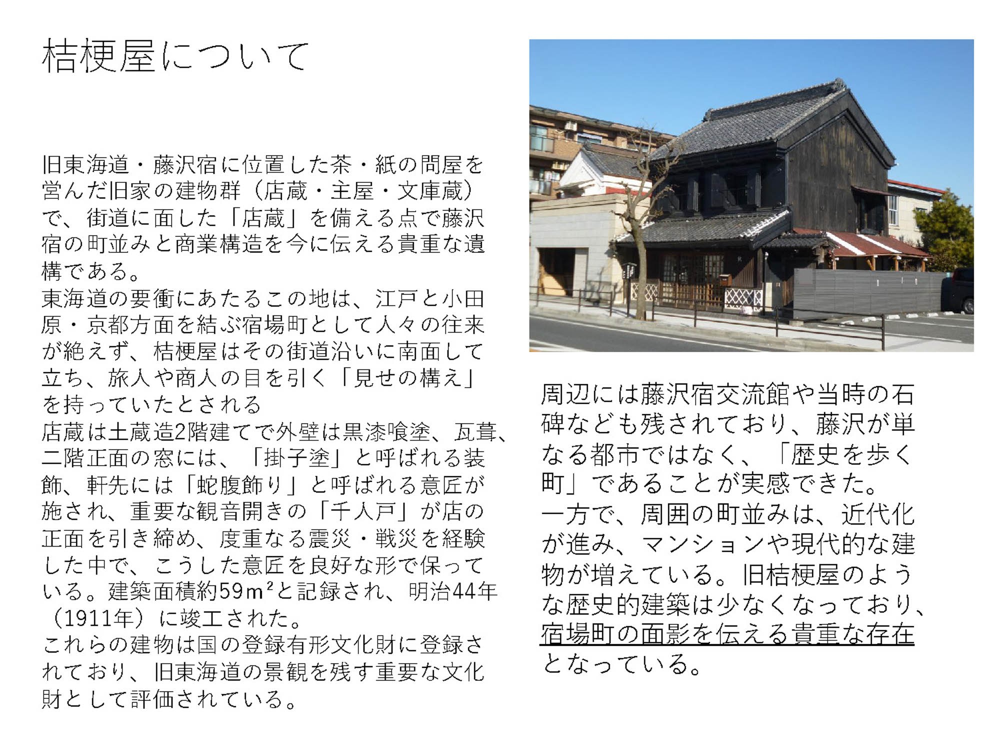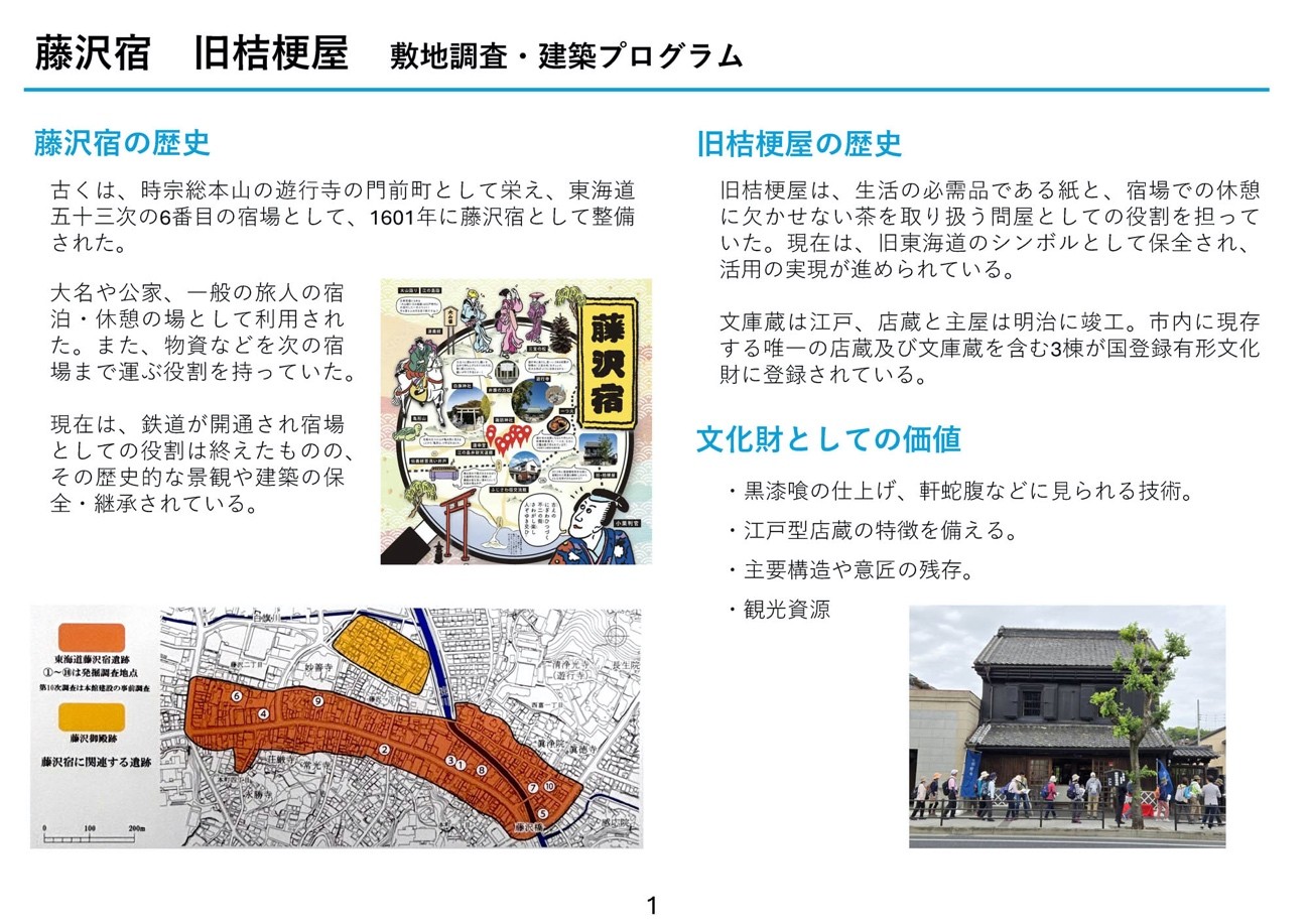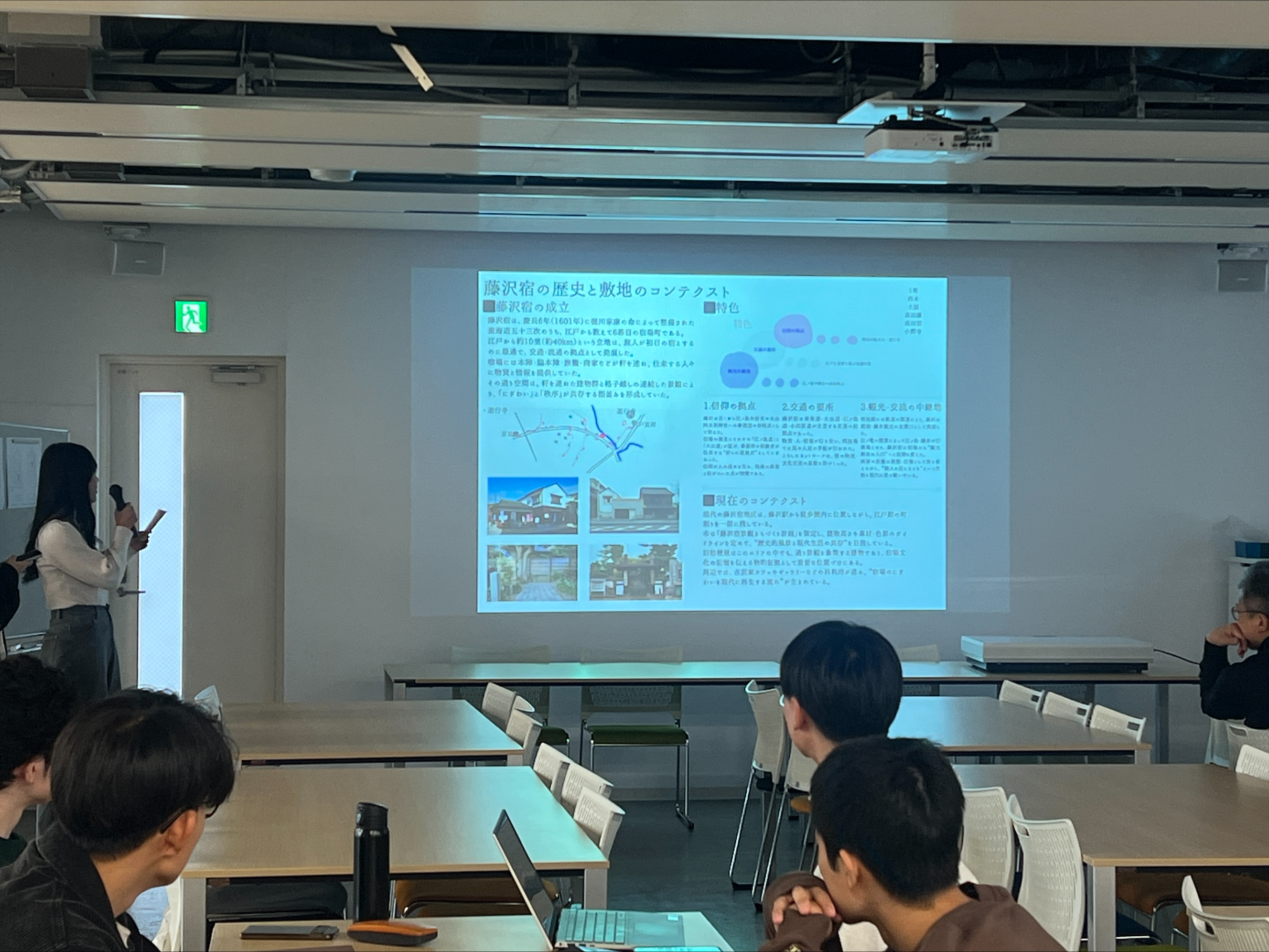 藤沢宿の歴史や特色、オーセンティシティについて調査した成果を述べると共に、旧桔梗屋の再生・利活用のためのプログラムを発表しました。