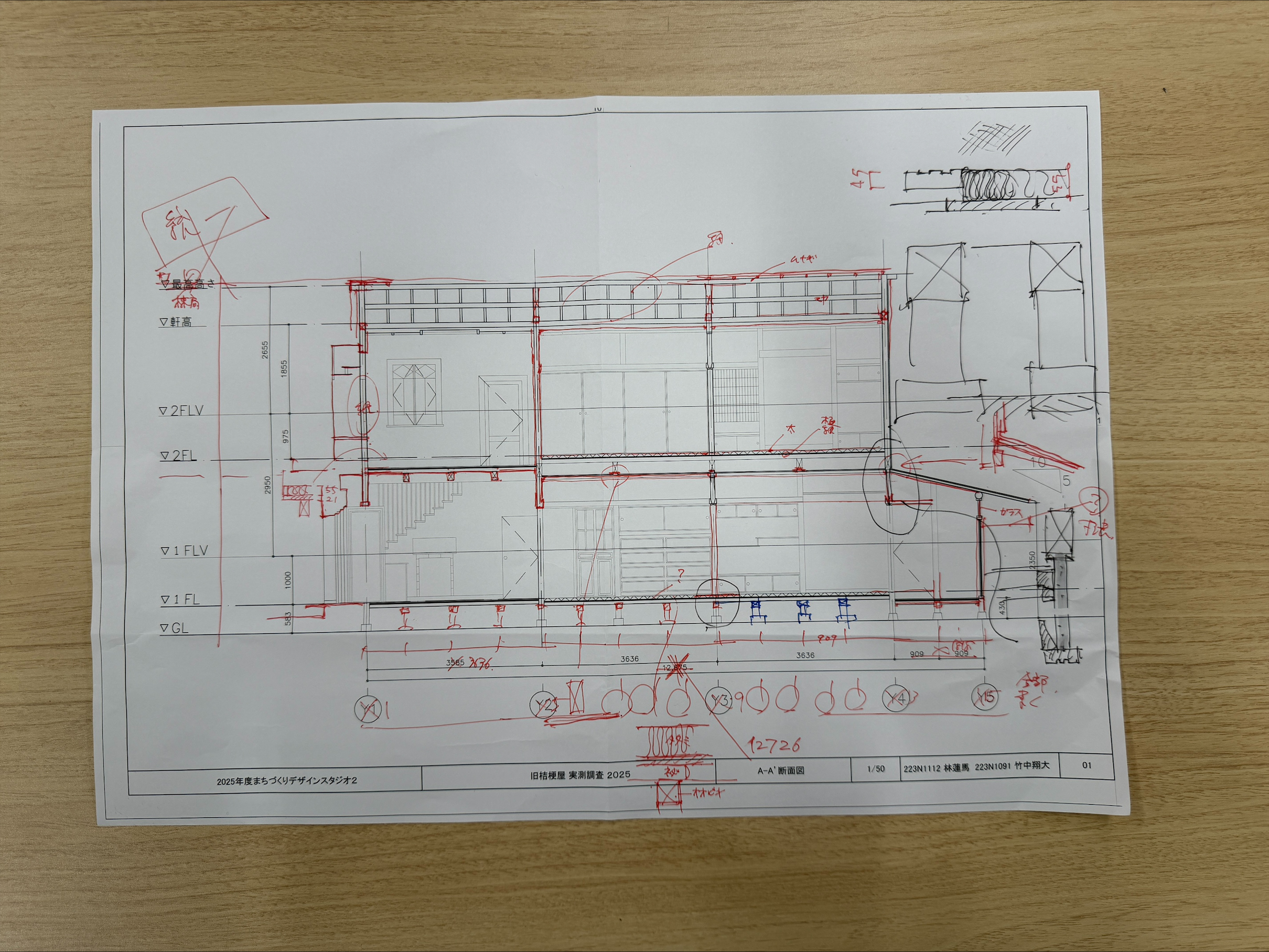 各班、先生方と最終確認を行いました。まだ作成できていない箇所や長さなど分からない部分は、野帳や実測調査の際に撮影した写真、各班の図面を見ながら確認しましょう。