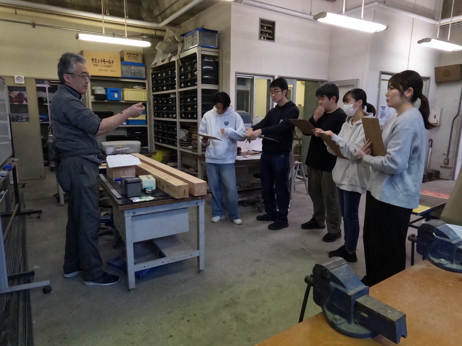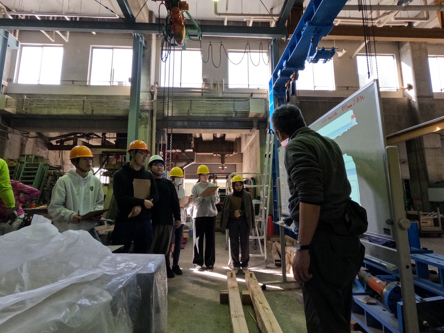 授業の初めに、木製梁に加力した際の力学的な原理についての解説がありました。曲げモーメント、せん断力などの基本的な理論を学び、実験に使用するマツとスギの2種類の木材の特性を理解しました。