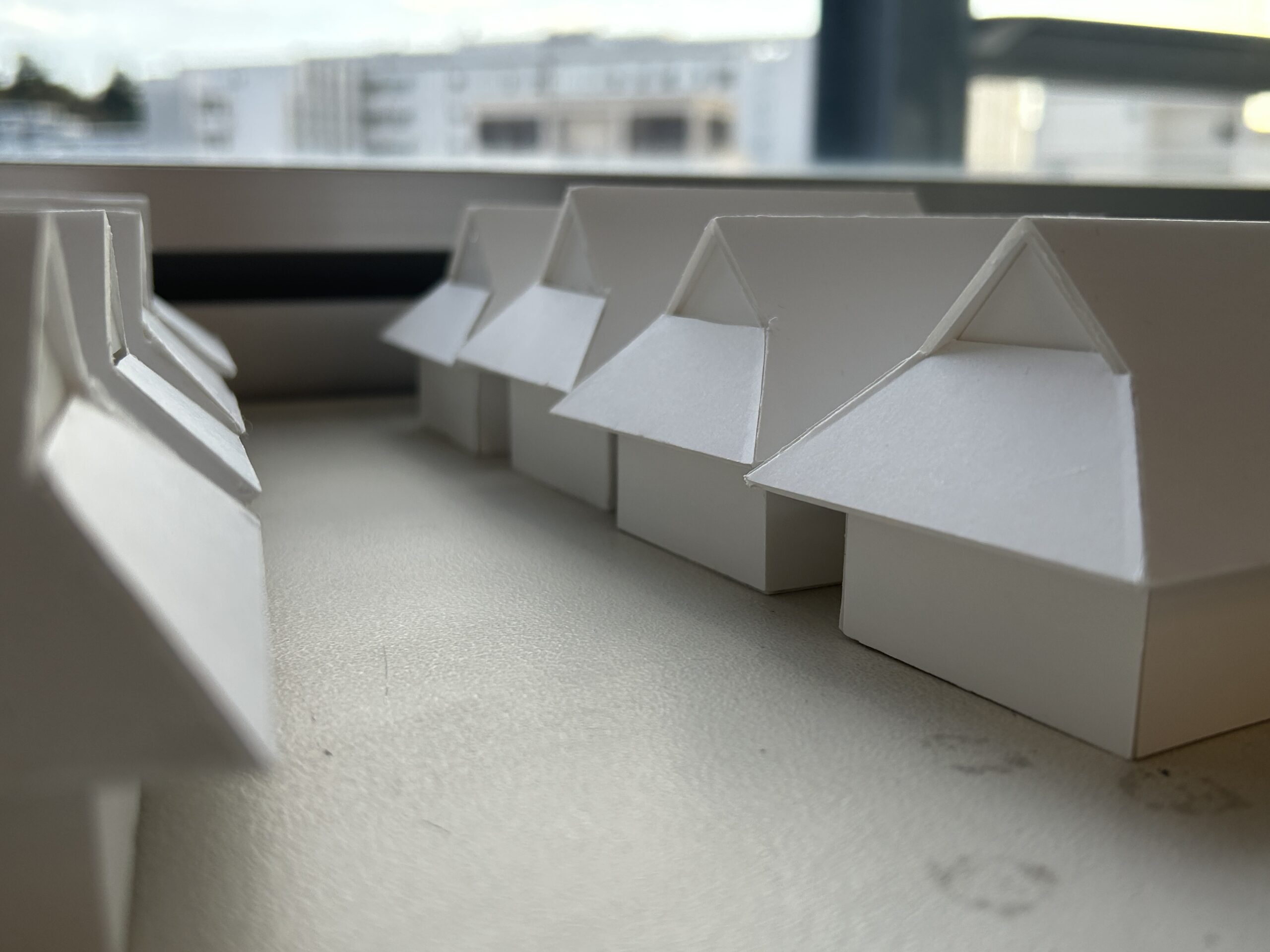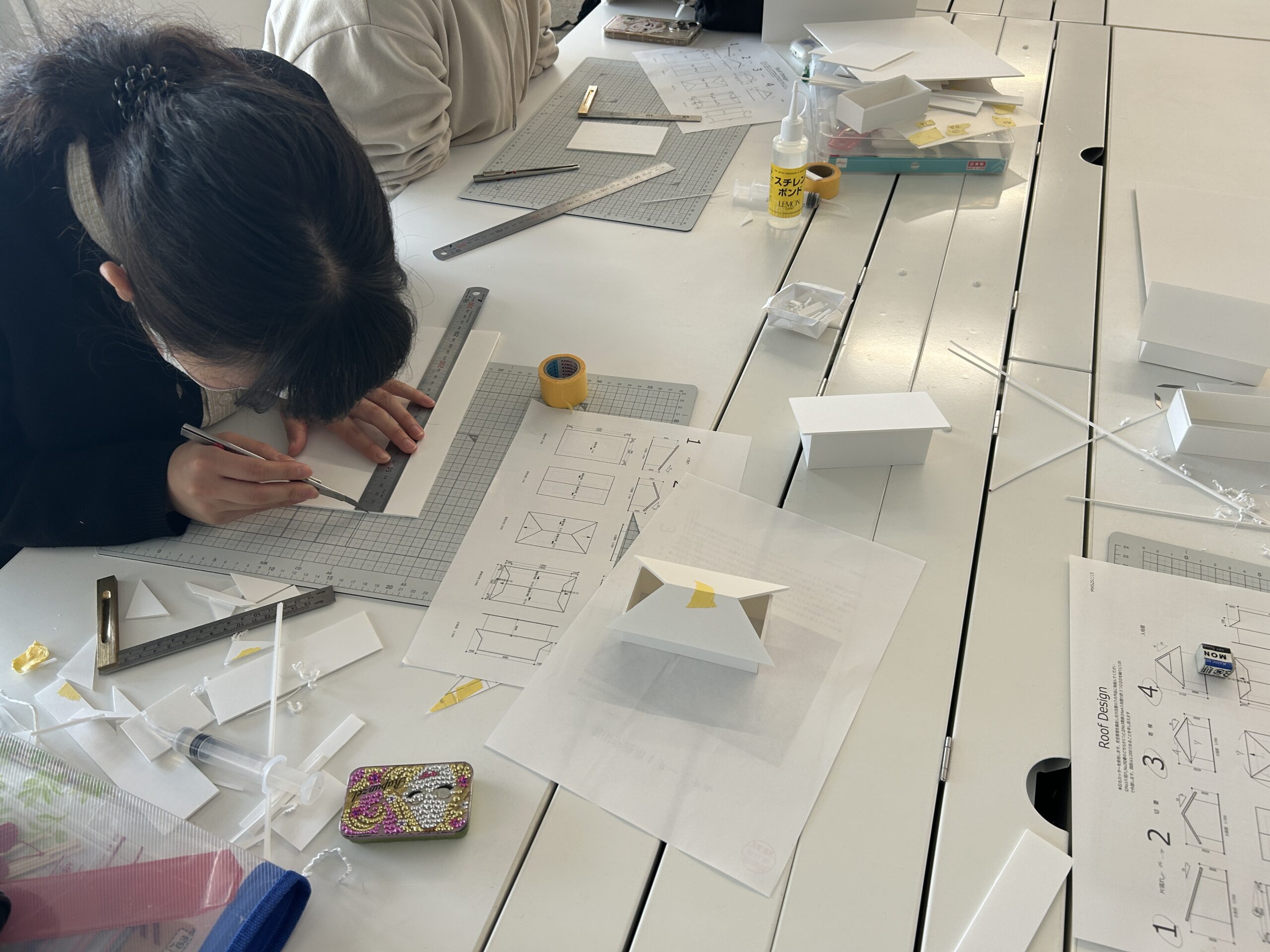 屋根を制作するにあたり、勾配や屋根の寸法に対して苦戦している学生がいましたが、屋根の勾配に合わせた支持材を入れることや、マスキングテープを使用して勾配の形状を保ちながら、他の屋根の構成材を合わせて切るなど、工夫をしながら模型製作に取り組んでいました。