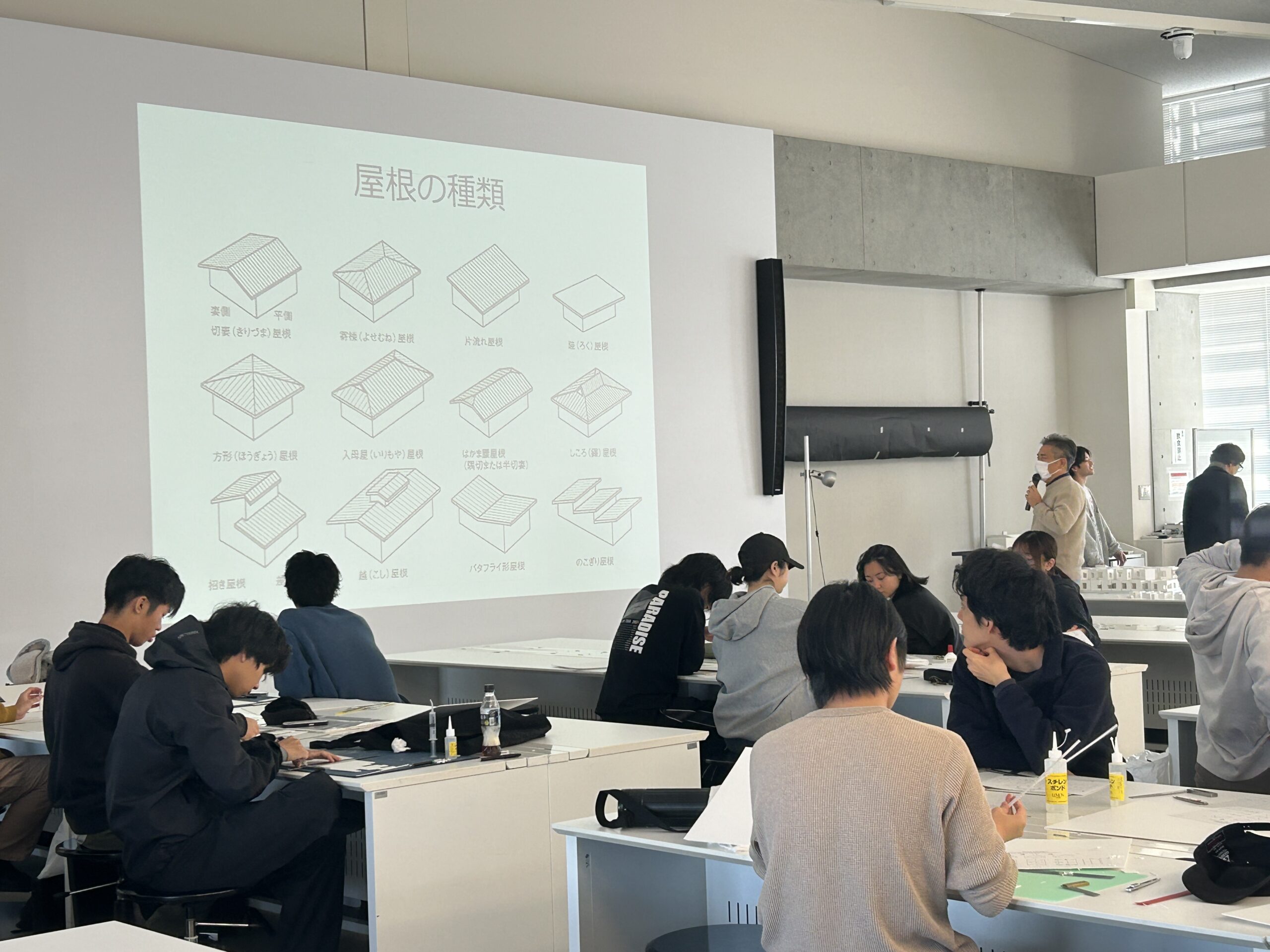 次に、今回の本題である屋根の形状について、さまざまな屋根を先生に解説をいただきました。今回はその屋根の中から片流れ、切妻、寄棟、入母屋の4種類の屋根を模型で表現しました。また屋根の形状として馴染みのない入母屋については、先生から事例を交えた解説がありました。