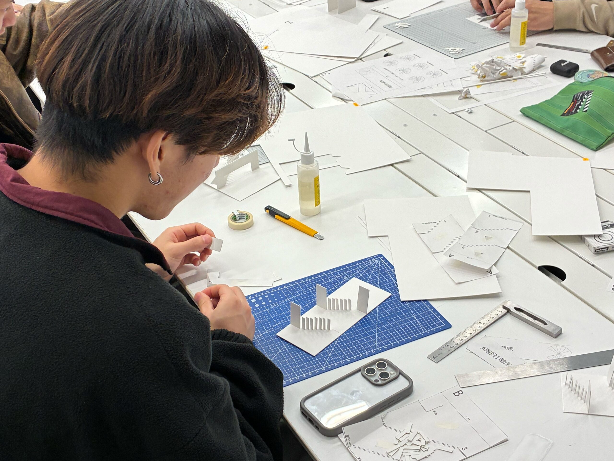 一般的にはスプレーのりを使い図面をスチレンボードに貼り切断するのですが、今回は敢えて使わず、エコの視点からマスキングテープを使う方法を体験しました。先生からマスキングテープは作業に支障のないような場所(切断箇所を避けて)に貼ることや、踏面の位置がわかるようにカッターで印をつけることで模型が綺麗に出来てしまうというレクチャーがありました。