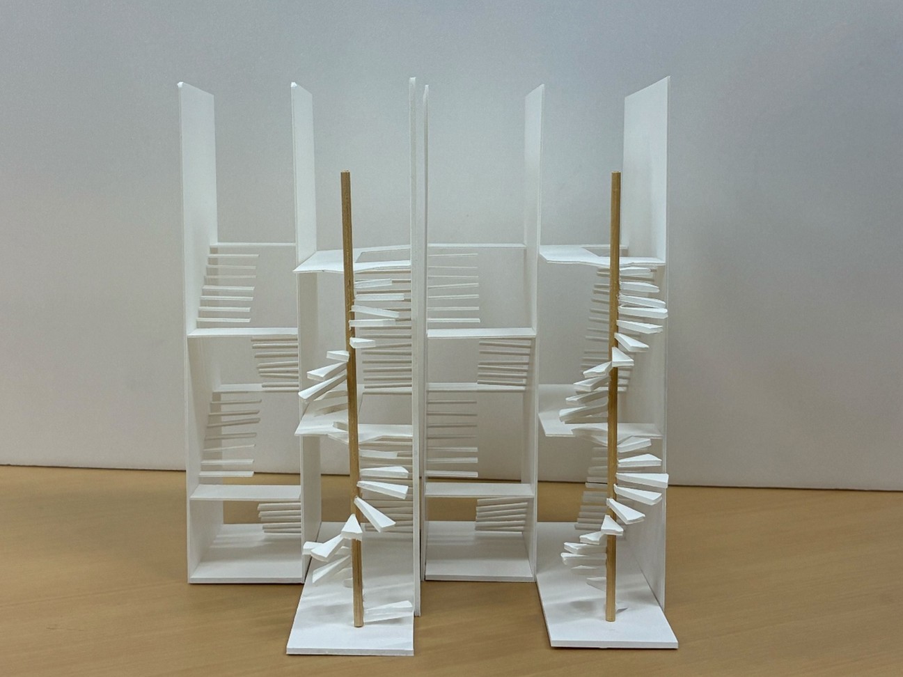 今回の課題では、多くの学生が直階段と折り返しの製作に時間を取られ、螺旋階段まで完成している学生が少なかったですが、模型の水平、垂直を意識した美しい模型を作り上げていくことも重要になります。今までの先生からレクチャーを忘れずに効率良く、模型の精度も意識しながら、手を動かしていきましょう!