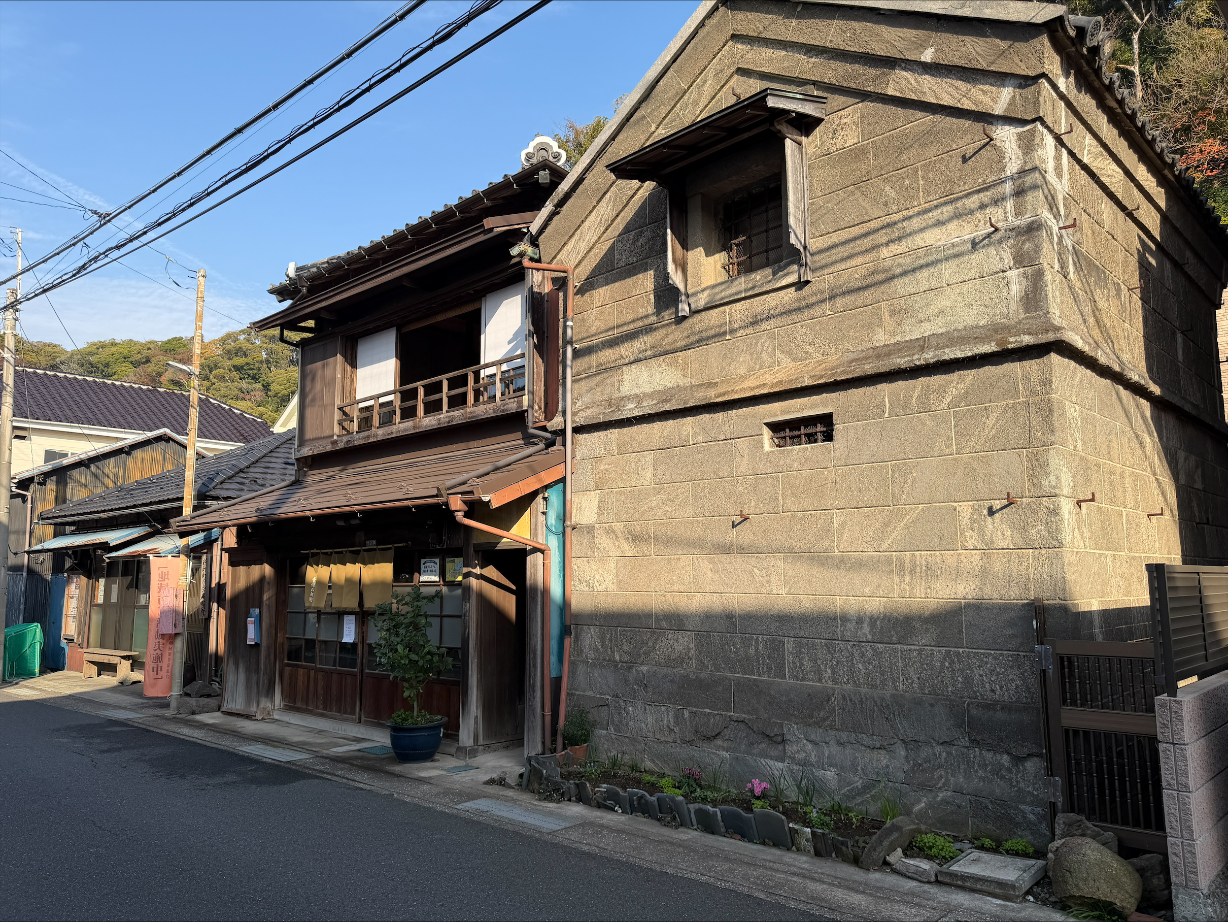 始めに、東浦賀にある歴史的な商屋と石蔵の建物である幸保邸を見学しました。幸保邸は2023年度のまちづくりデザインスタジオ2で対象とした古民家で、大正期の石倉と商家が合わさったつくりです。耐震改修された建物は現在、大変人気のある味噌工房として活用されています。詳しくは当時の授業ブログをご覧下さい。