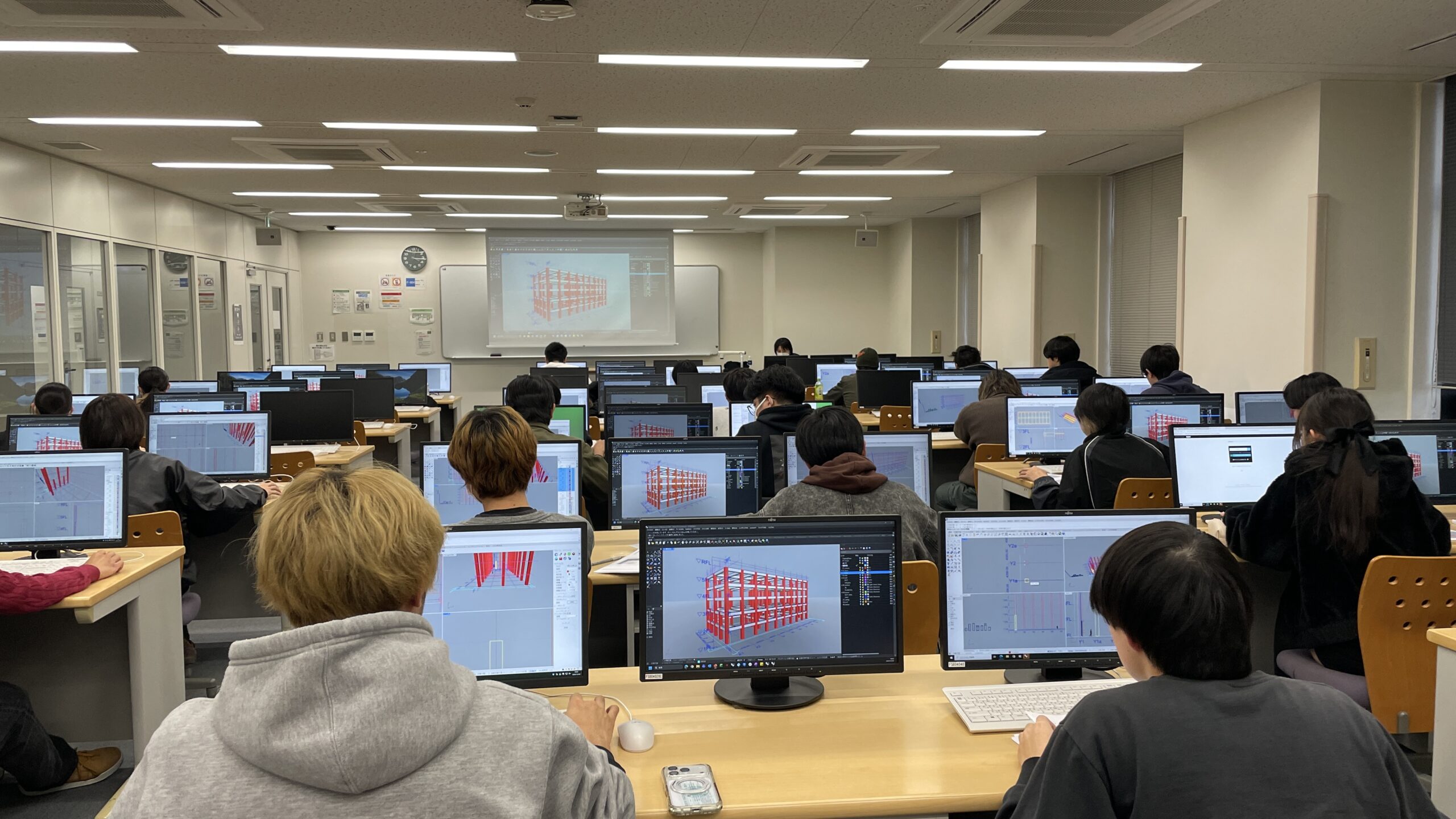 2025.12.9(火)10回目となる今回の授業では、授業でよく使用している関東学院大学金沢八景キャンパス5号館(建築・環境棟)のモデリングを通して、構造・環境デザインを学びました。5号館の平面図のRhinoデータを基にモデリング実践に取り組みました。今回は、柱・梁・スラブ・壁・張弦梁のモデリングを行いました。