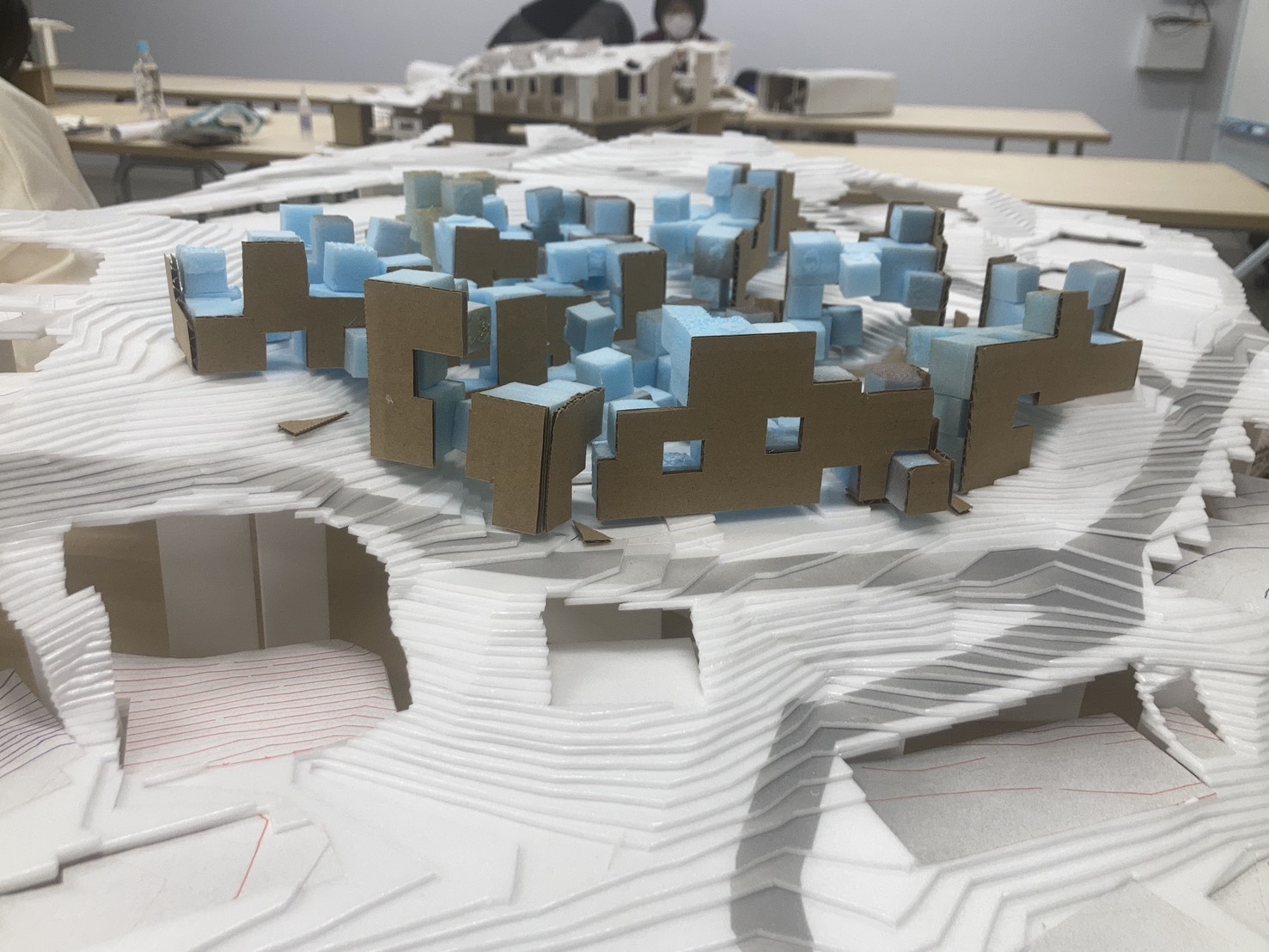前回と同様、各先生たちに別れ、エスキスが行われました。今回で住棟は前回に続き住棟計画のエスキスです。多くの学生が住戸、住棟の計画を数パターン案をだし、模型や図面を用いて表現していました。