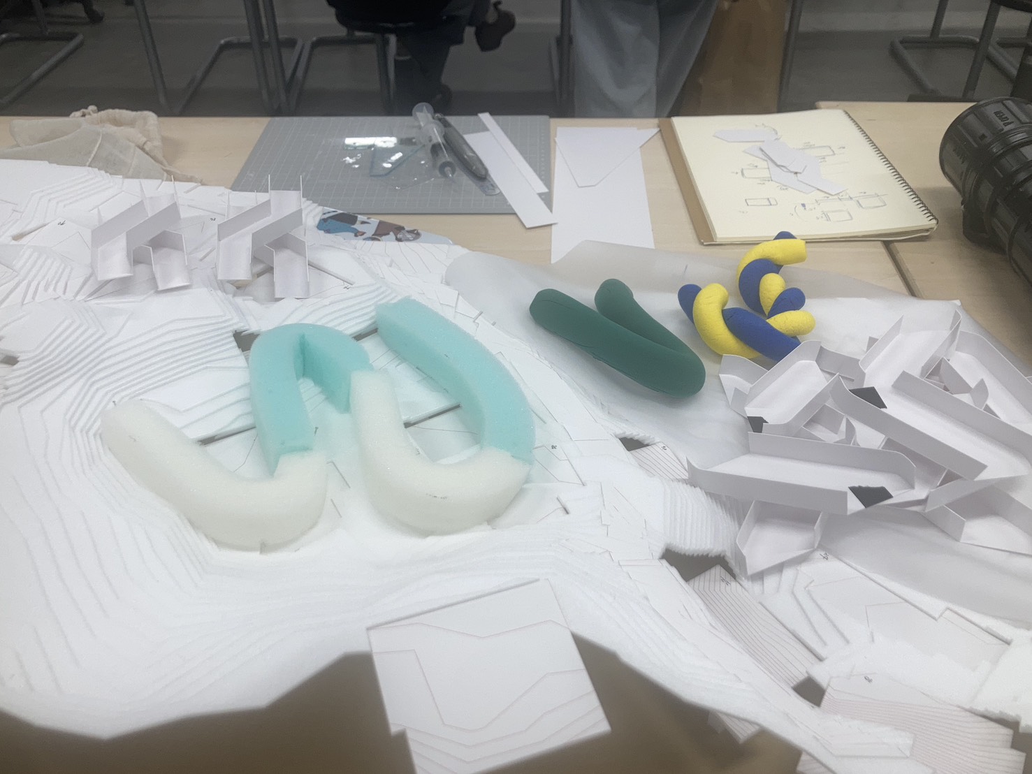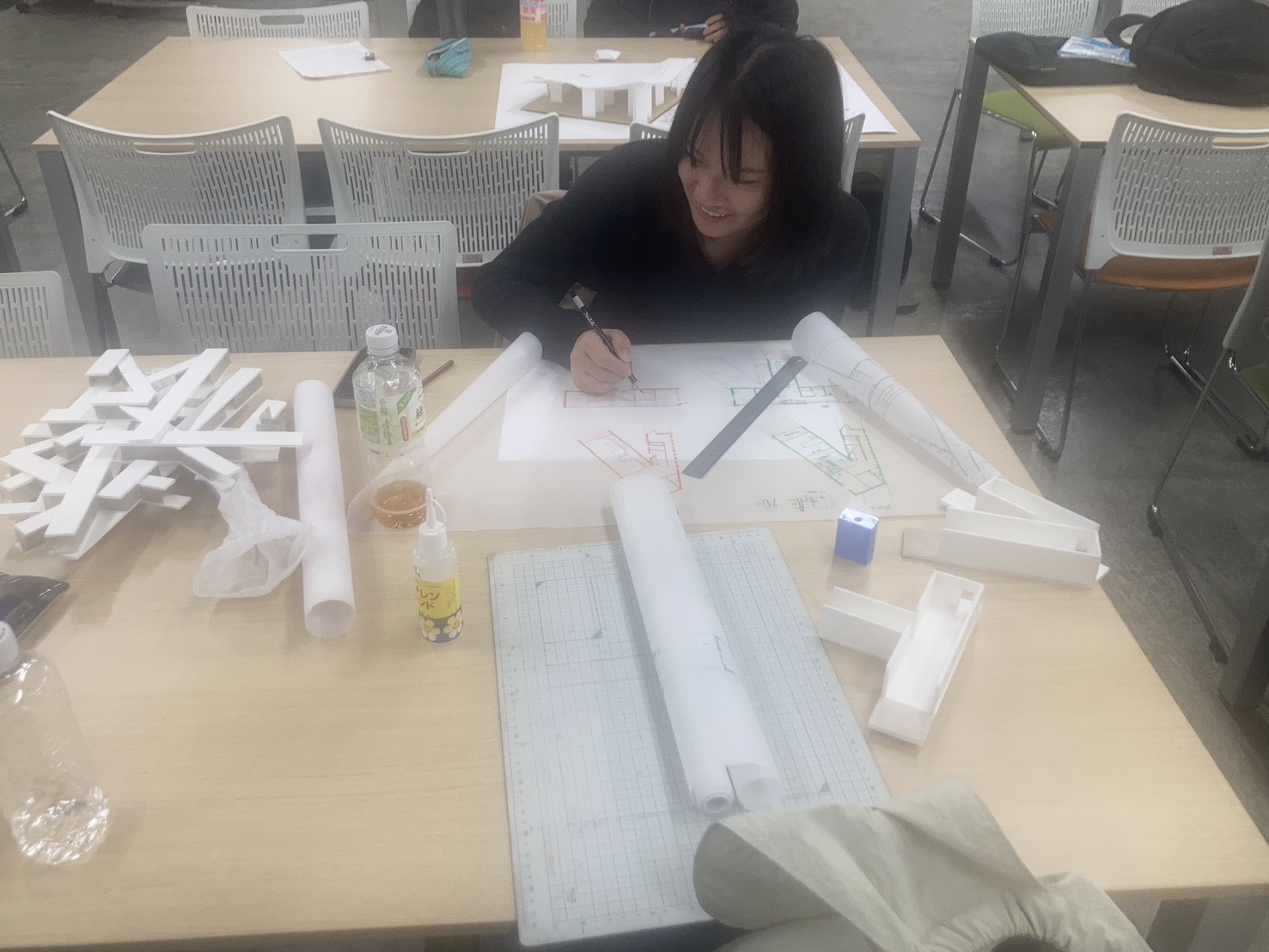 学生たちは、エスキスの待ち時間も模型や図面など、手を動かし有意義に時間を使っていました。