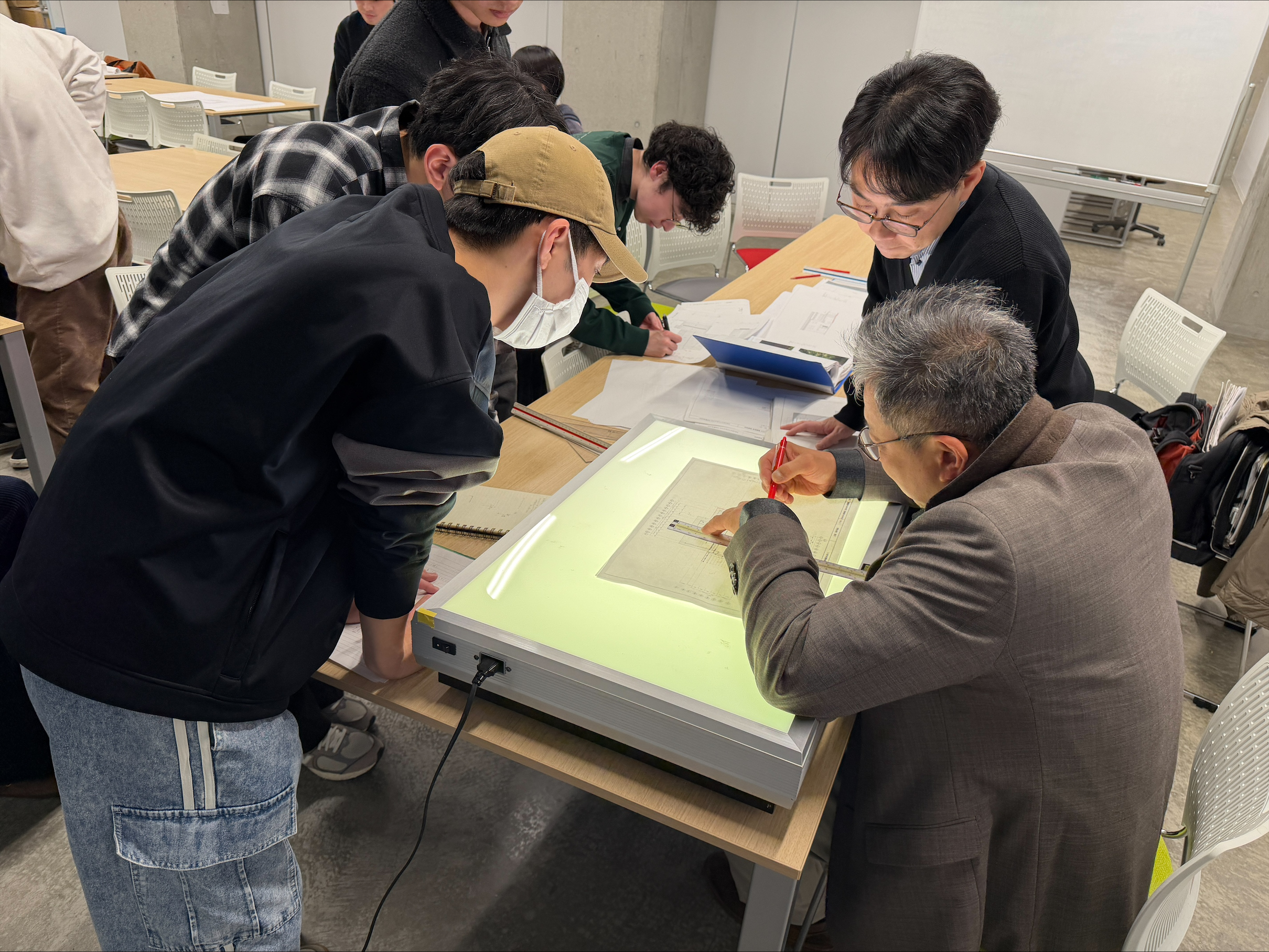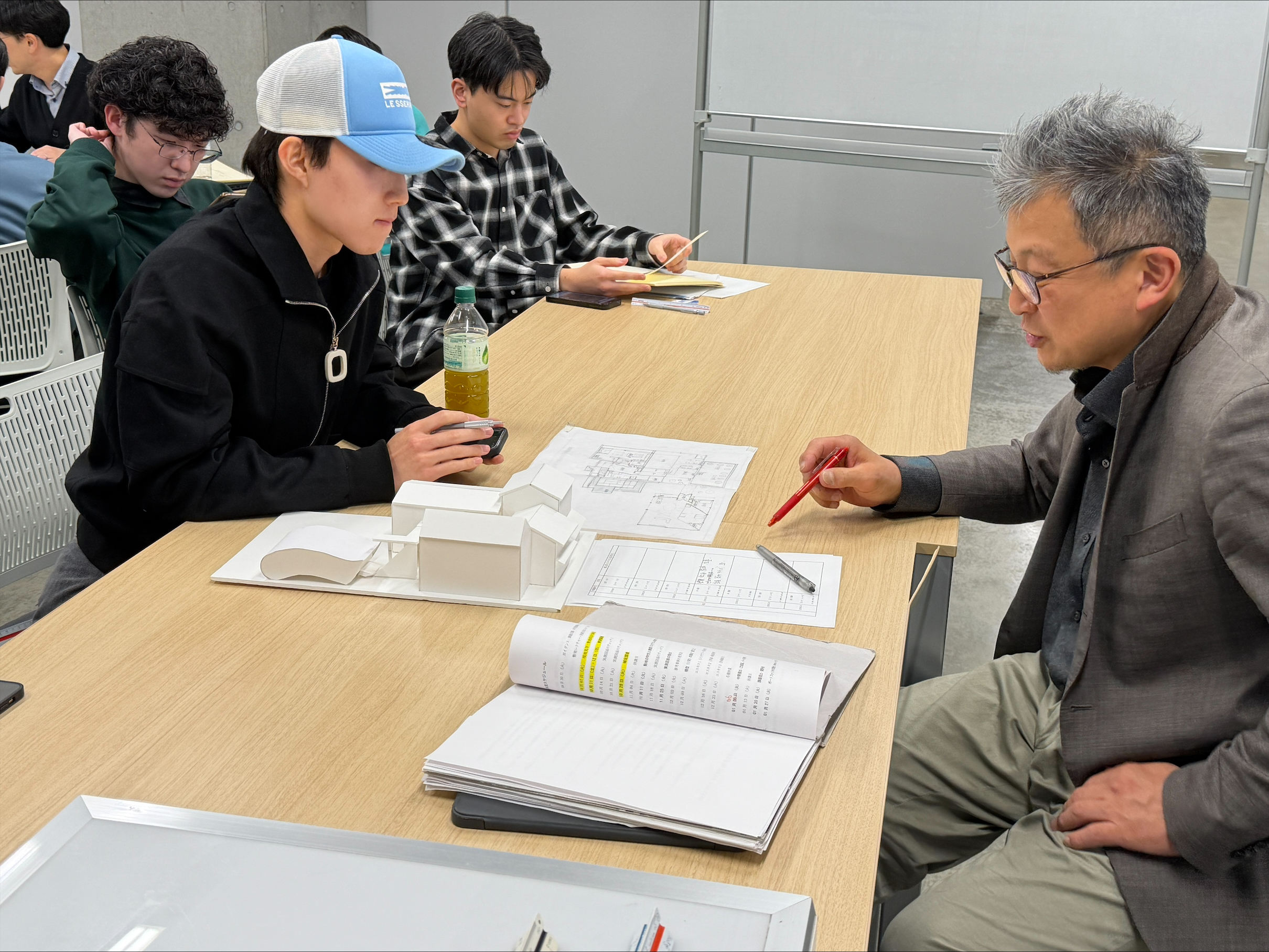 2025年12月23日(火)、まちづくりデザインスタジオ2の第12回の授業が行われました。授業の前半は実測図面のチェック、後半は個人設計のエスキスを行いました。