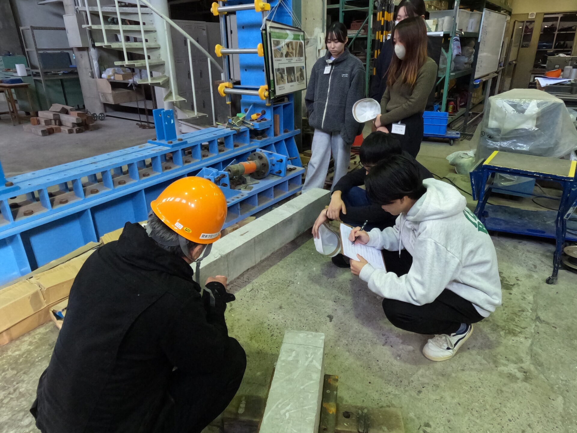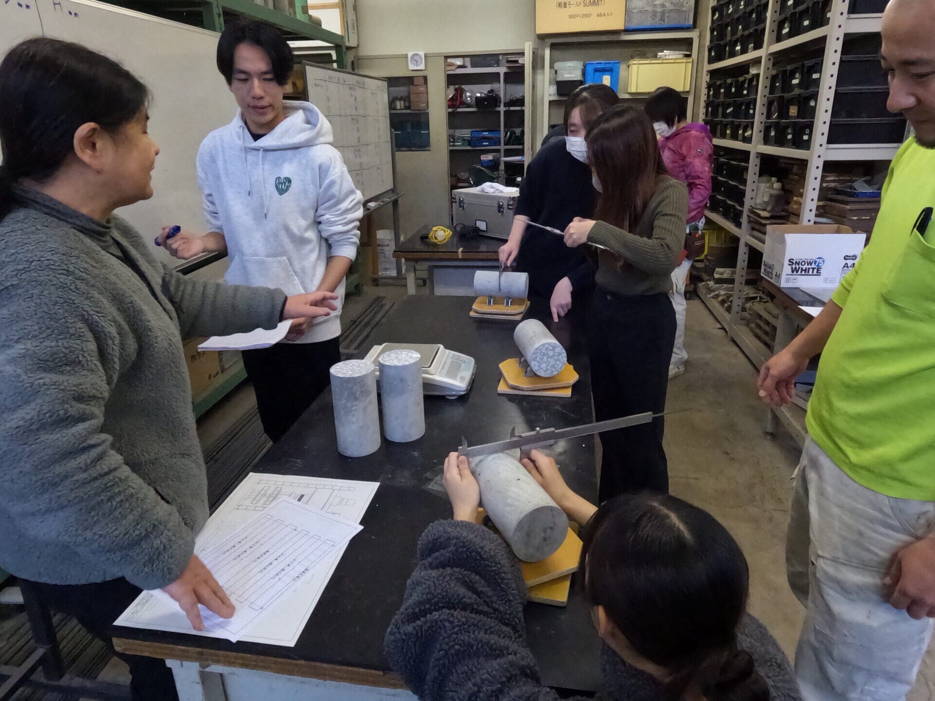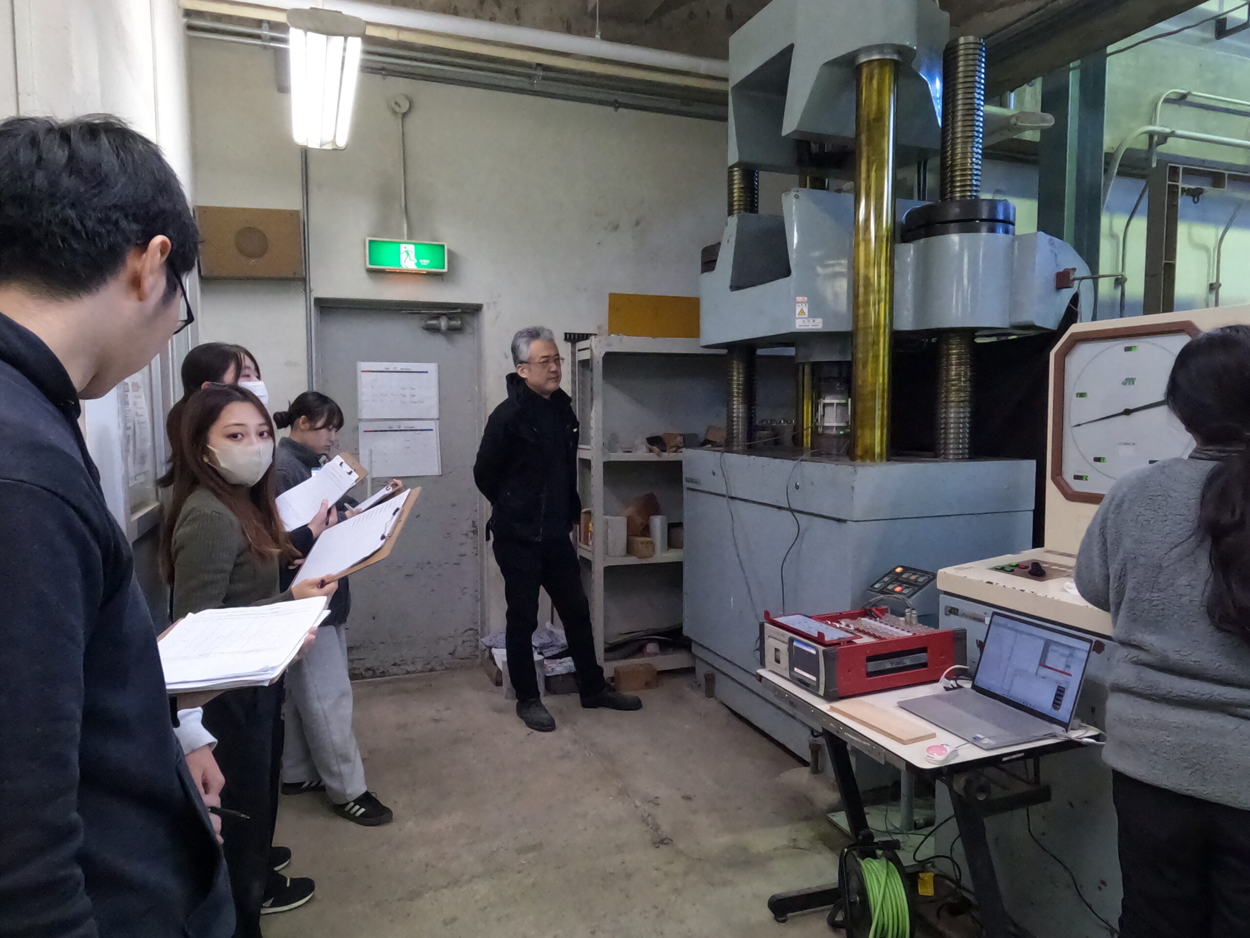 2025年11月28日、EF-109室で第9回の建築構造実験の講義が行われました。11月7日に打設し、3週間に渡って養生した試験体を使い、円形供試体の圧縮・割裂と梁のせん断実験を行いました。