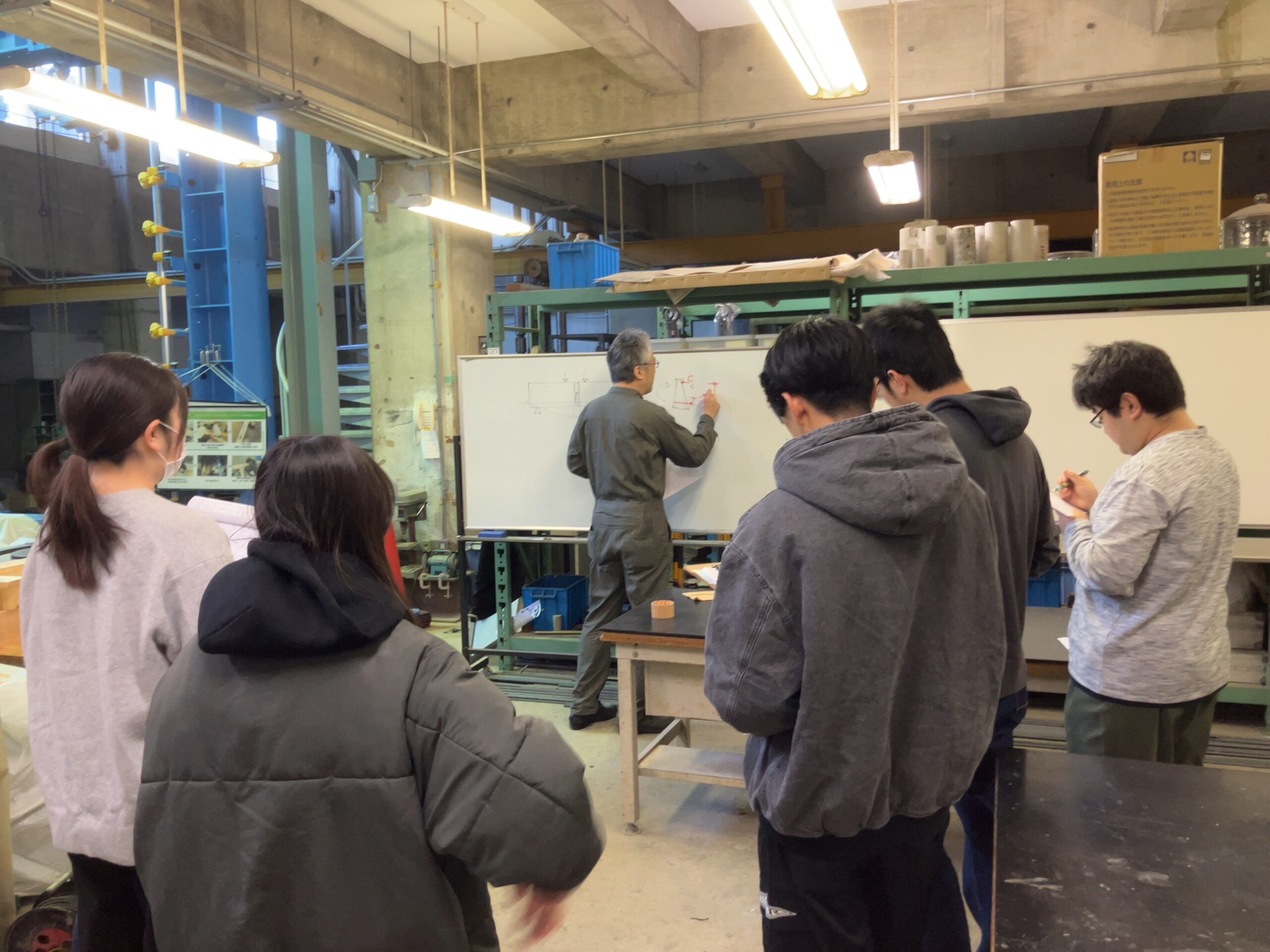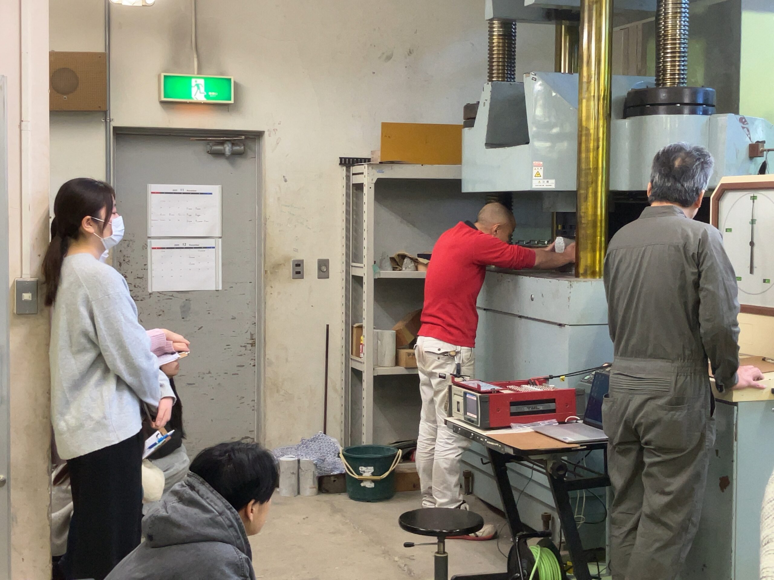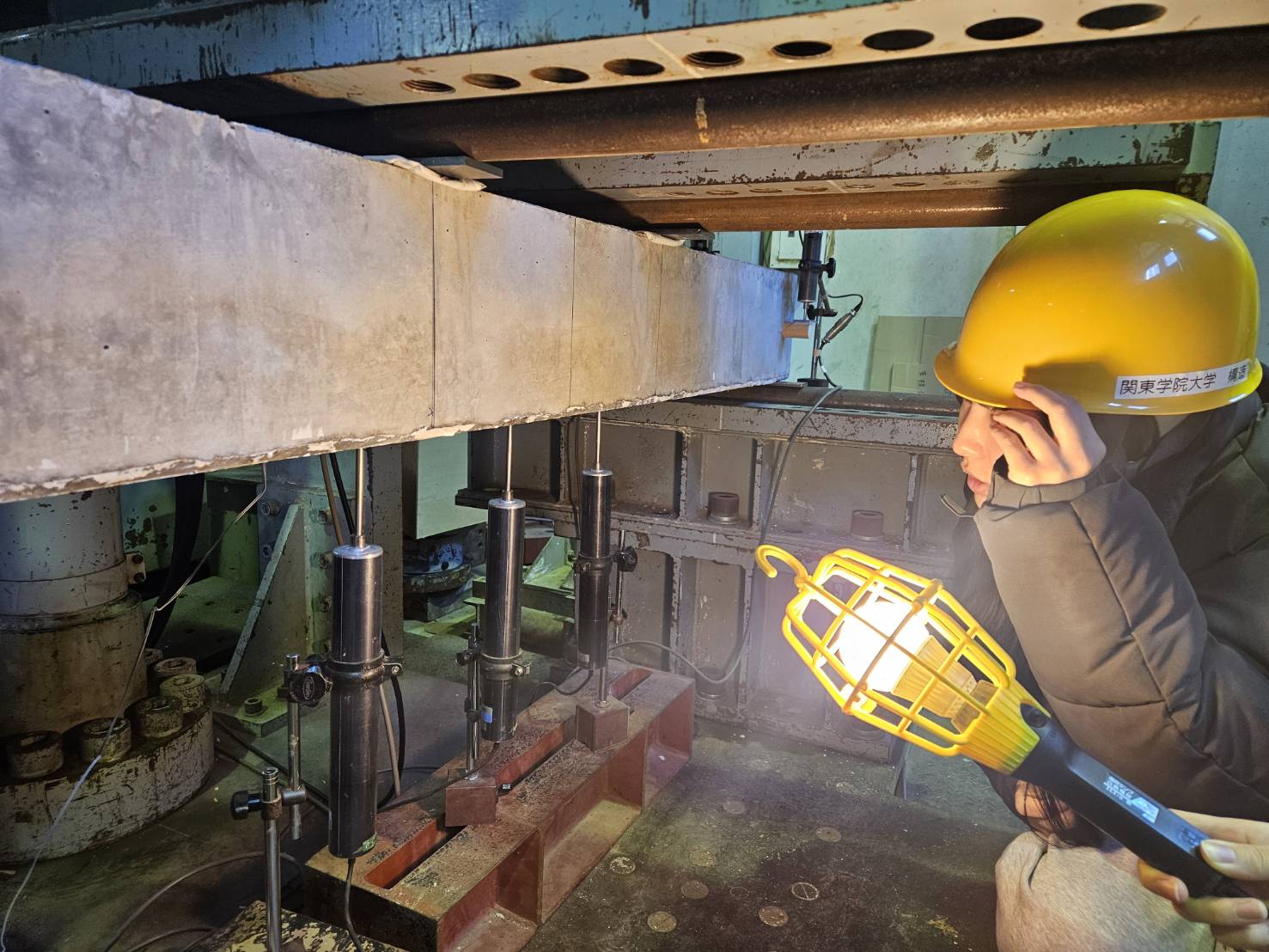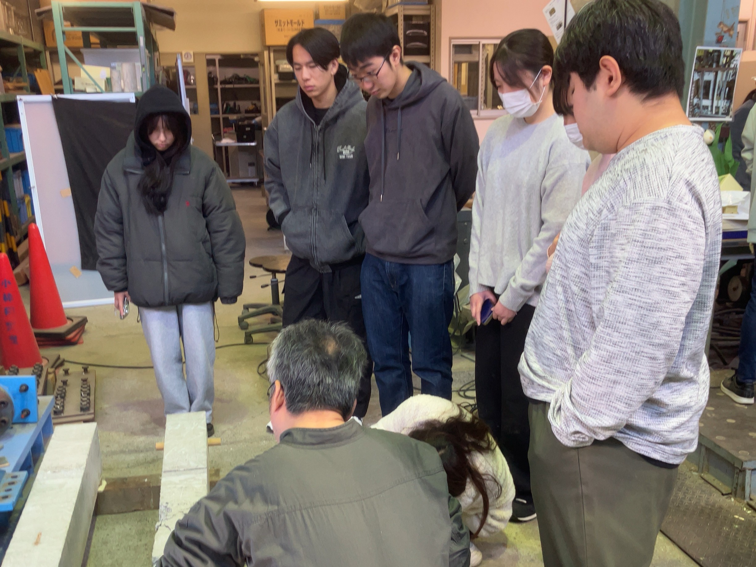 2025年12月5日、EF-109室にて第10回建築構造実験の講義が行われました。今回の建築構造実験では前回の講義で行った鉄筋コンクリート(RC)造梁のせん断実験に引き続き、RC造梁の曲げ実験及びコンクリート供試体圧縮・割裂引張試験を行いました。