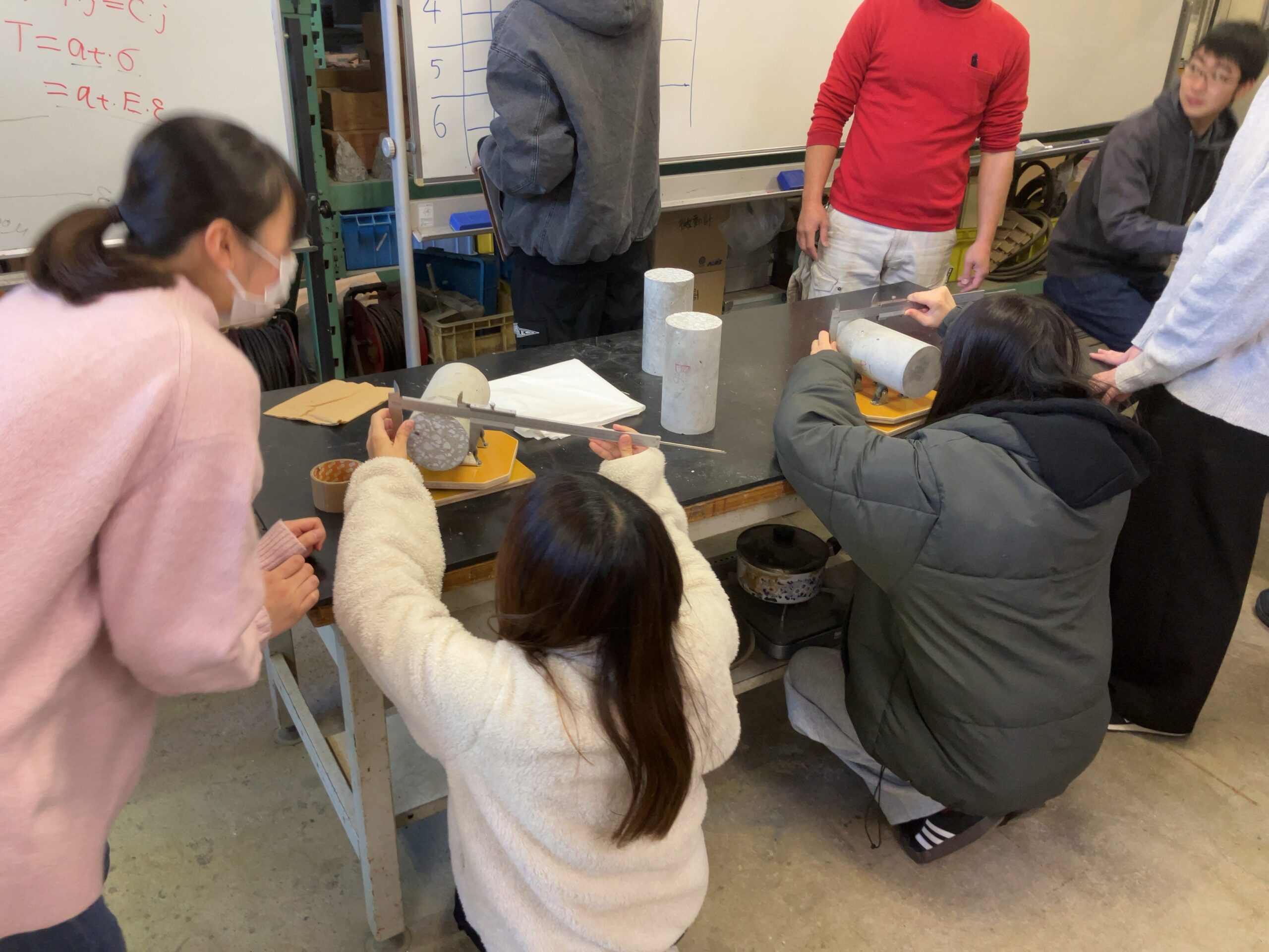 RC造梁と同じ材齢で同じ材料のコンクリート円柱供試体の寸法および質量の測定を行い、圧縮試験と割裂引張試験を実施しました。その後、学生たちは圧縮および割裂によって生じた供試体の破壊状況を観察し、記録しました。