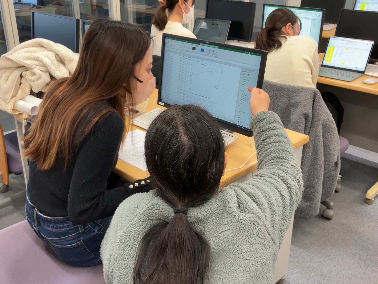 次に学生はエクセルを使用し、先生たちに質問しながら実際に取得したデータを用いてグラフの作成を行いました。