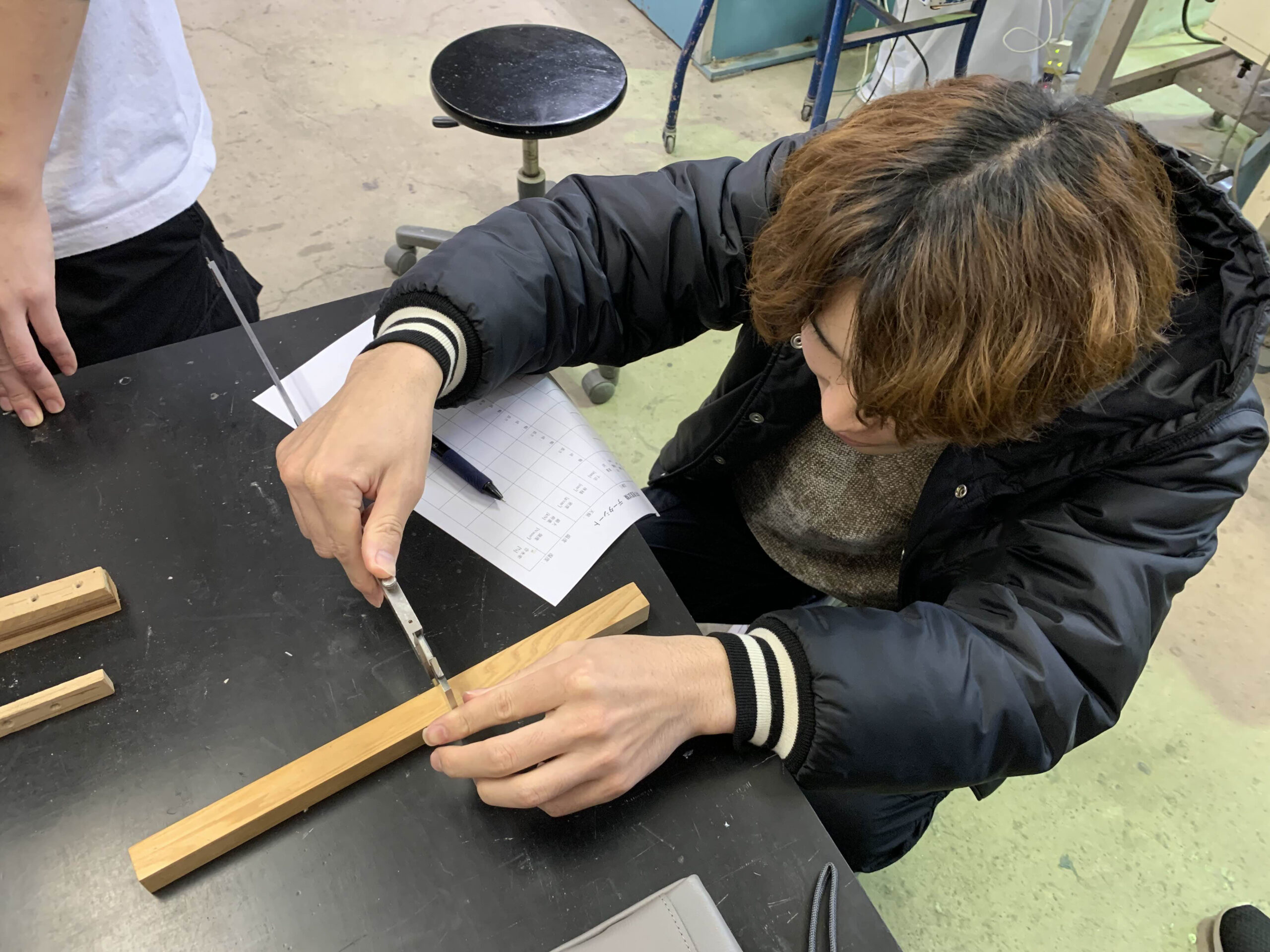 今回の試験では、杉と松の2つの樹種を用いて、引張試験、圧縮試験、曲げ試験を行うため各試験体の質量と寸法を測定しました。