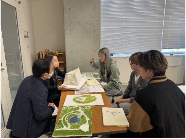 先週の中間発表から模型やパース、コンセプトも進化していました。模型の作り方や、パースで表現する場所など、積極的に質問をする学生も見られました。表現を工夫することで見え方も変わるので、手を動かして試してみましょう。また、4枚のパースにはキャプションを付けて、どの部分を描いたのか明確にしましょう。